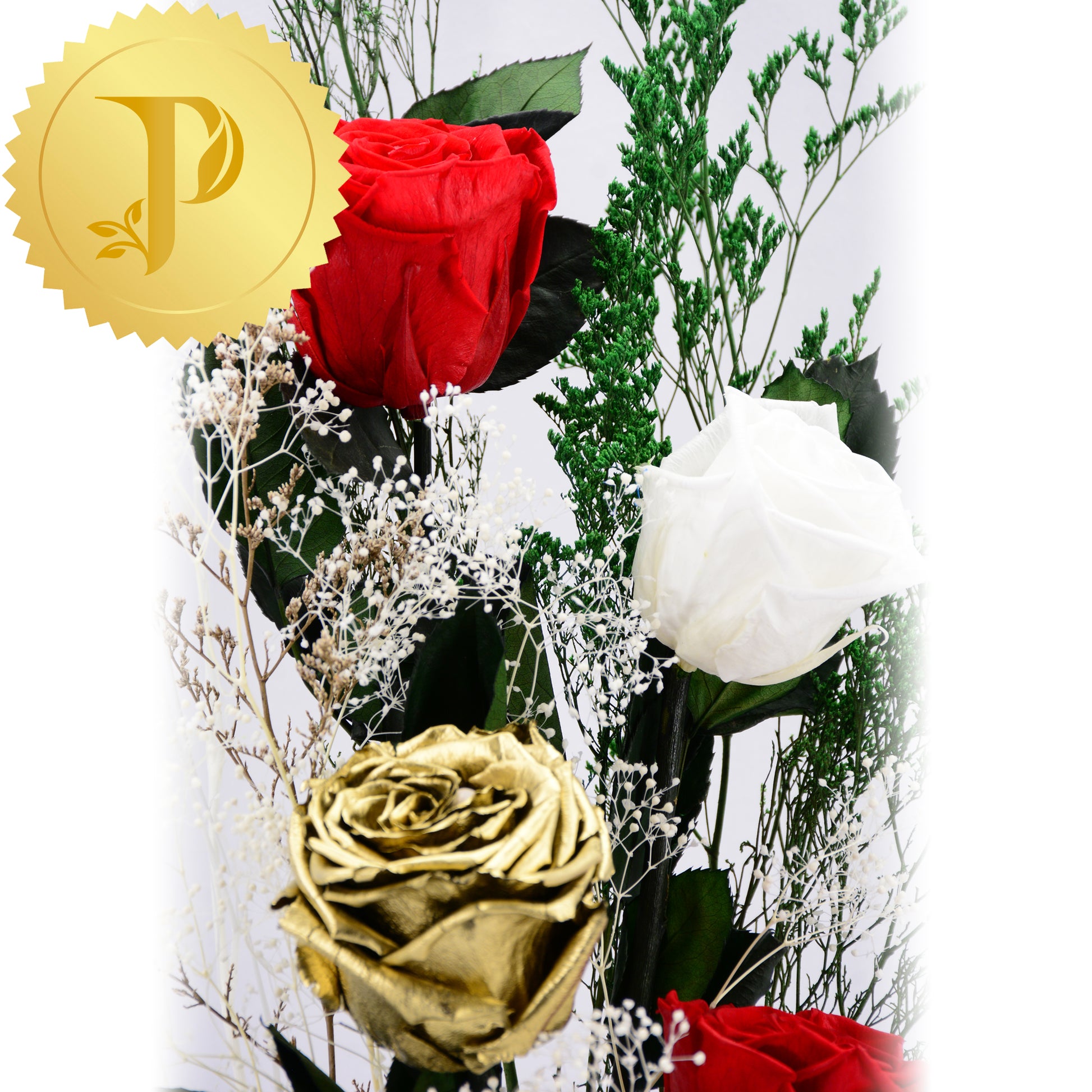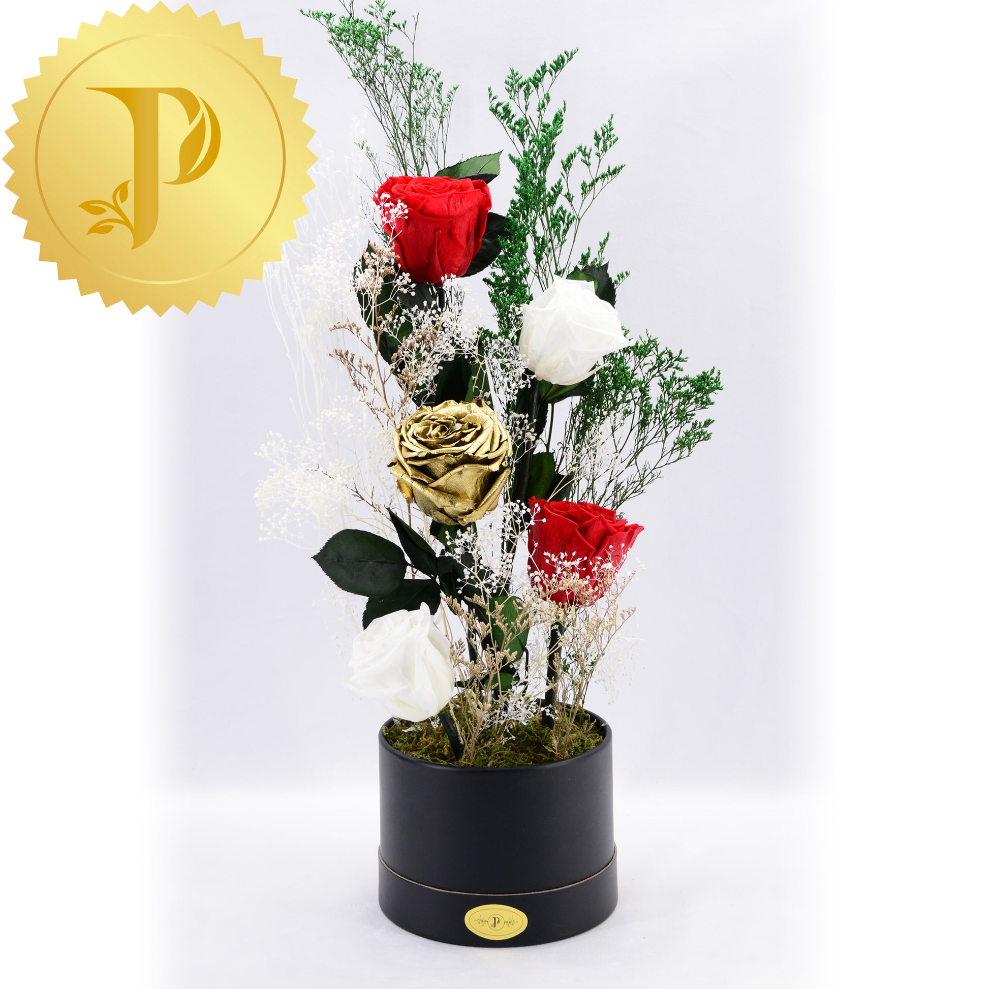 Bring joy to the holidays with this touch of gold grouping of five roses of red, white and gold, accented with selected preserved filler. The arrangement is placed in a small round white box, adorned with preserved moss to give a more realistic effect.