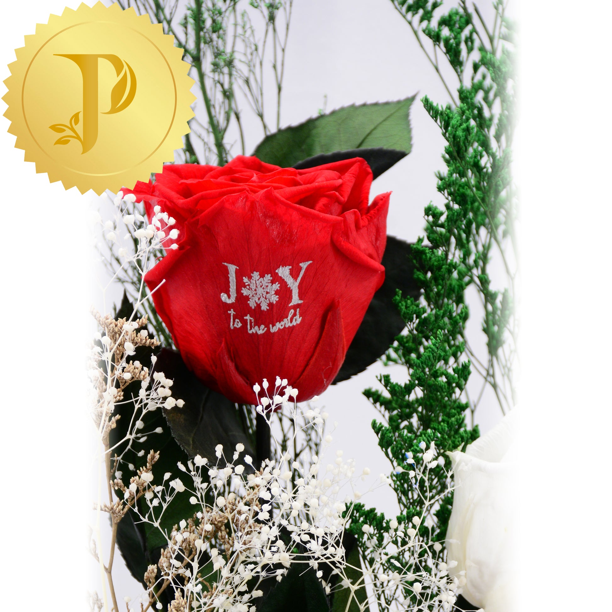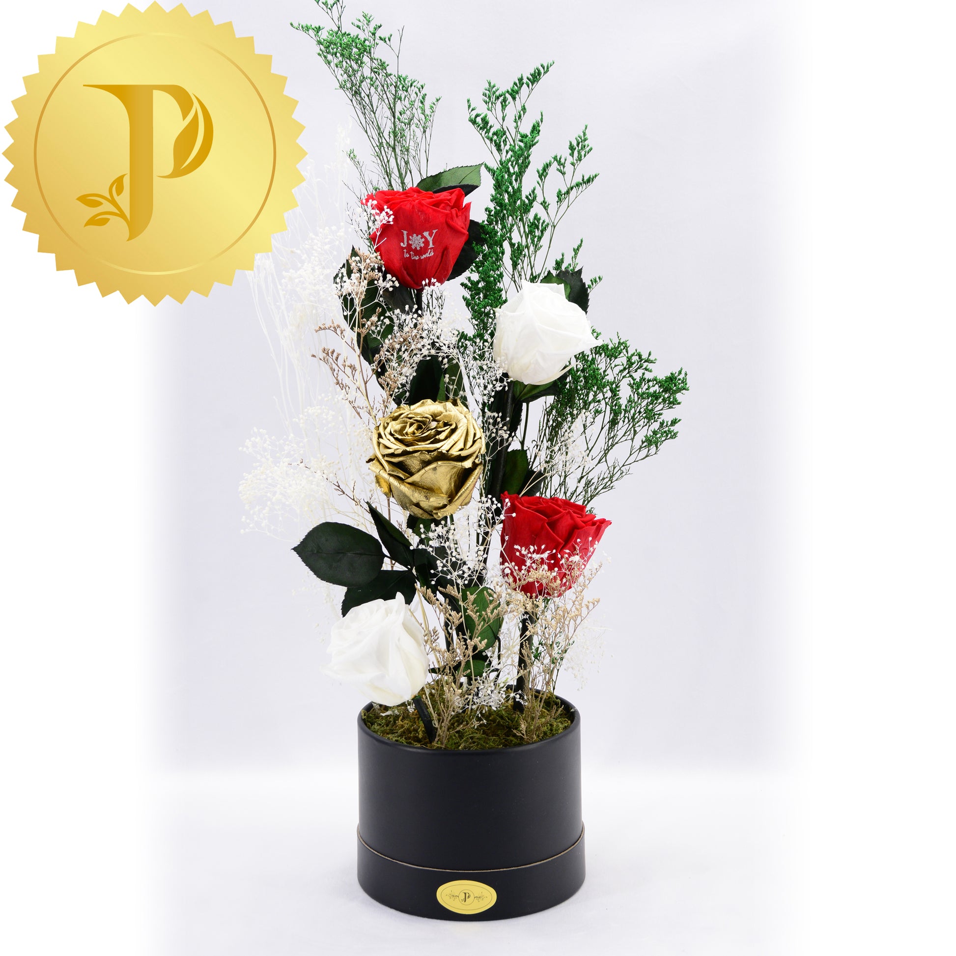 An artistic grouping of five assorted holiday-coloured roses of red, white and gold, accented with selected preserved filler. The arrangement is placed in a small round white box, adorned with preserved moss to give a more realistic effect.