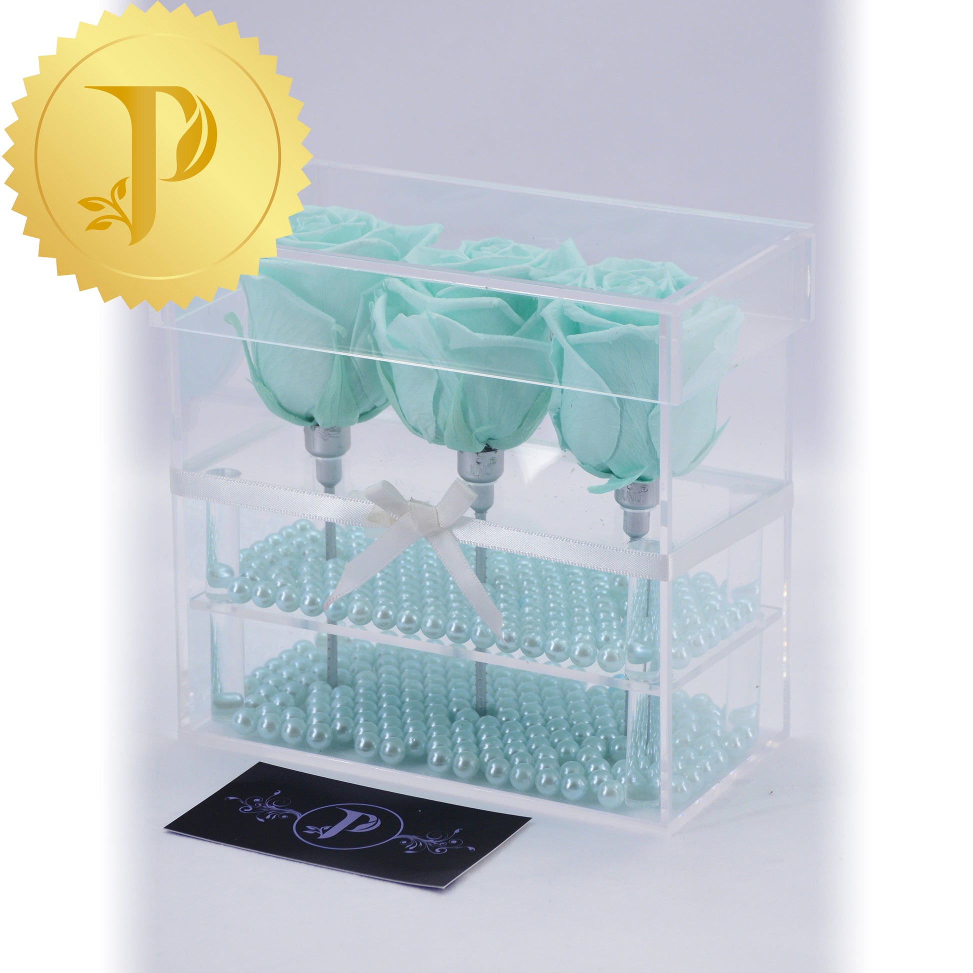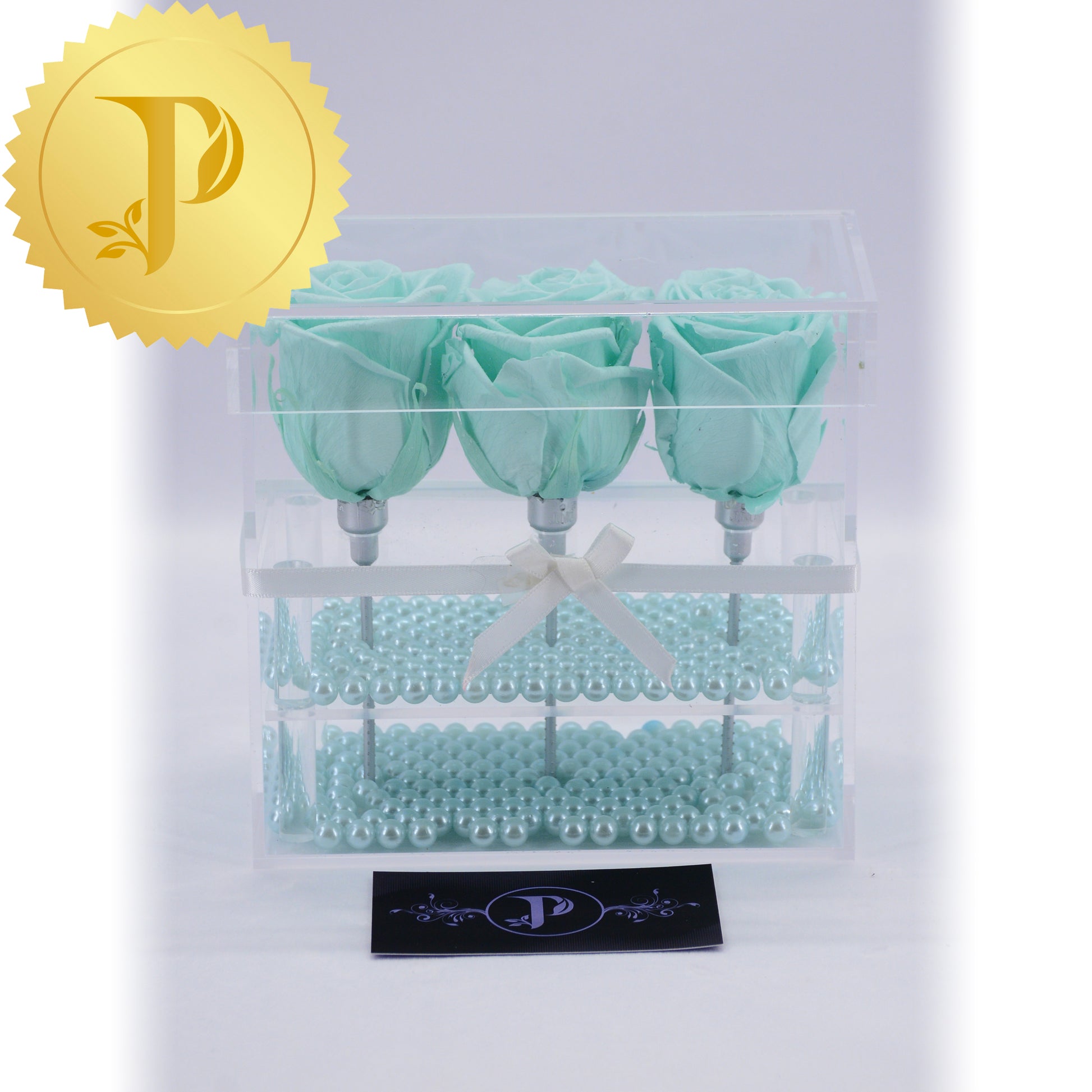 Arrangements in acrylic are available either with a drawer or tall with stems and no drawer. All arrangements come with a layer of your choice of either matching faux pearls, natural stones (lapis lazuli), crystals (clear and rose quartz) or crushed glass (gold). The drawers can be filled with either Ferrero Rocher or Baci chocolates. Acrylic boxes will be highlighted with a white ribbon.
