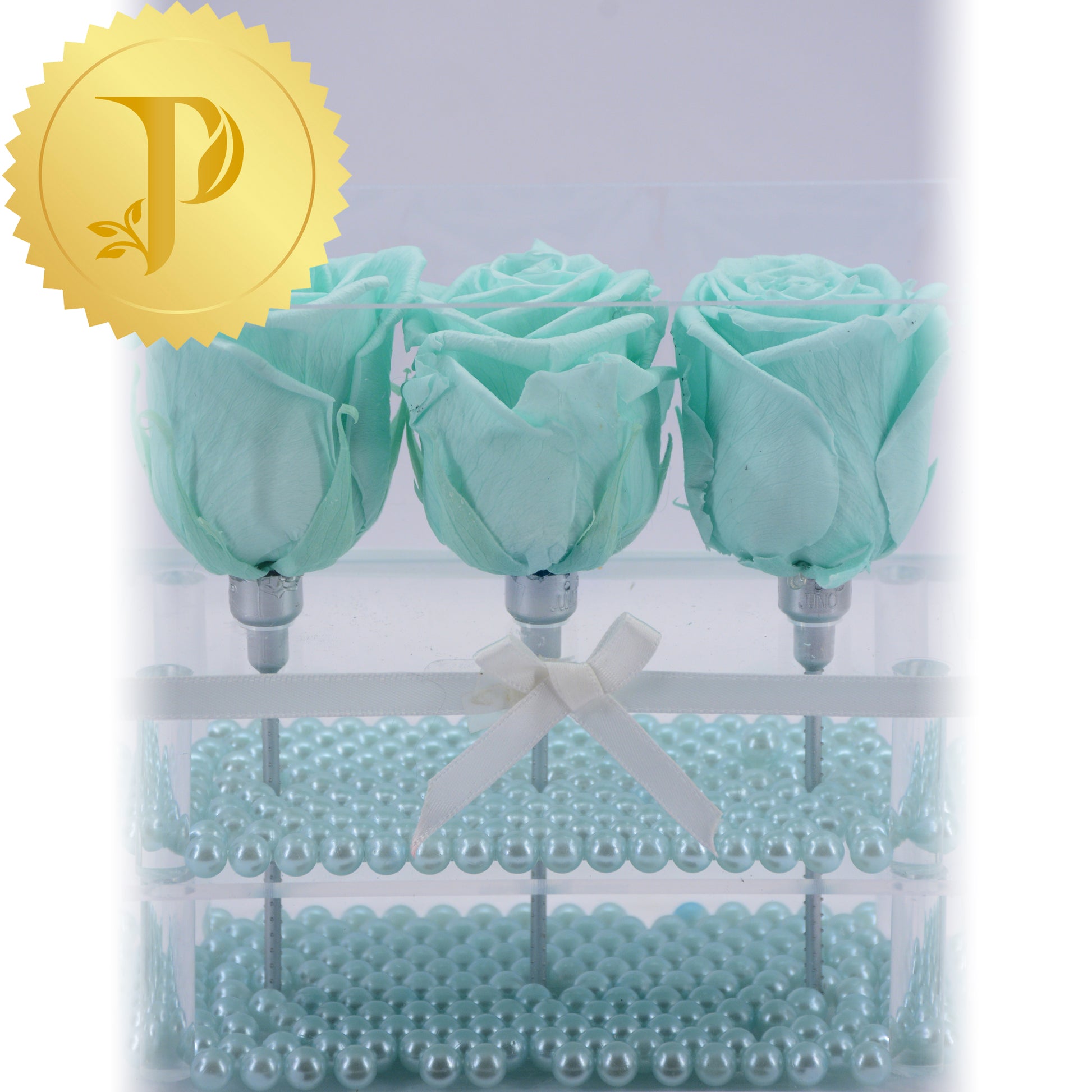 This tall rose trio in acrylic with calming aqua-coloured roses are placed on a faux silver stem complemented by two layers of matching faux aqua pearls.