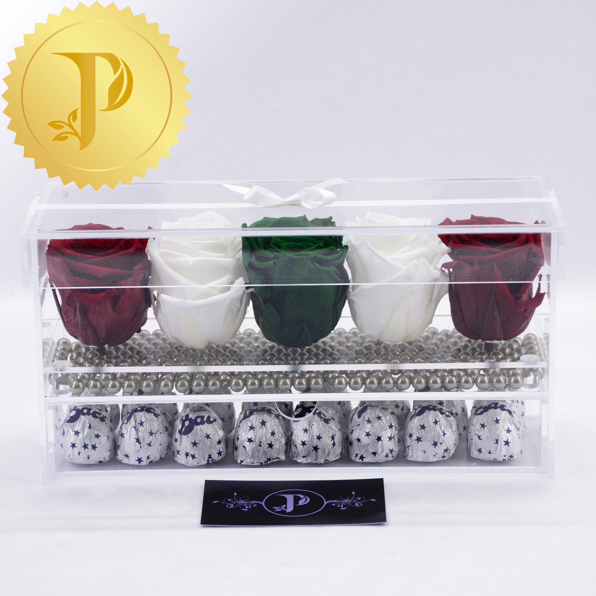 These holiday colours look lovely all year round and are a nice addition to any room. This five rose gift set is complemented by a layer of faux silver pearls and a drawer filled with Baci chocolates.