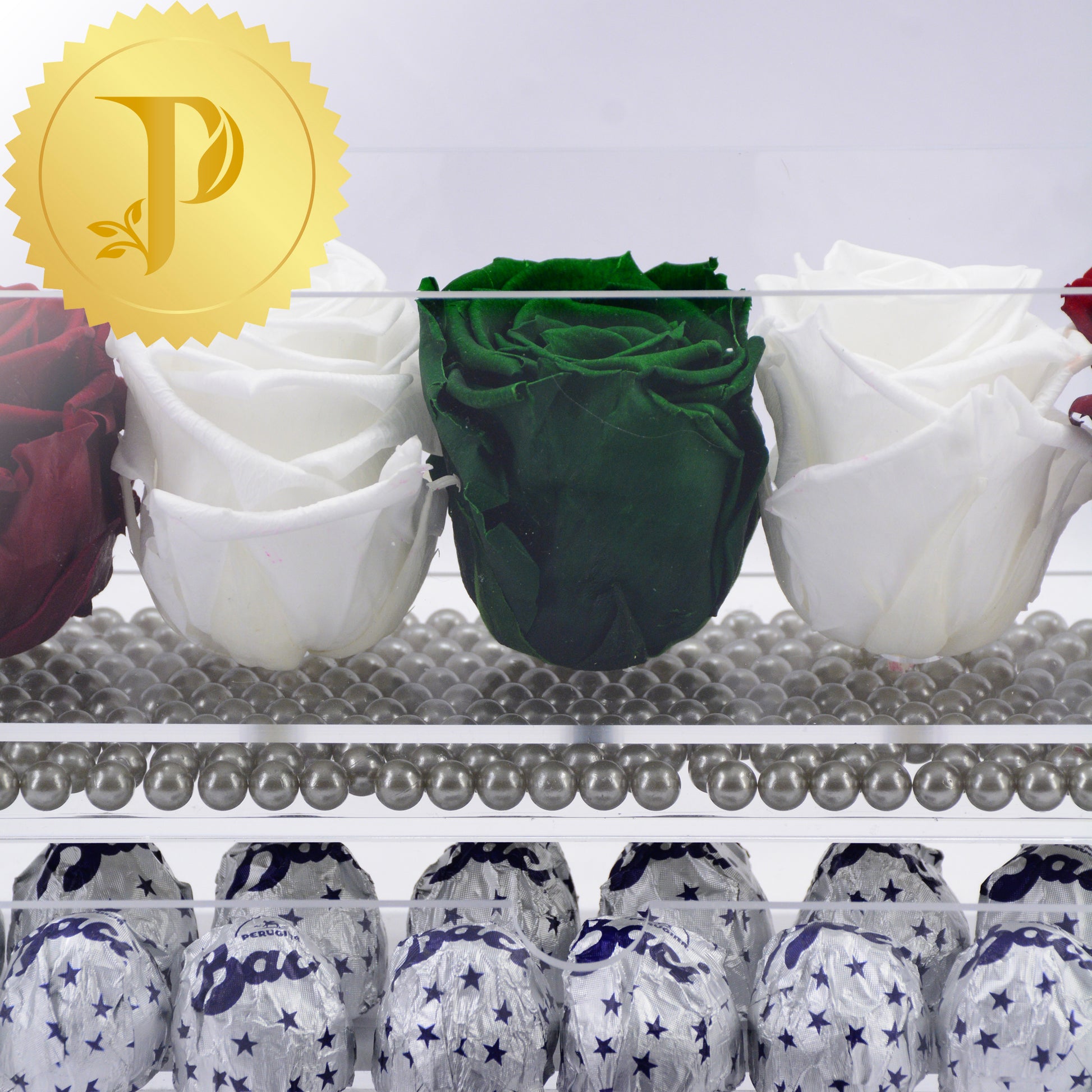 All arrangements come with a layer of either matching faux pearls, natural stones (lapis lazuli), crystals (clear and rose quartz) or crushed glass (gold coloured). Faux stems are either green, gold or silver coloured. The drawers are filled with either Ferrero Rocher or Baci chocolates. Acrylic boxes will be highlighted with a white ribbon.