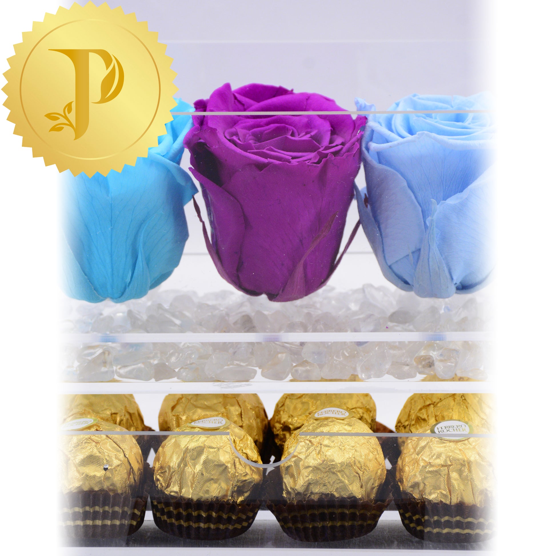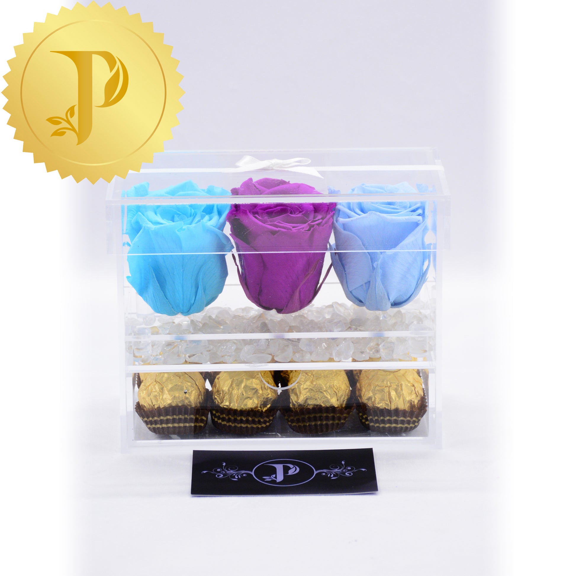 Close companions of blue and purple roses rest in an acrylic box complemented by a layer of clear quartz and a drawer filled with Ferrero Rocher chocolates. Clear quartz is known for energizing one’s mental clarity and healing properties.