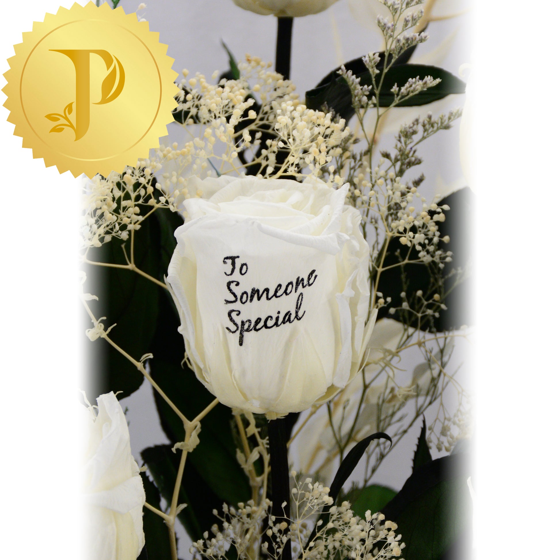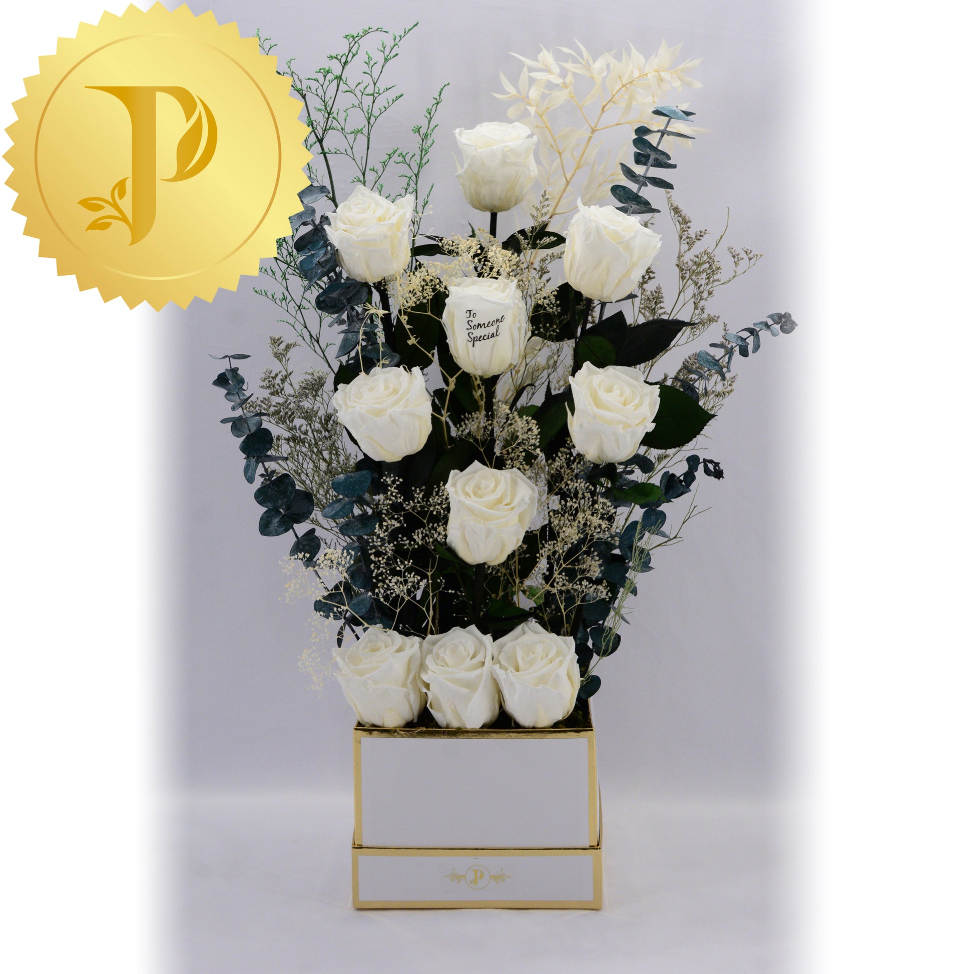 The purity and simplicity of ten creamy white roses elegantly designed and placed in a square white gold trimmed box, with a variety of selected filler to enhance its’ beauty. An expressive tribute for a special occasion that will complement any décor at home or at the workplace.