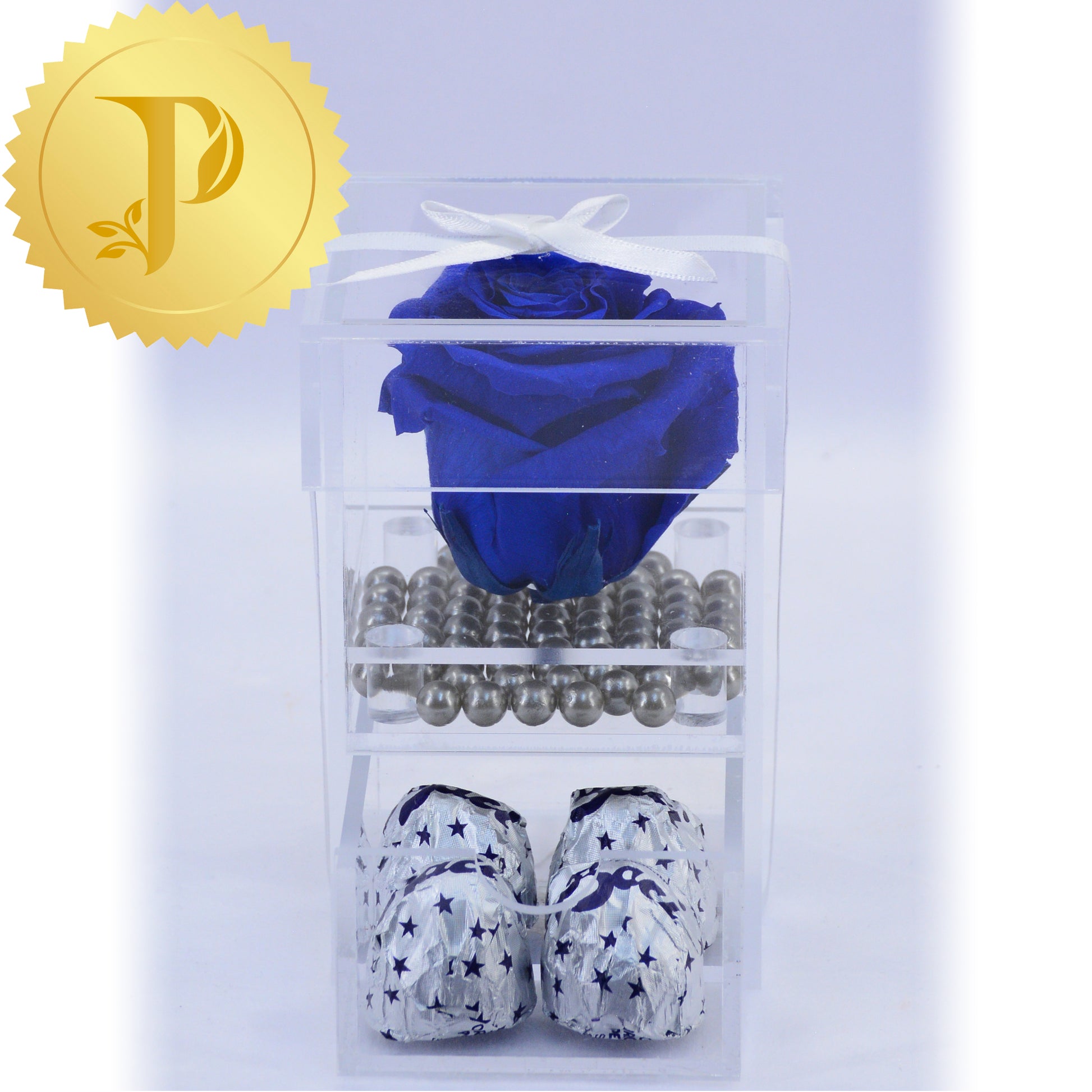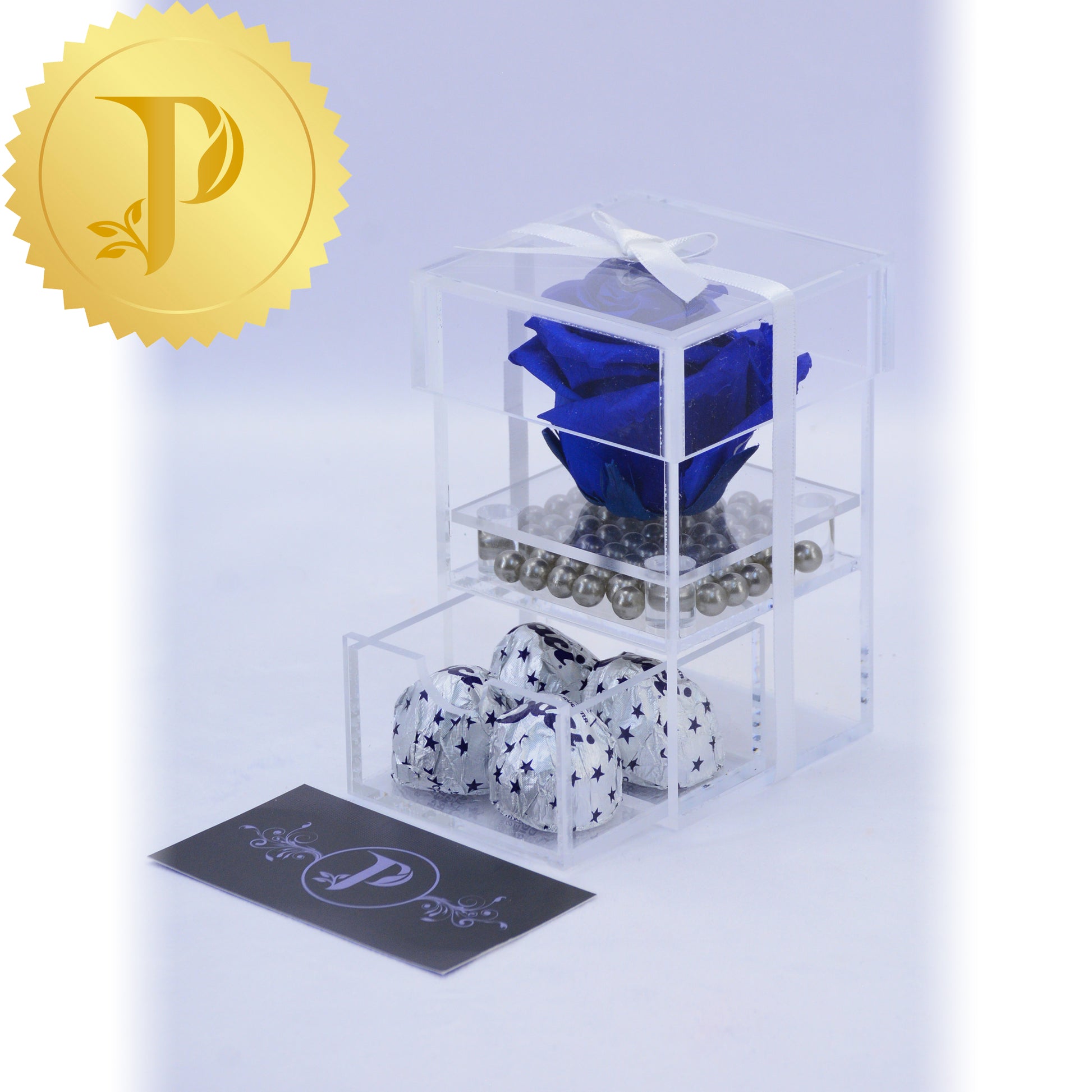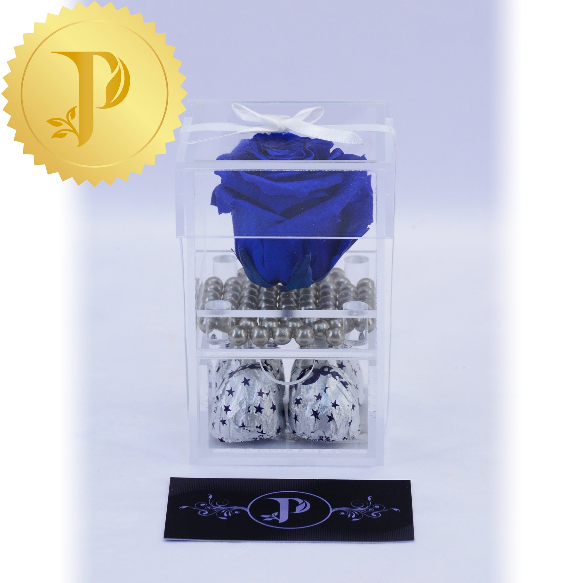 Ring in your attention to this small and striking royal blue rose in an acrylic box with a drawer to hold your sweets.