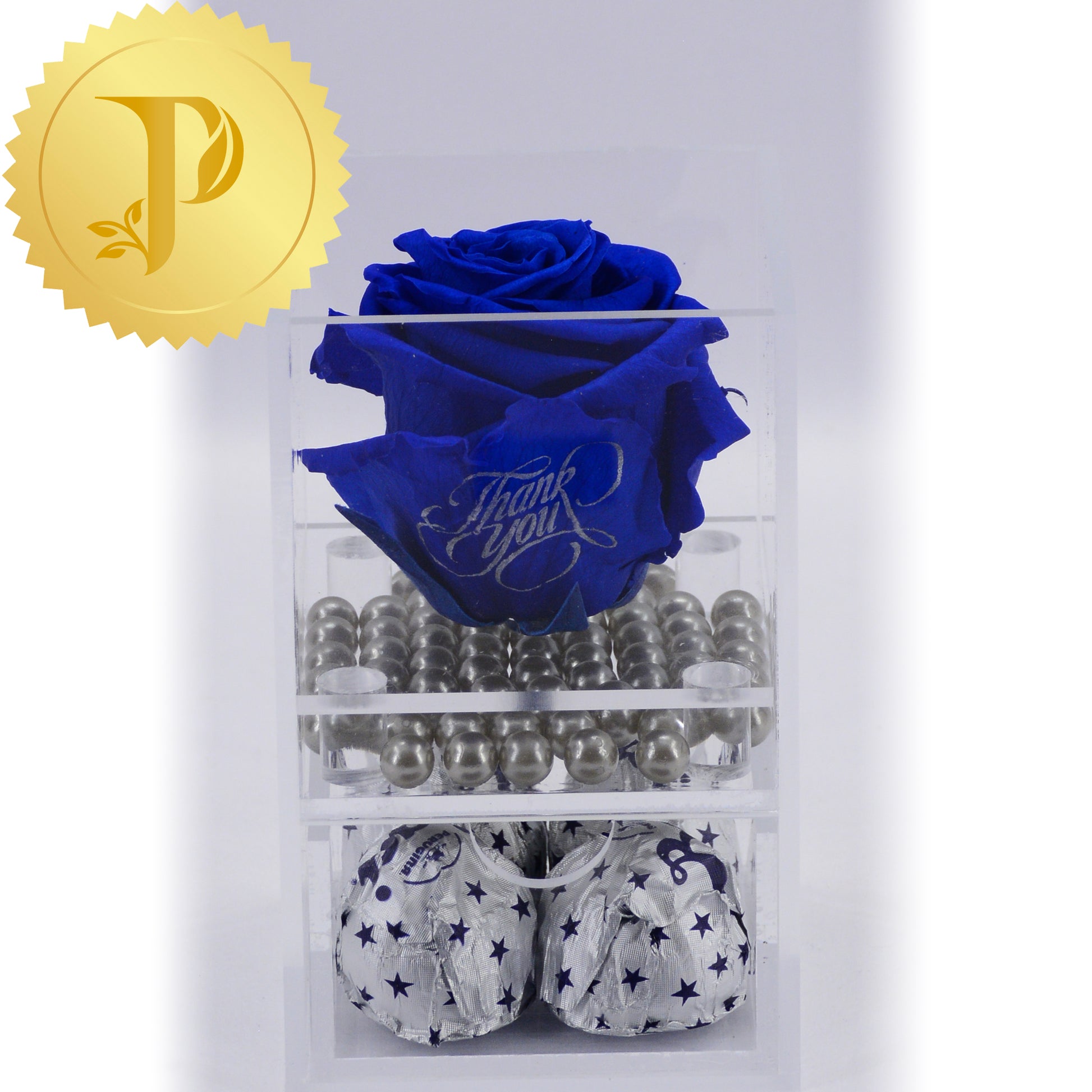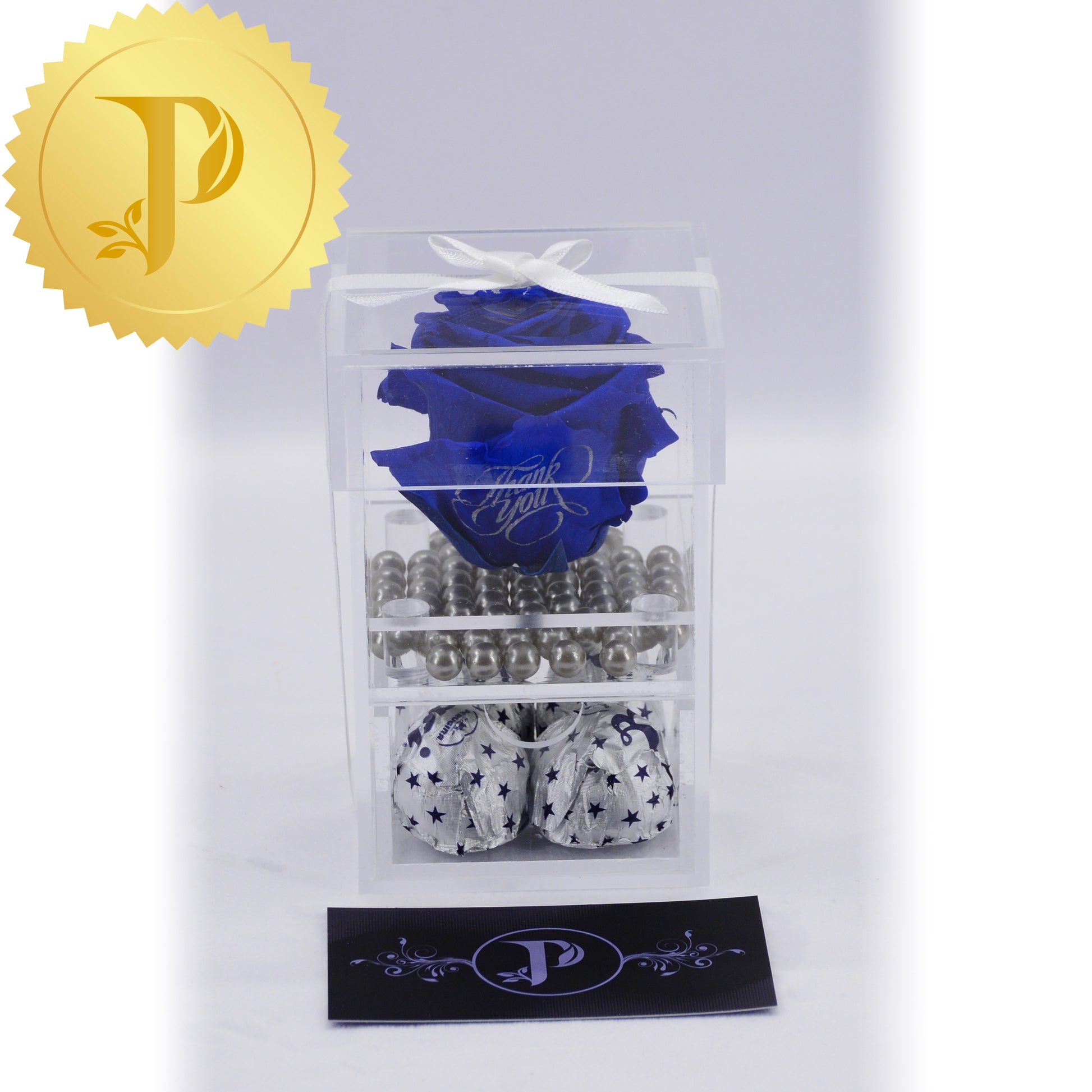 Arrangements in acrylic are available either with a drawer or tall with stems and no drawer. All arrangements come with a layer of your choice of either matching faux pearls, natural stones (lapis lazuli), crystals (clear and rose quartz) or crushed glass (gold). The drawers can be filled with either Ferrero Rocher or Baci chocolates. Acrylic boxes will be highlighted with a white ribbon.