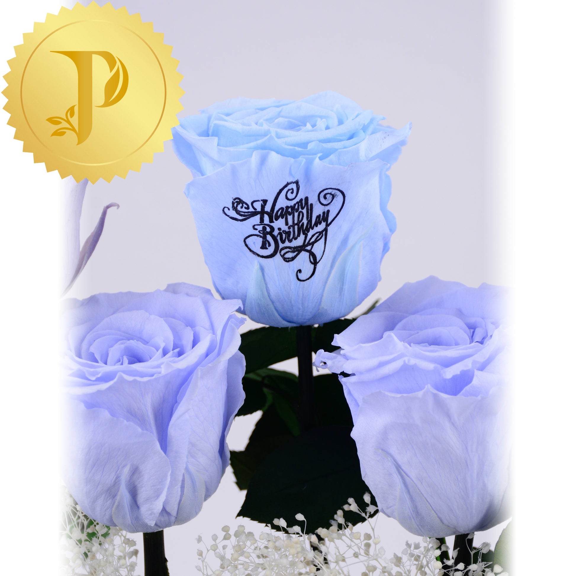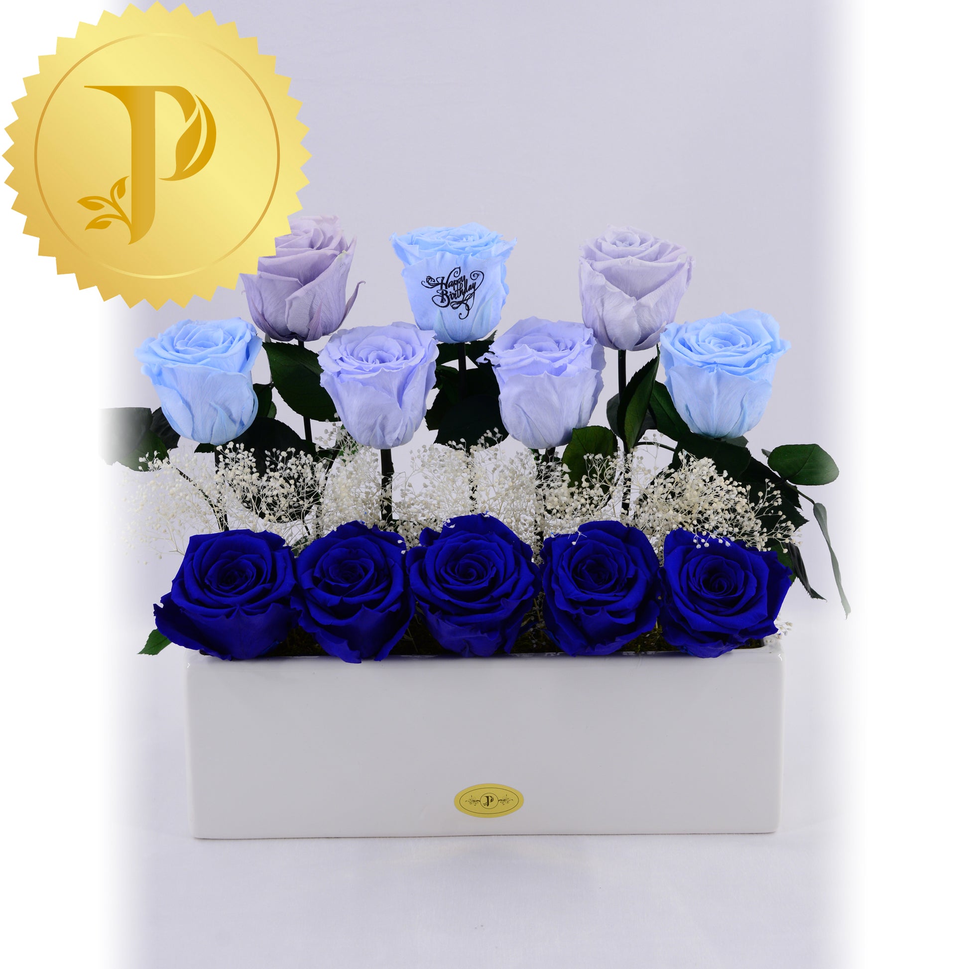 Bring in the charm of the outside in this petite indoor planter with shades of calming blues and lavender coloured roses all in a line. This charming arrangement showcases a dozen different roses with lacy white gypsophila. A base row of royal blue roses is used to accentuate the other cool pastel colours. Our roses are placed in a white ceramic planter adorned with preserved moss used to give a more realistic effect.