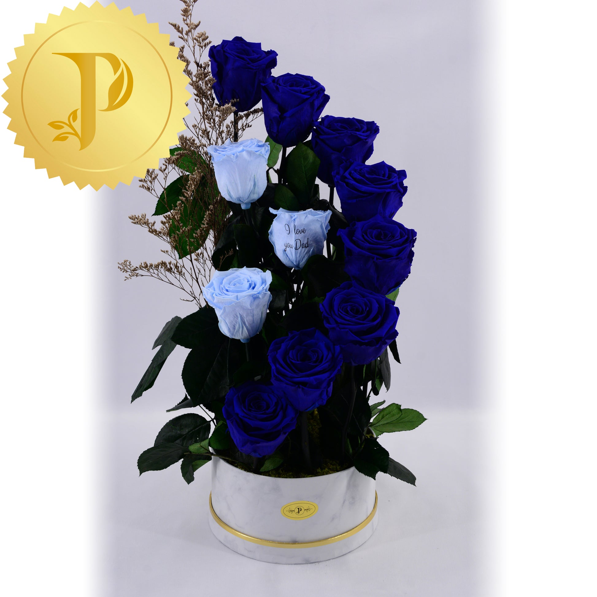 A graceful curl formed by this serene and tranquil colour combination of eight royal blue and three light blue coloured roses nesting inside. The elegance of this arrangement is enhanced with our marble patterned container. Its artistic nature draws the attention of any audience and for any occasion.