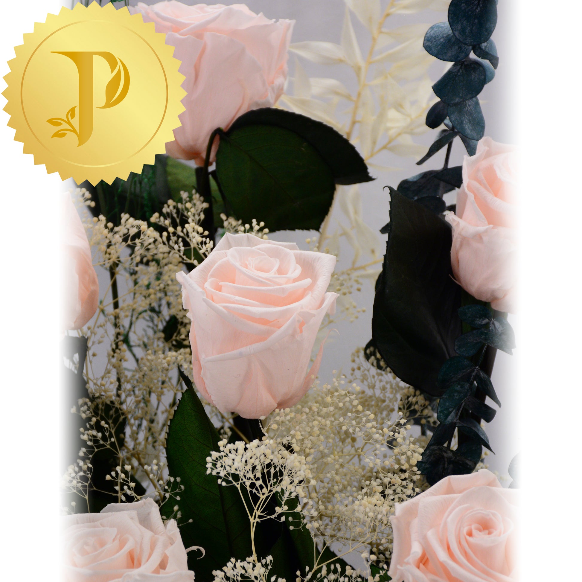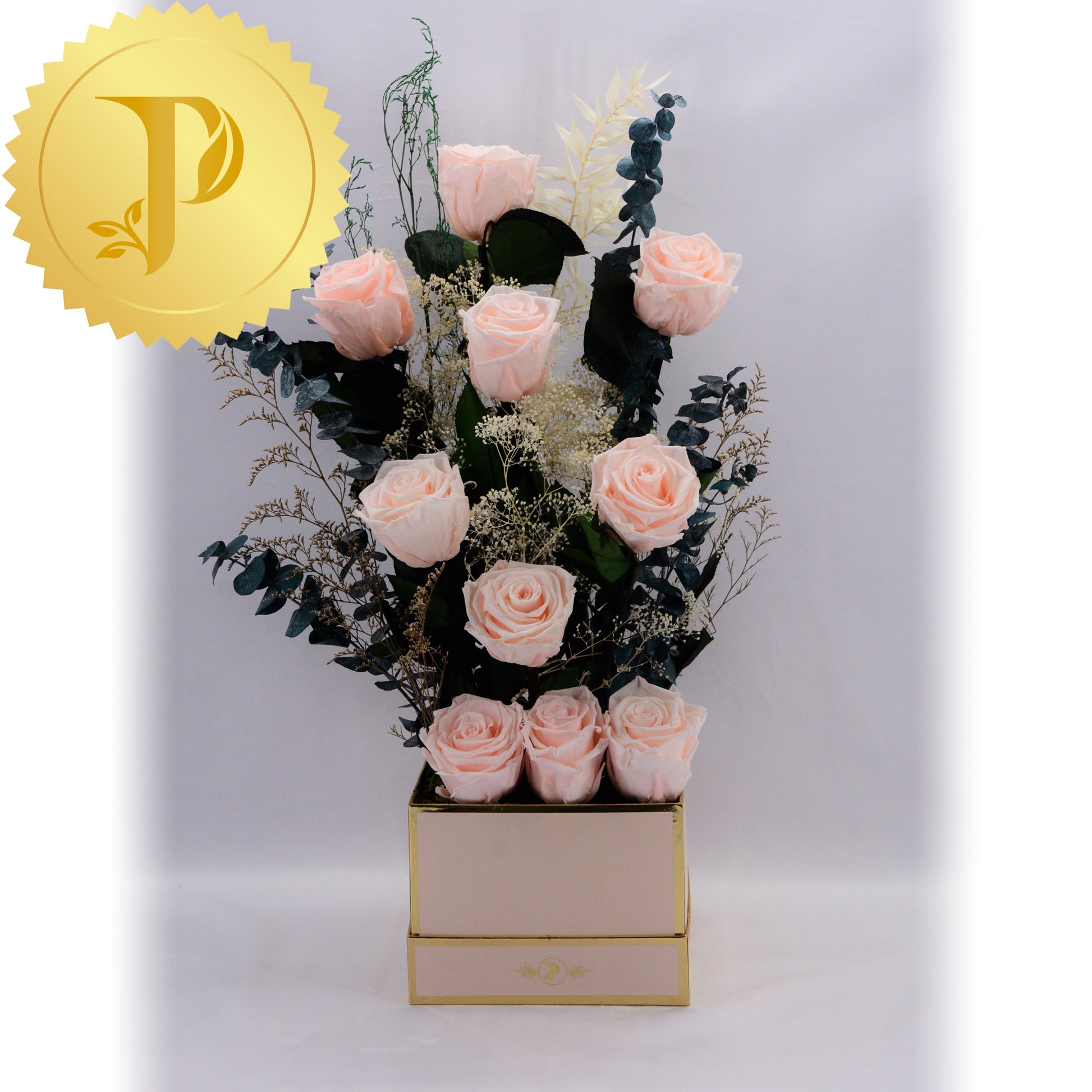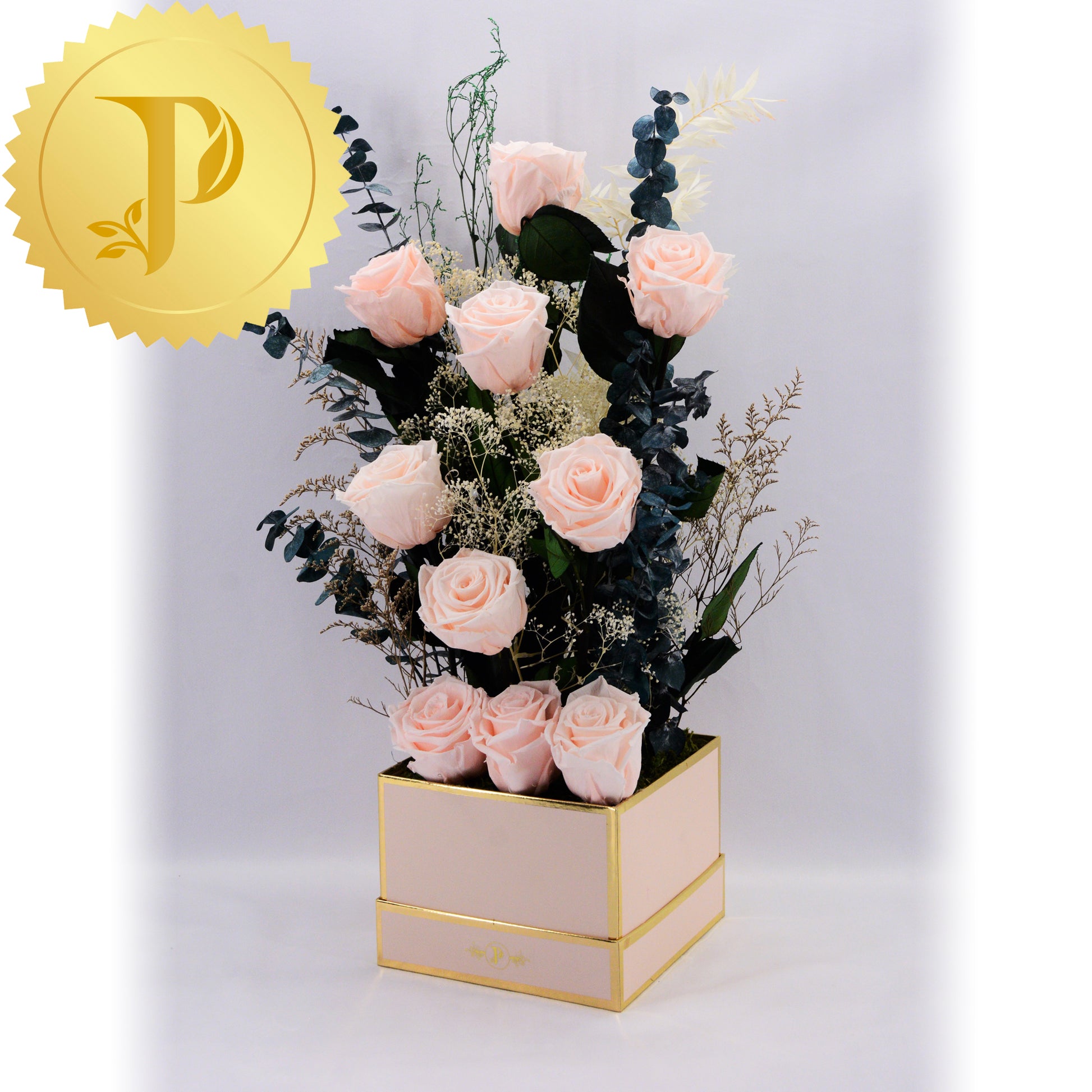A lovely arrangement of ten delicate blush roses elegantly designed and placed in a square gold trimmed box, with a variety of selected filler to enhance its’ beauty. An expressive tribute for a special occasion.