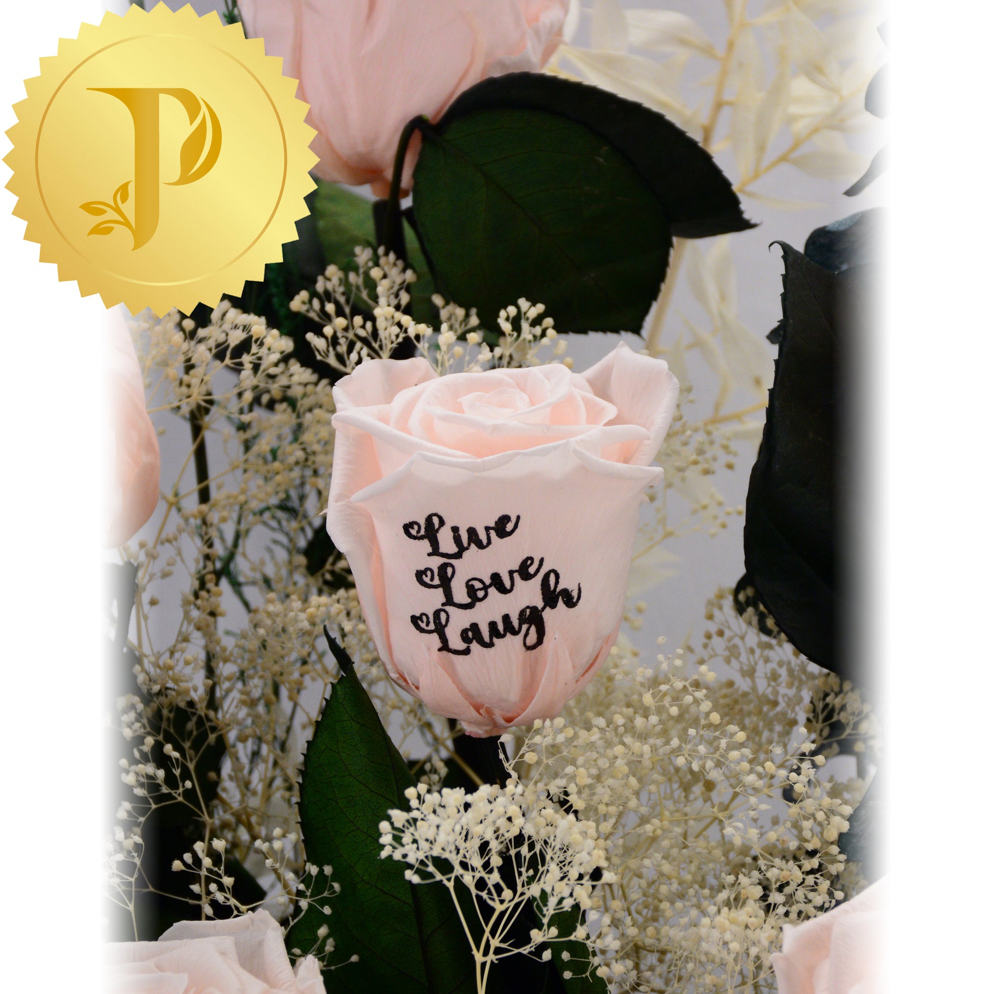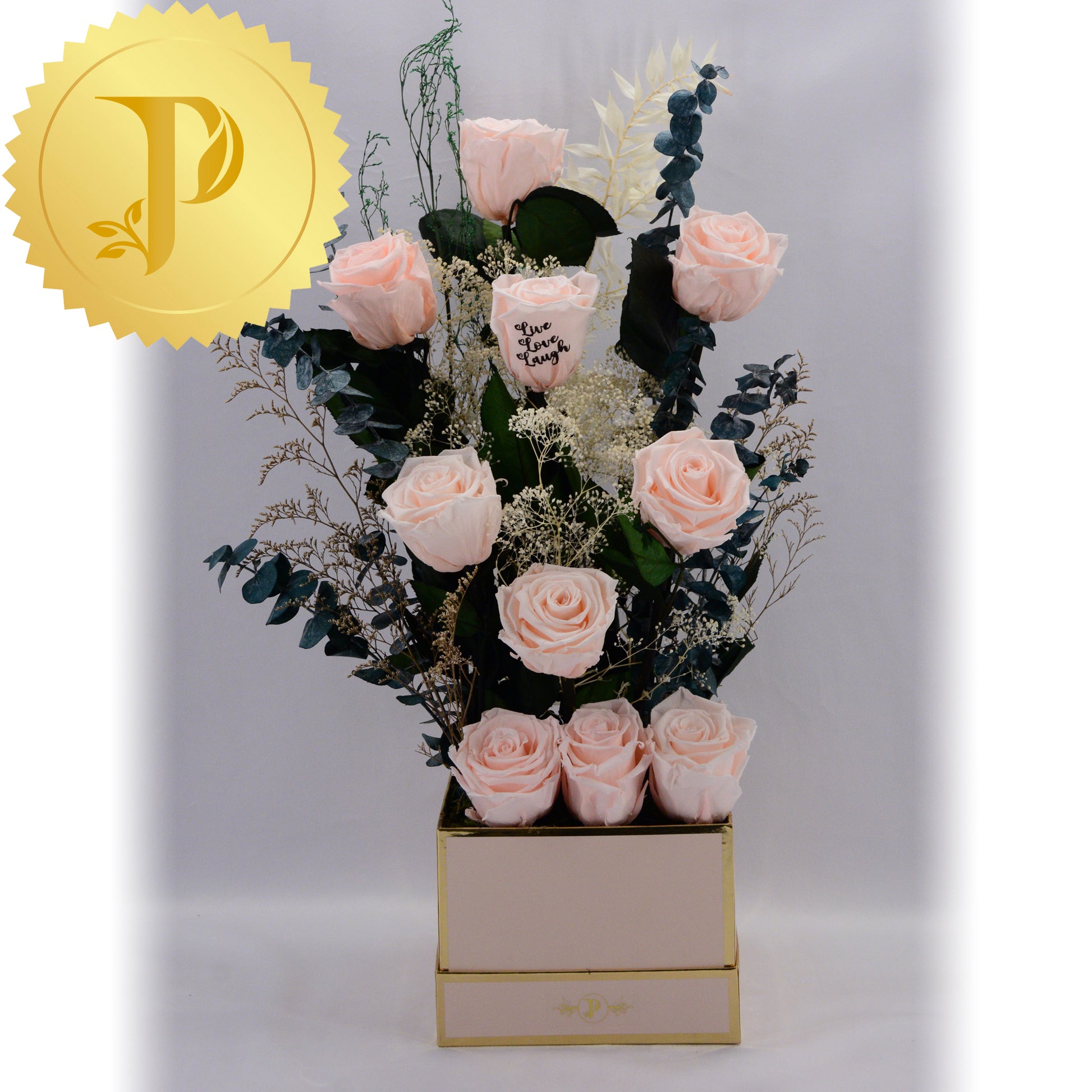 A lovely arrangement of ten delicate blush roses elegantly designed and placed in a square white gold trimmed box, with a variety of selected filler to enhance its’ beauty. An expressive tribute for a special occasion that will complement any décor at home or at the workplace.