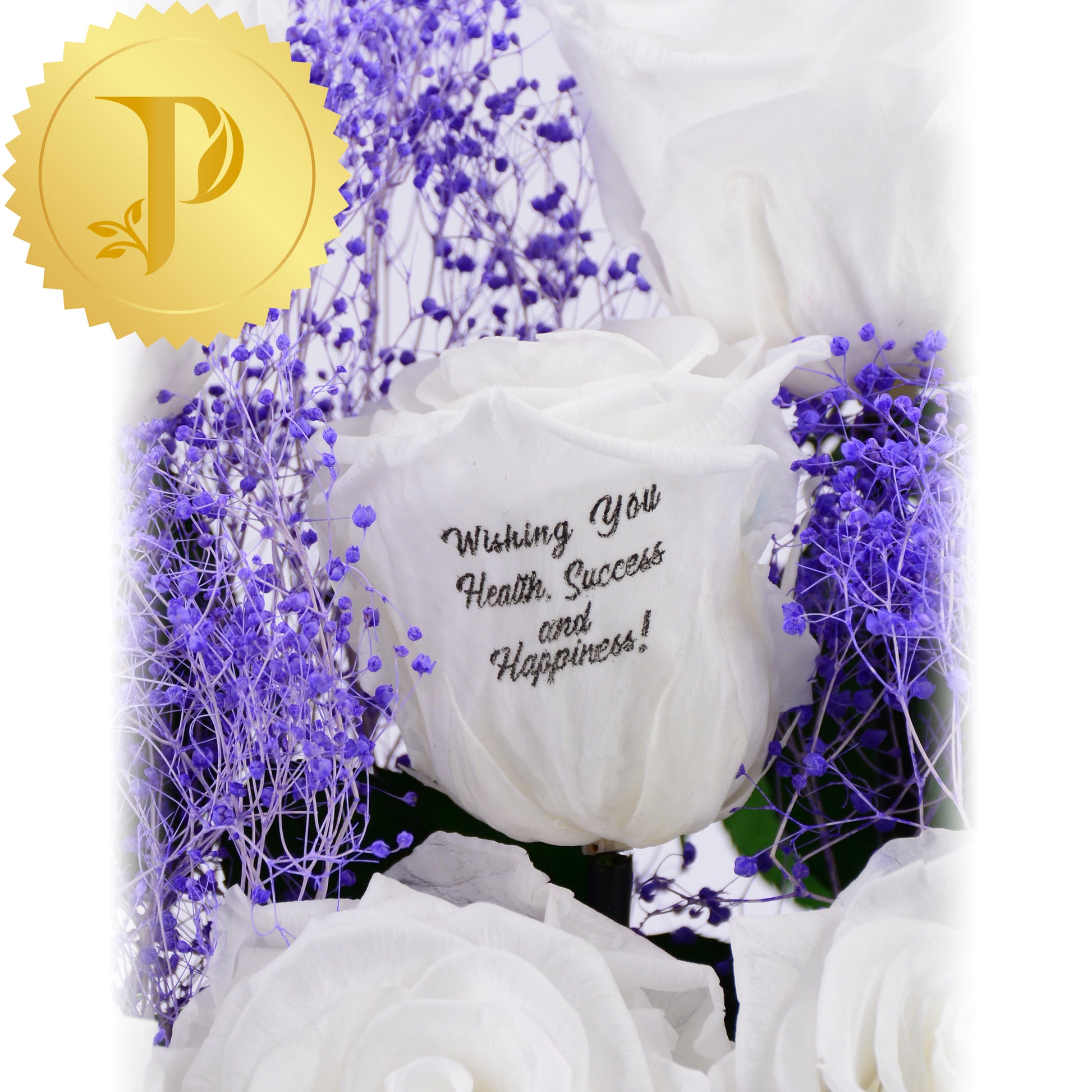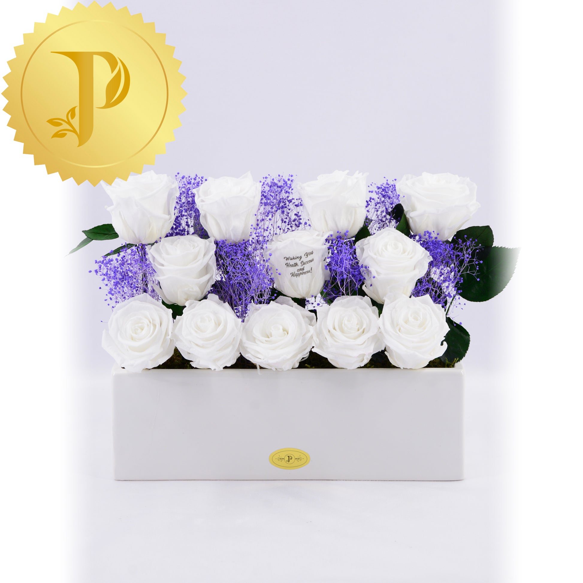 This is an endearing arrangement of a dozen bright white roses highlighted with purple patches of gypsophila. A white ceramic planter adorned with preserved moss is used to give a more realistic effect.