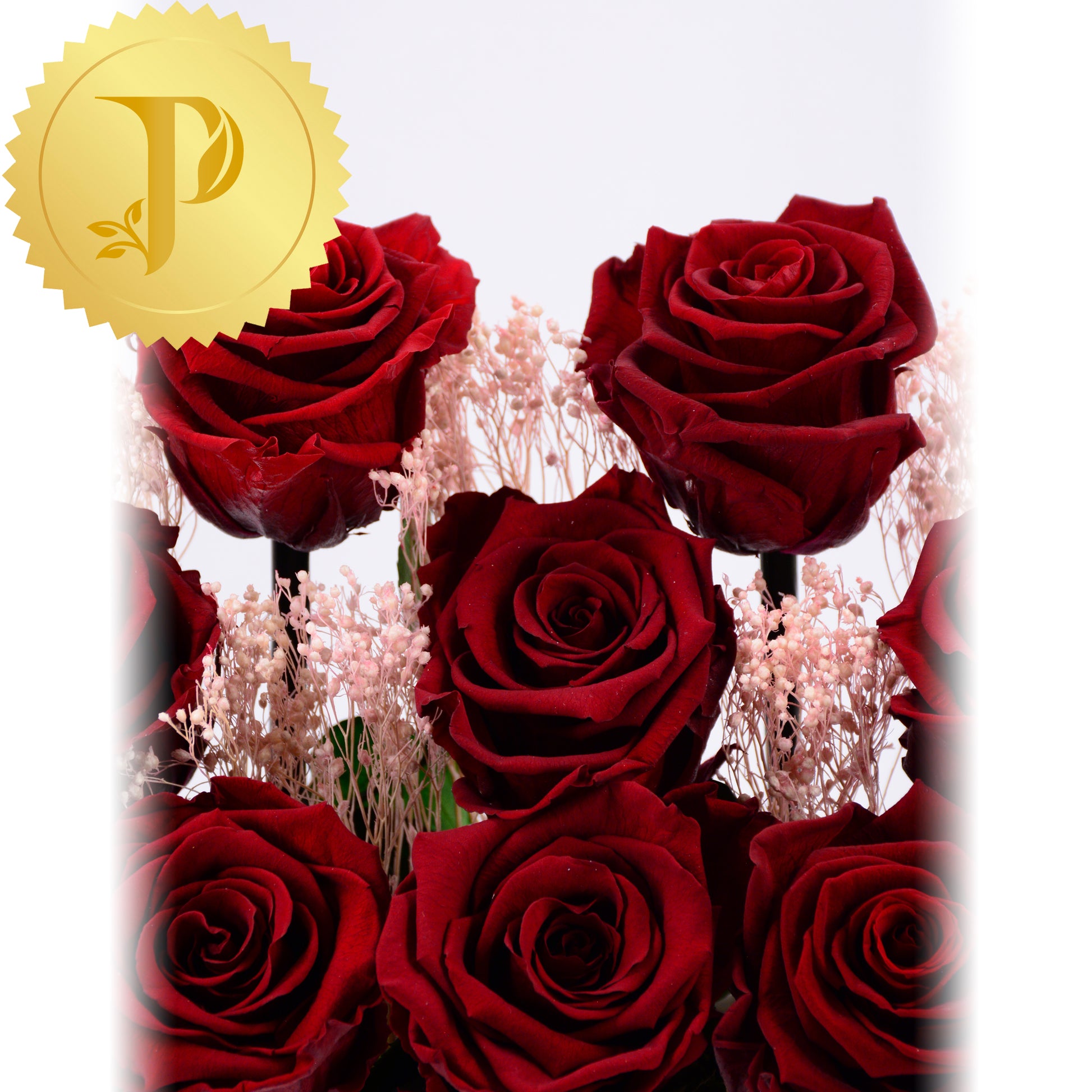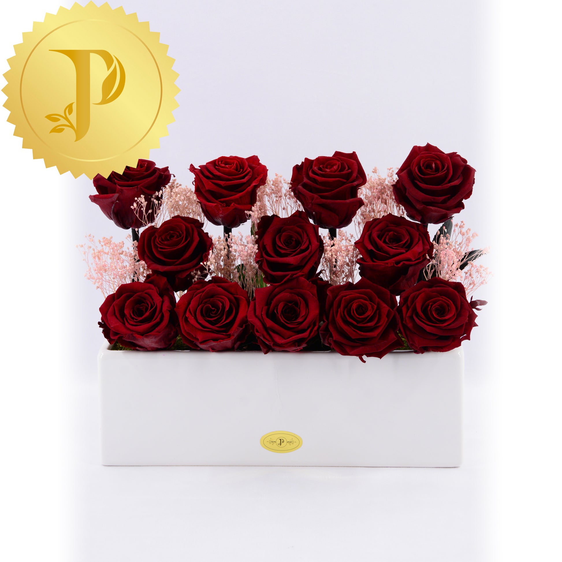 This is an endearing arrangement of a dozen deep burgundy roses highlighted with pink patches of gypsophila. A white ceramic planter adorned with preserved moss is used to give a more realistic effect.