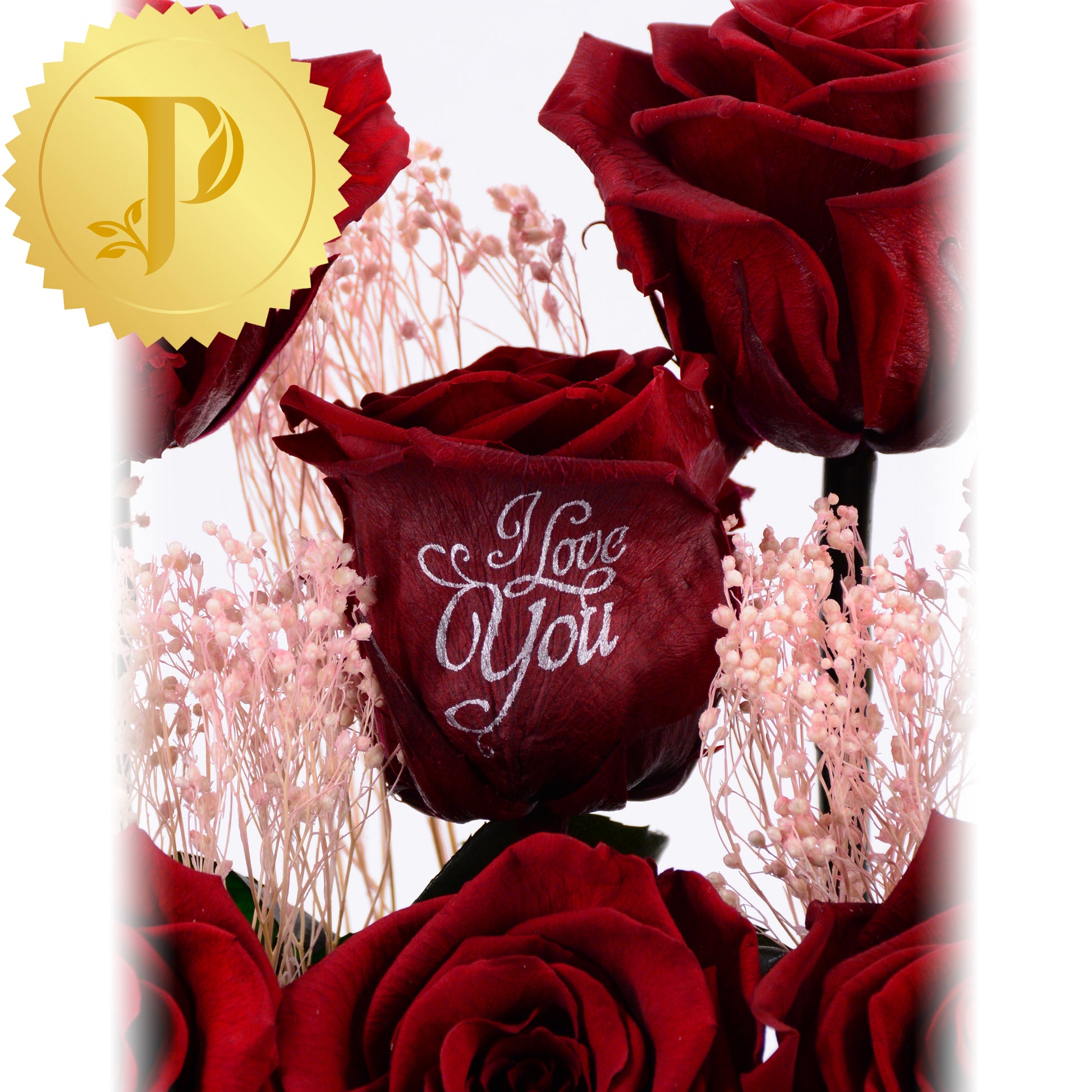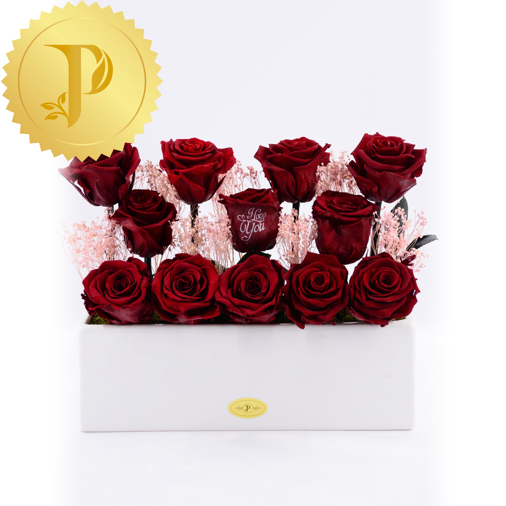 This is an endearing arrangement of a dozen burgundy roses highlighted with pink patches of gypsophila. A white ceramic planter adorned with preserved moss is used to give a more realistic effect.
