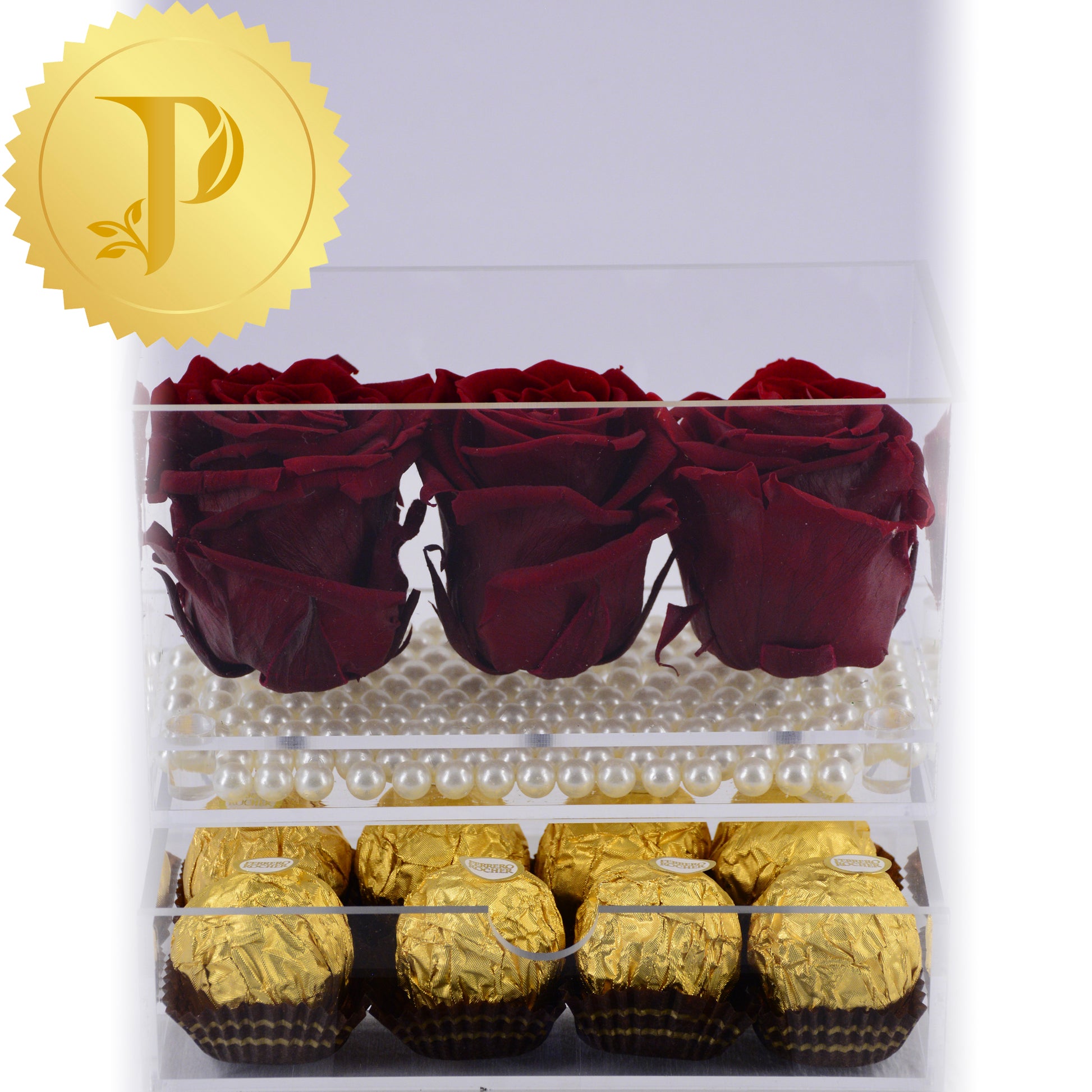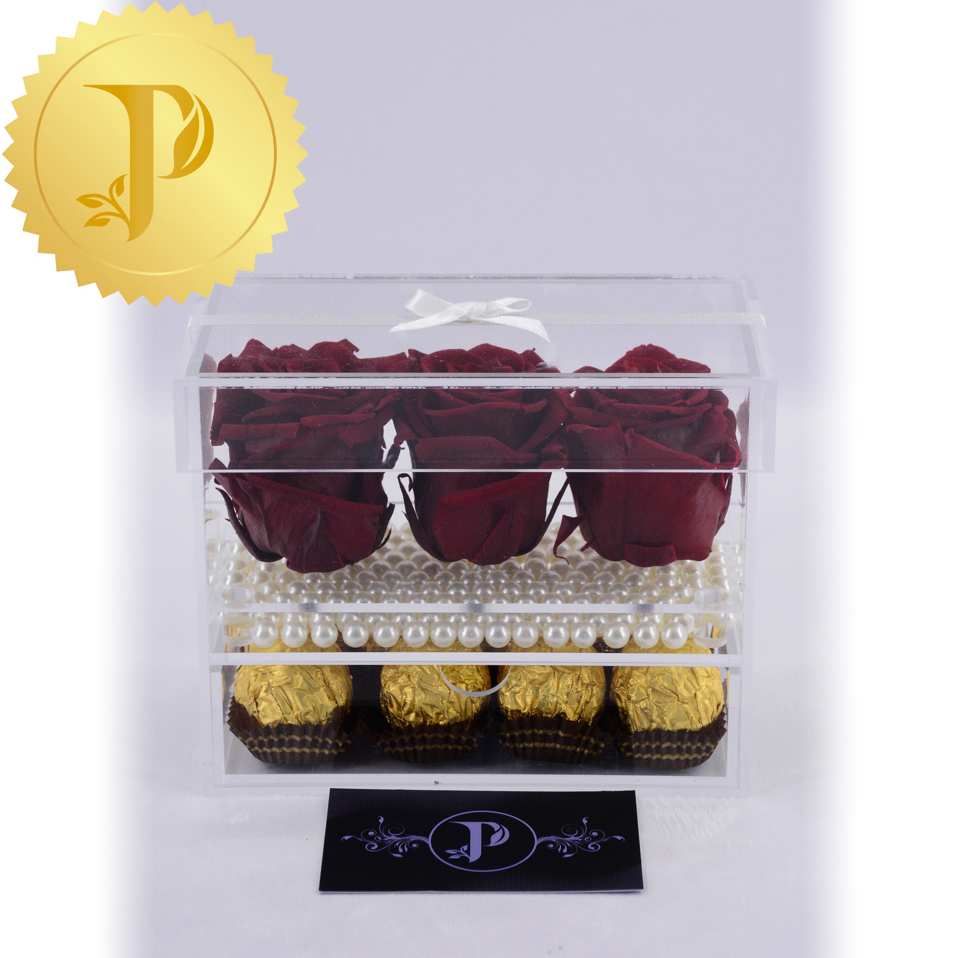This rose trio in acrylic with burgundy-coloured roses are complemented by a layer of faux pink pearls and a drawer filled with Ferrero Rocher chocolates.