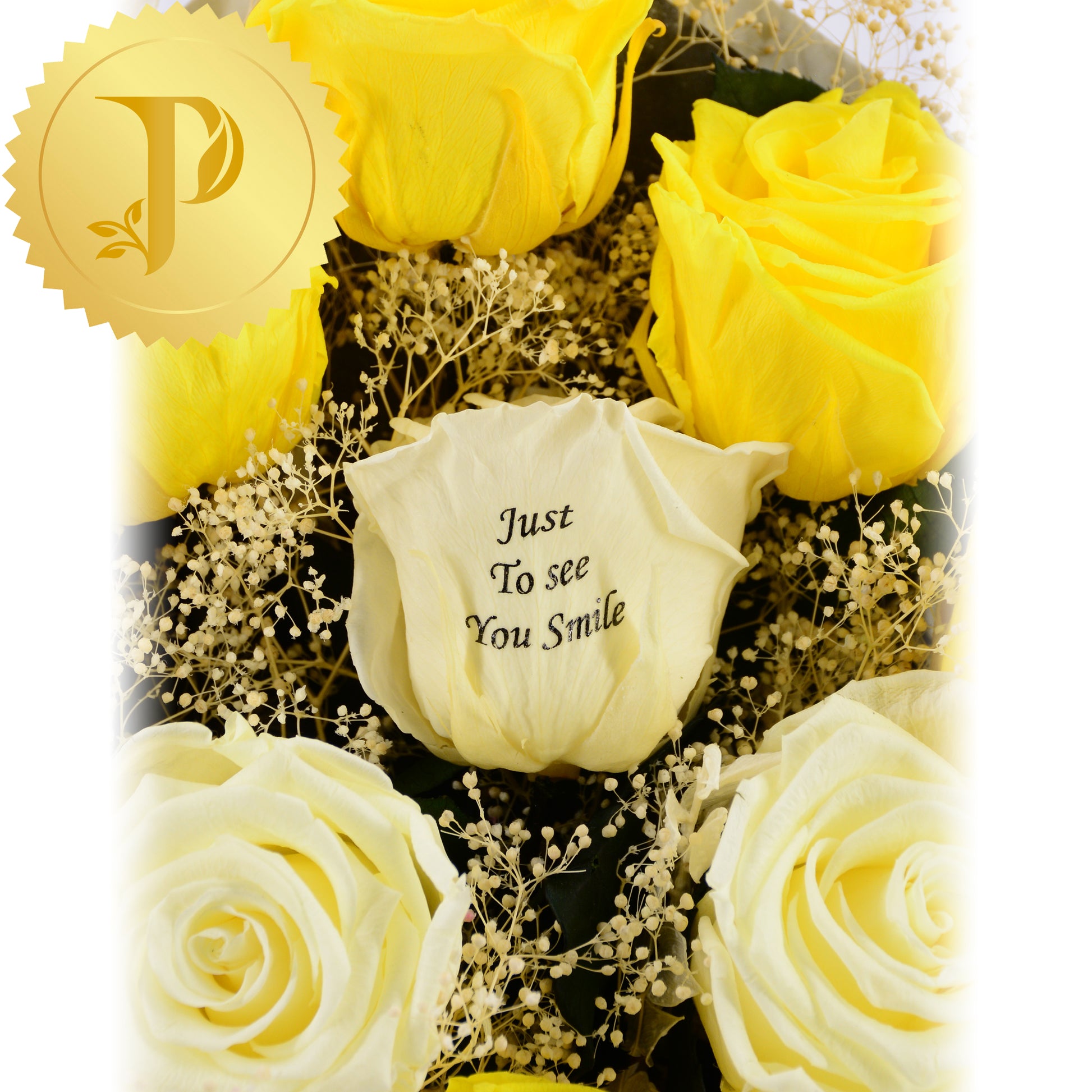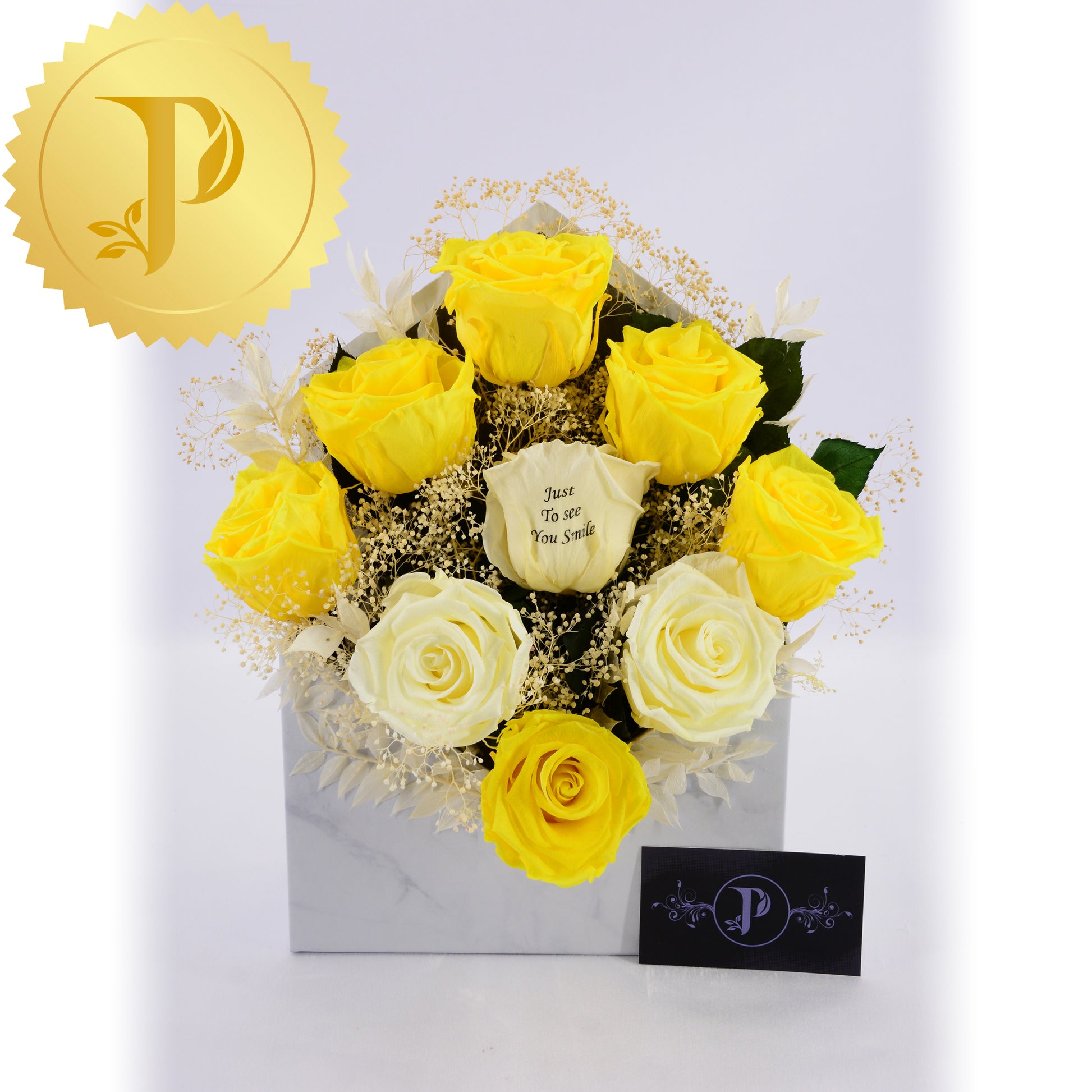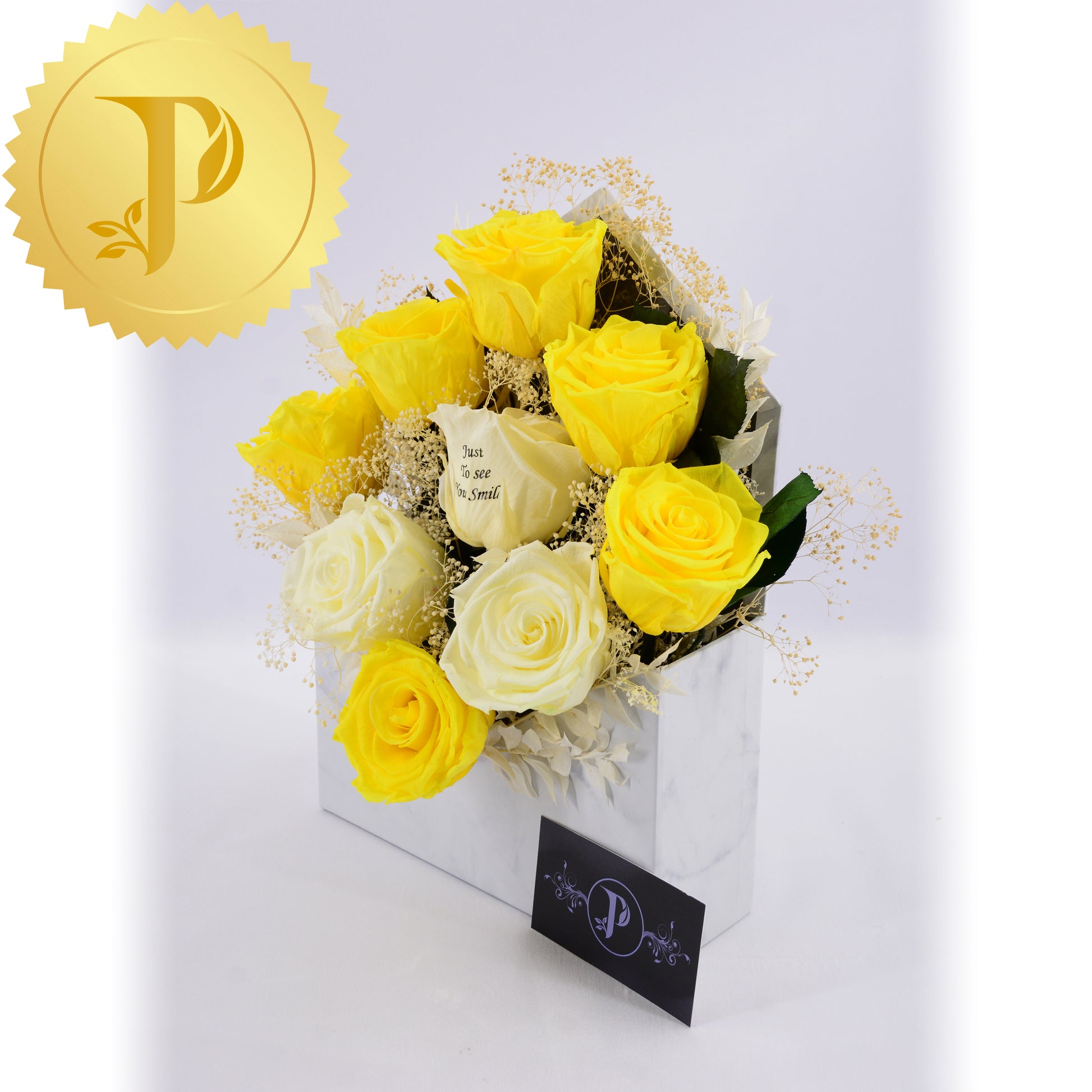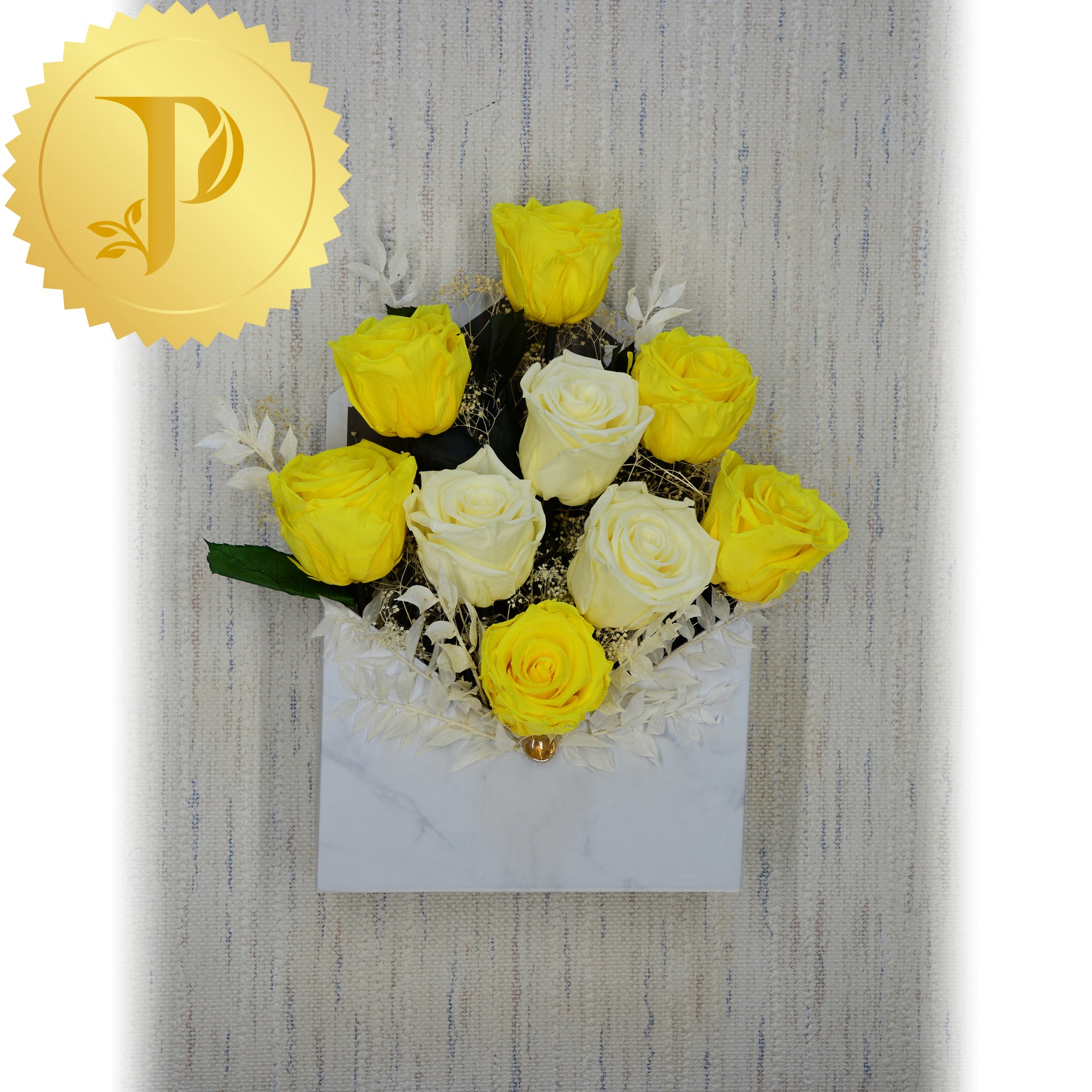 Convey a sweet message of love and friendship with this cute, marbleized envelope design. A combination of nine cheery roses in butter and bright yellow will enhance any room. This delightful arrangement is also suitable for hanging (picture hanger included).