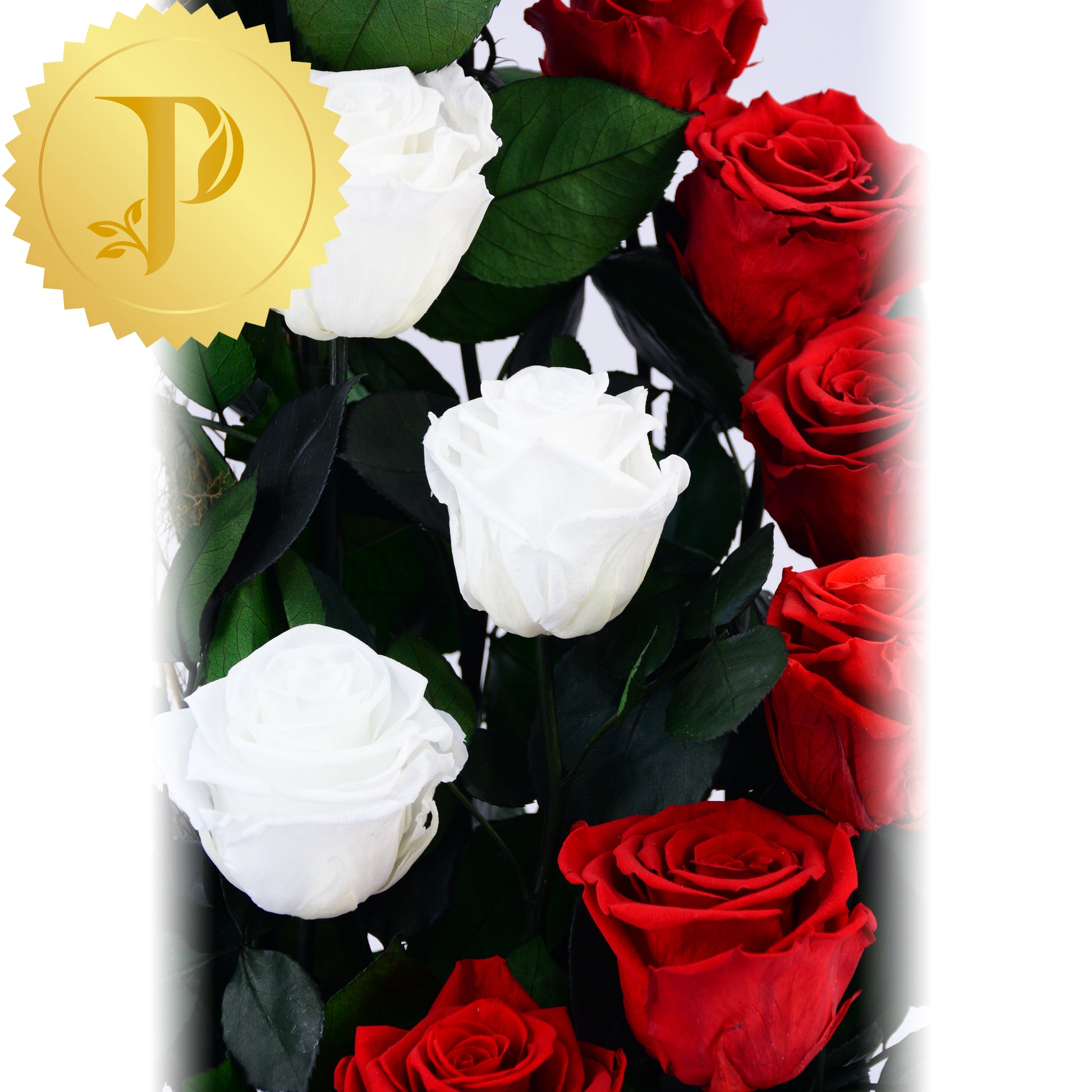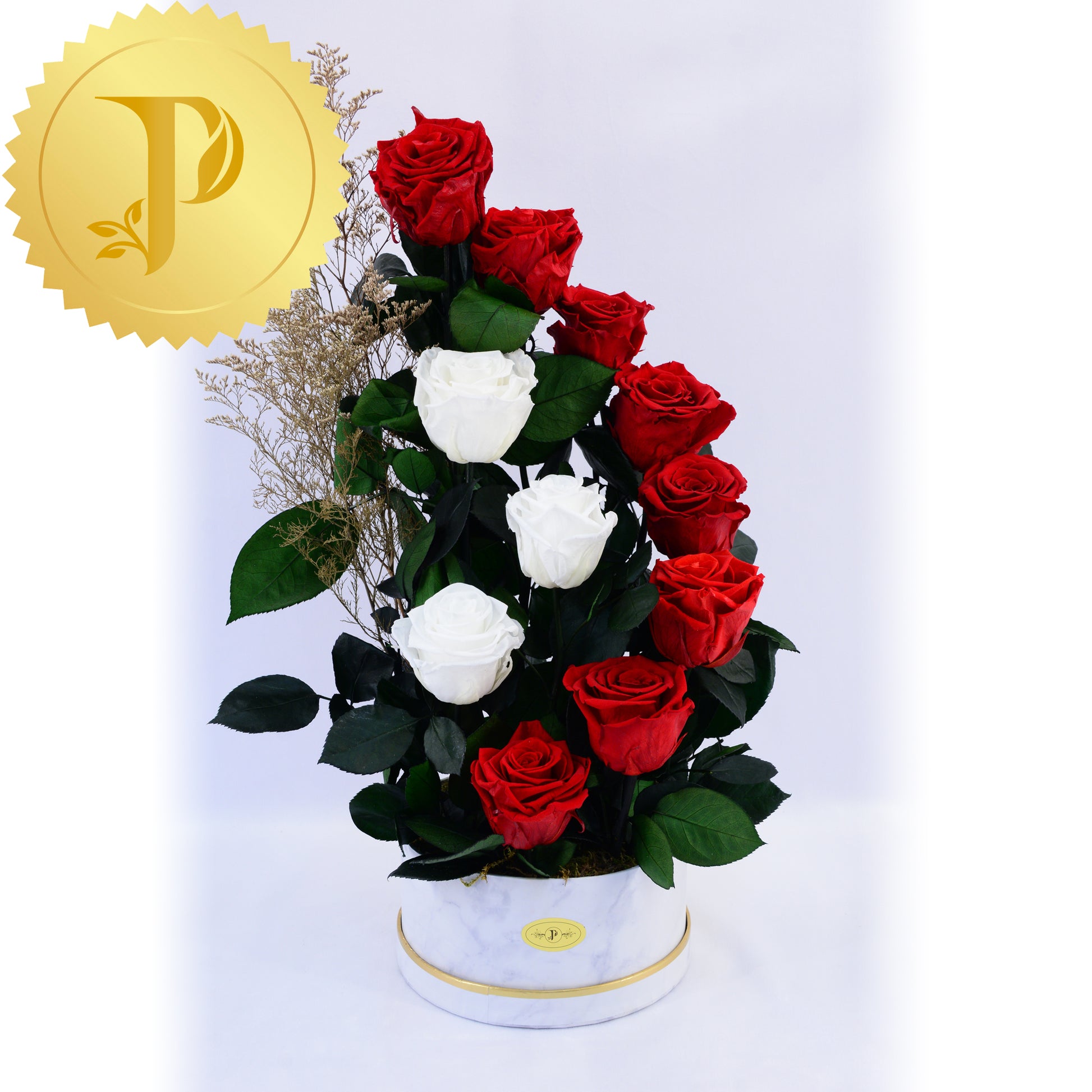 Celebrating our Canadian flag with this graceful curl formed by eight red roses and three white roses nesting inside. The elegance of this arrangement is enhanced with our white marble patterned container.