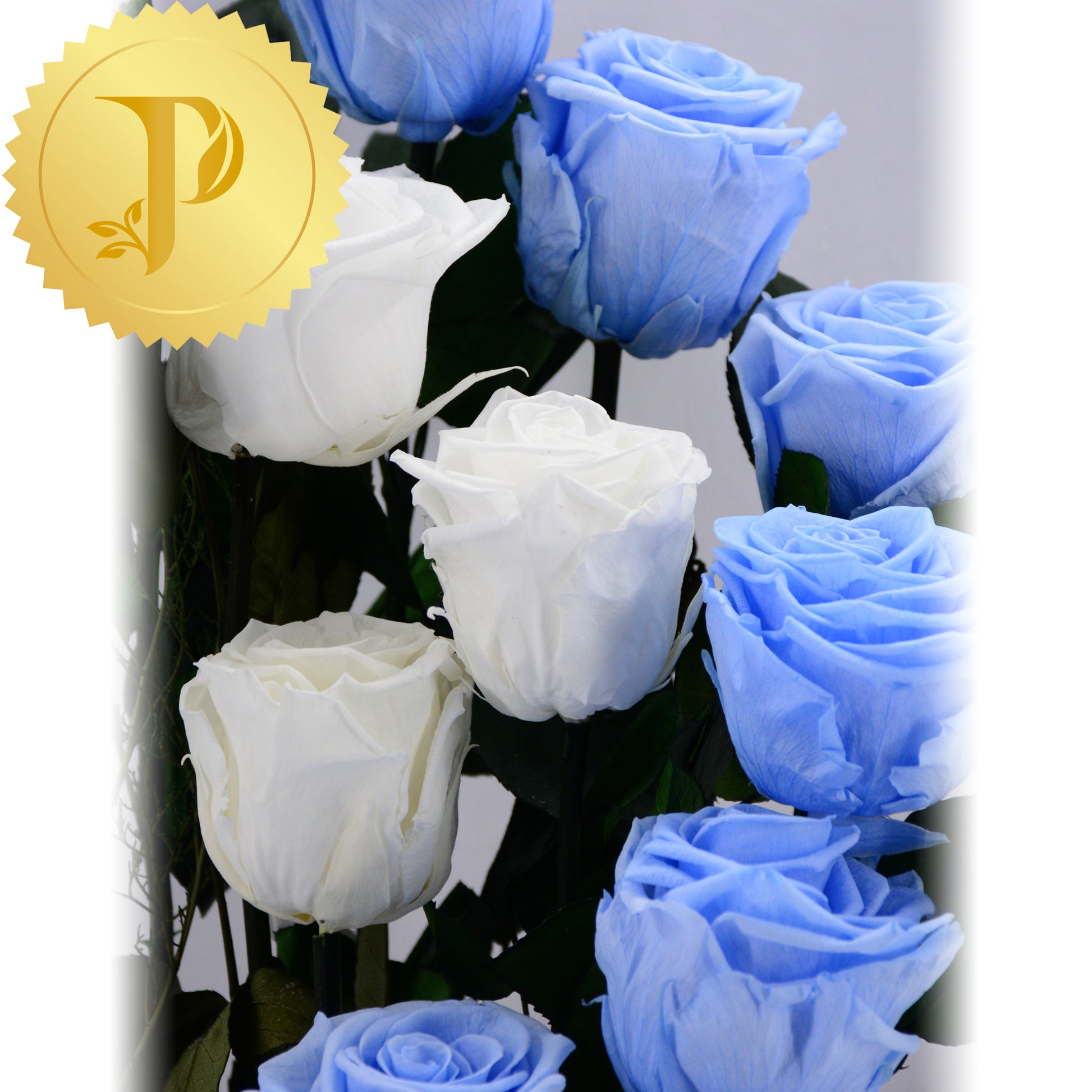 A graceful curl formed by this colour combination of eight light blue and three white coloured roses nesting inside, is reminiscent of a bright blue sky with white cloud accents. The elegance of this arrangement is enhanced with our white marble patterned container.