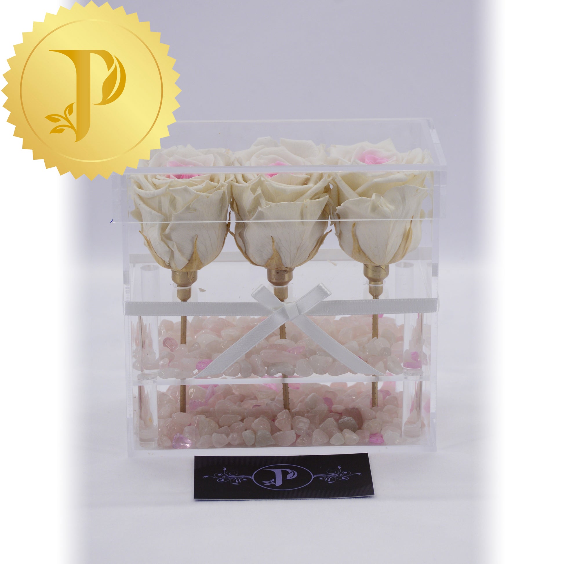 Arrangements in acrylic are available either with a drawer or tall with stems and no drawer. All arrangements come with a layer of your choice of either matching faux pearls, natural stones (lapis lazuli), crystals (clear and rose quartz) or crushed glass (gold). The drawers can be filled with either Ferrero Rocher or Baci chocolates. Acrylic boxes will be highlighted with a white ribbon.