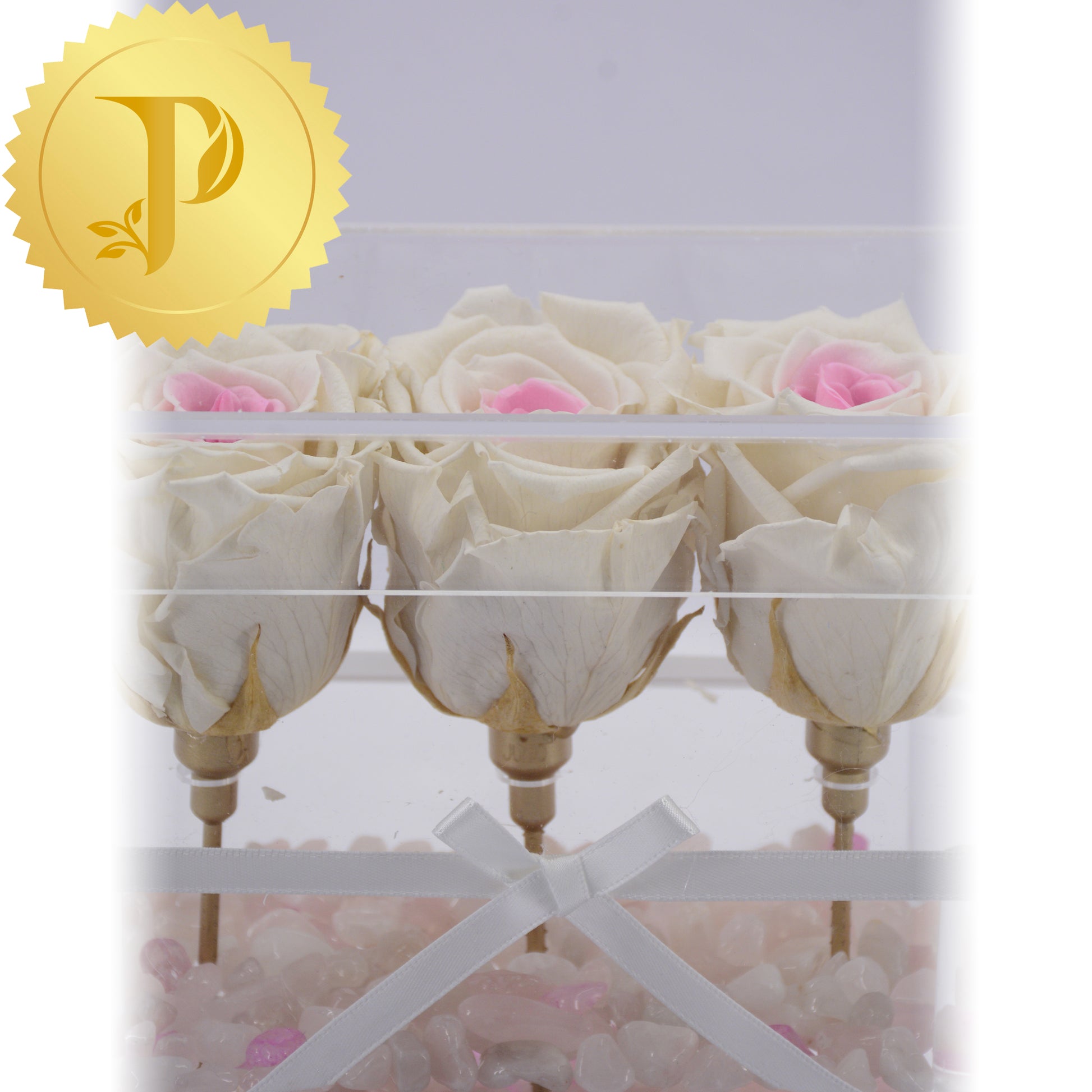 Enjoy this unique set of bi-colour pink and ivory roses enhanced by a special pink centre in an acrylic box. The roses stand tall on an artificial stem. Rose quartz, a healing crystal known for promoting love and friendship is used on both levels for this arrangement.