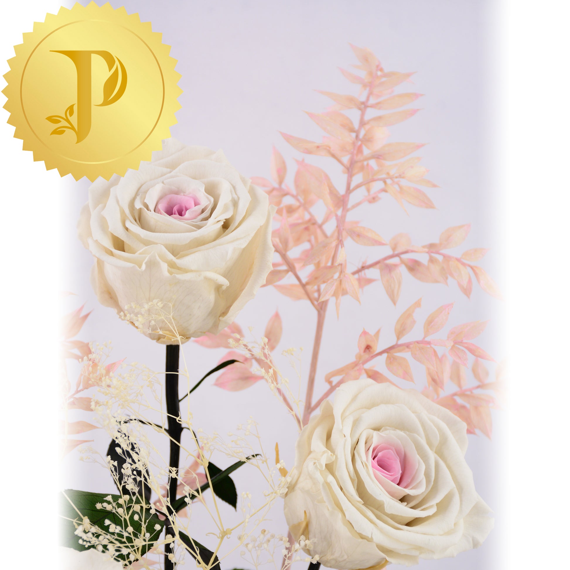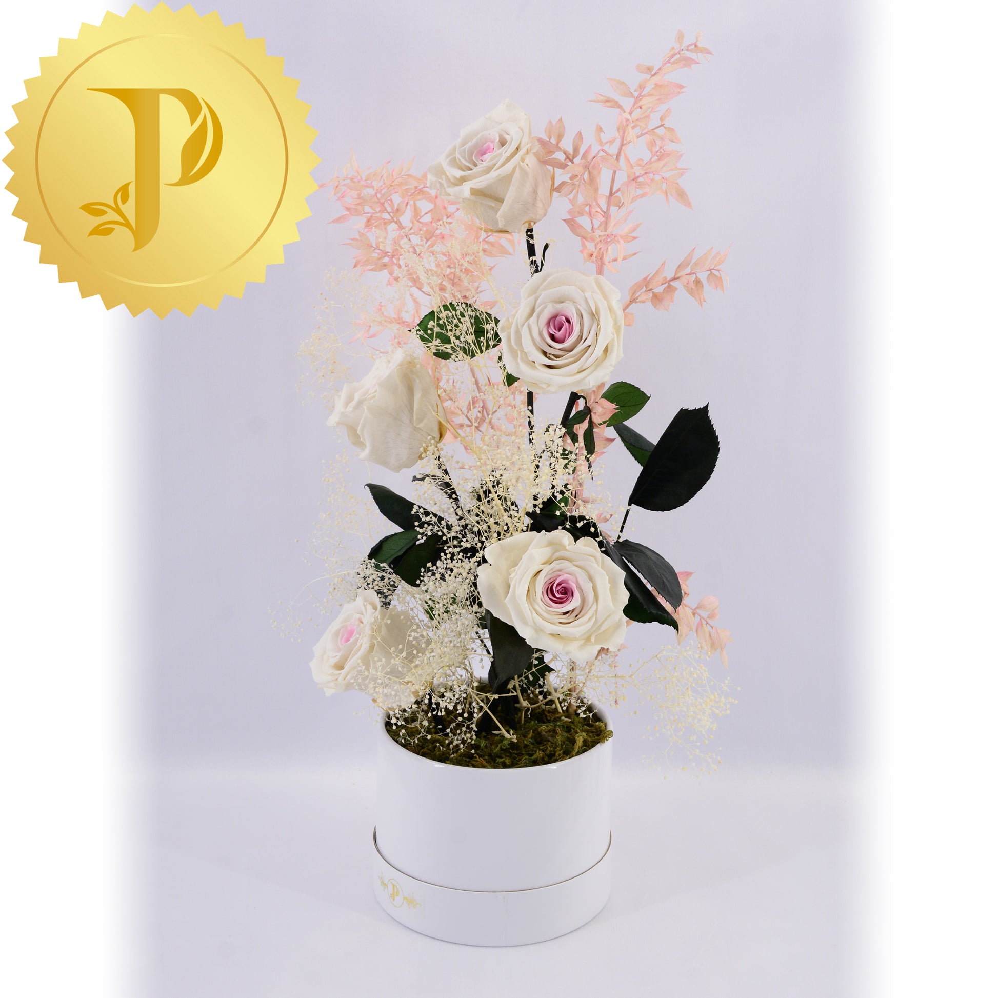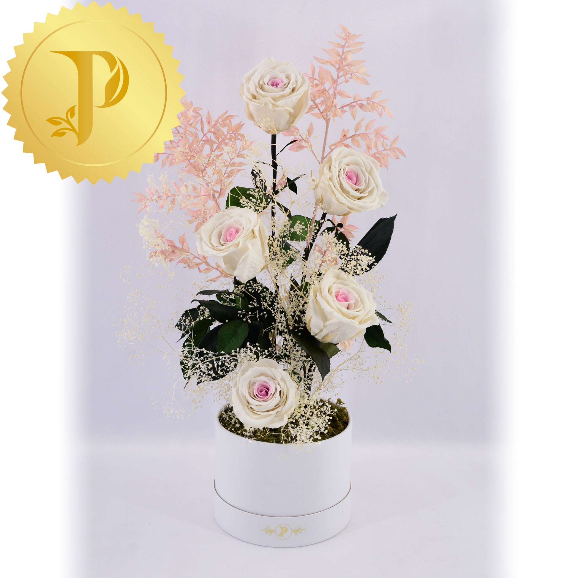 Cheery white roses with soft pink centres are accented with selected preserved filler. The arrangement is placed in a small round white box, adorned with preserved moss to give a more realistic effect.