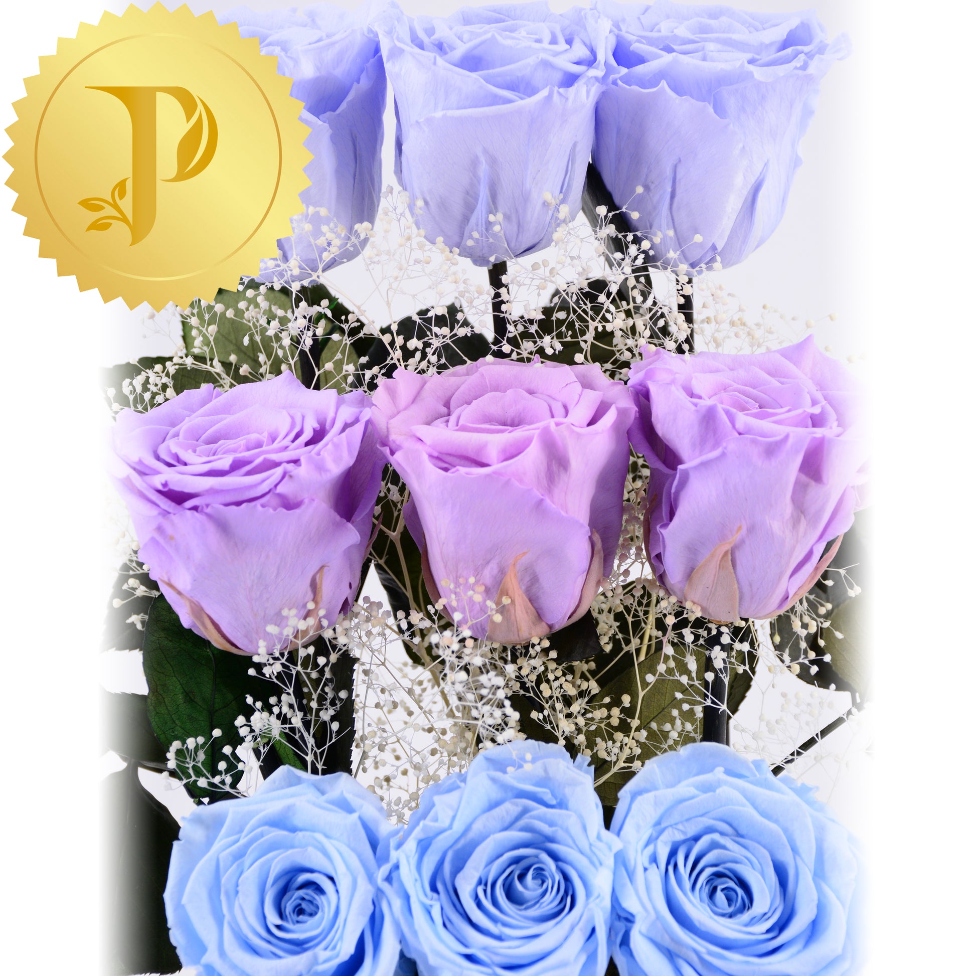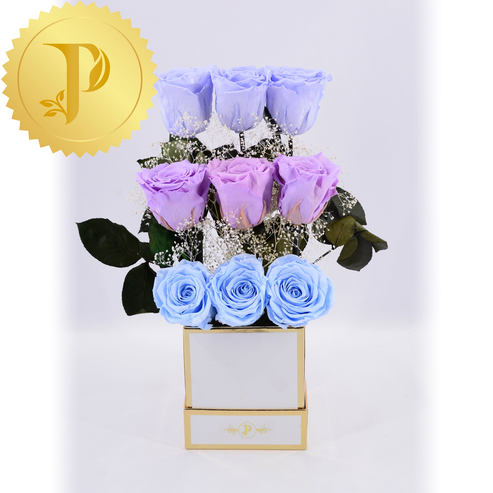 The charm of these soft pastel-coloured roses is highlighted in this nine-tiered concert of colour. This delightful arrangement is placed in a square white gold trimmed box, adorned with preserved moss to give a more realistic effect.