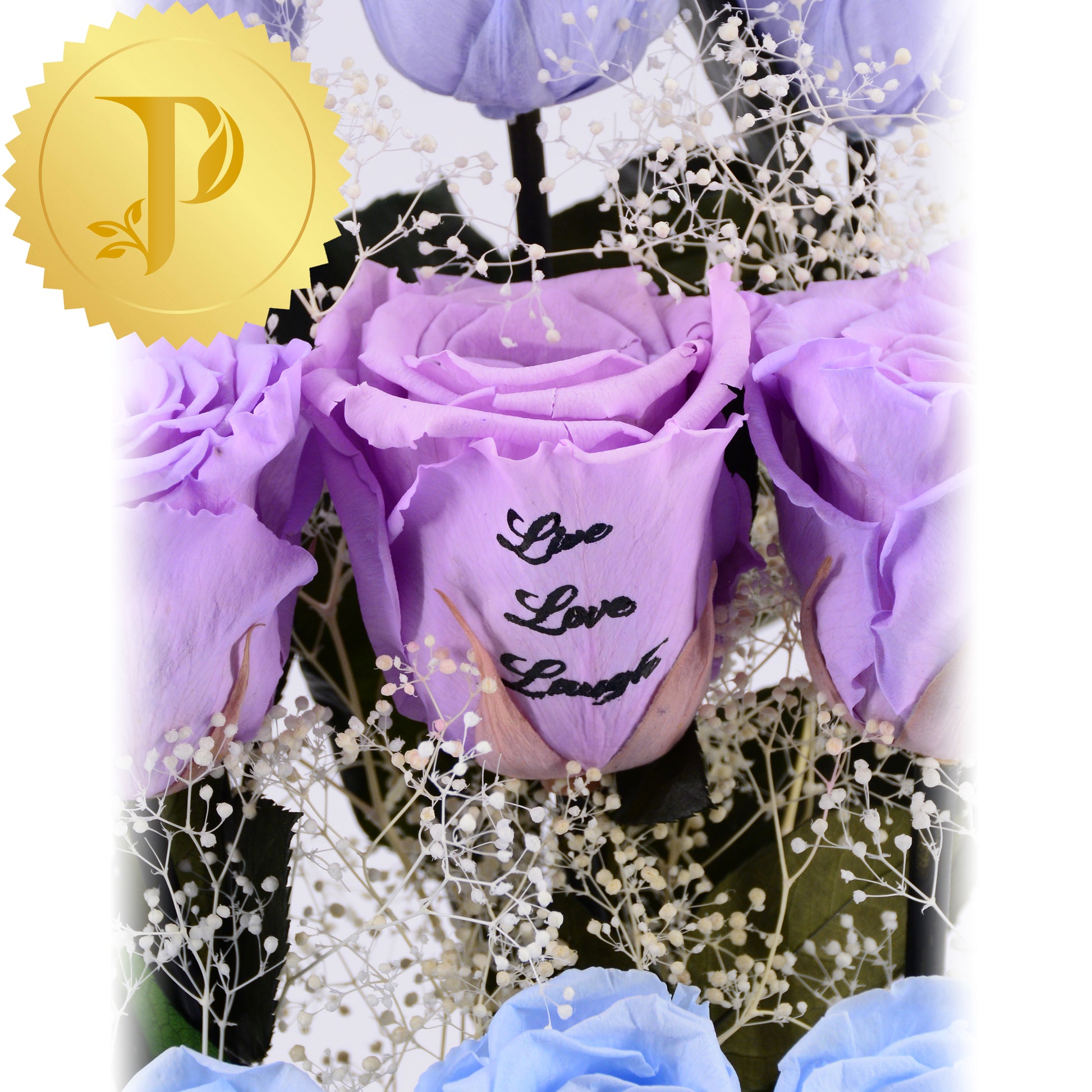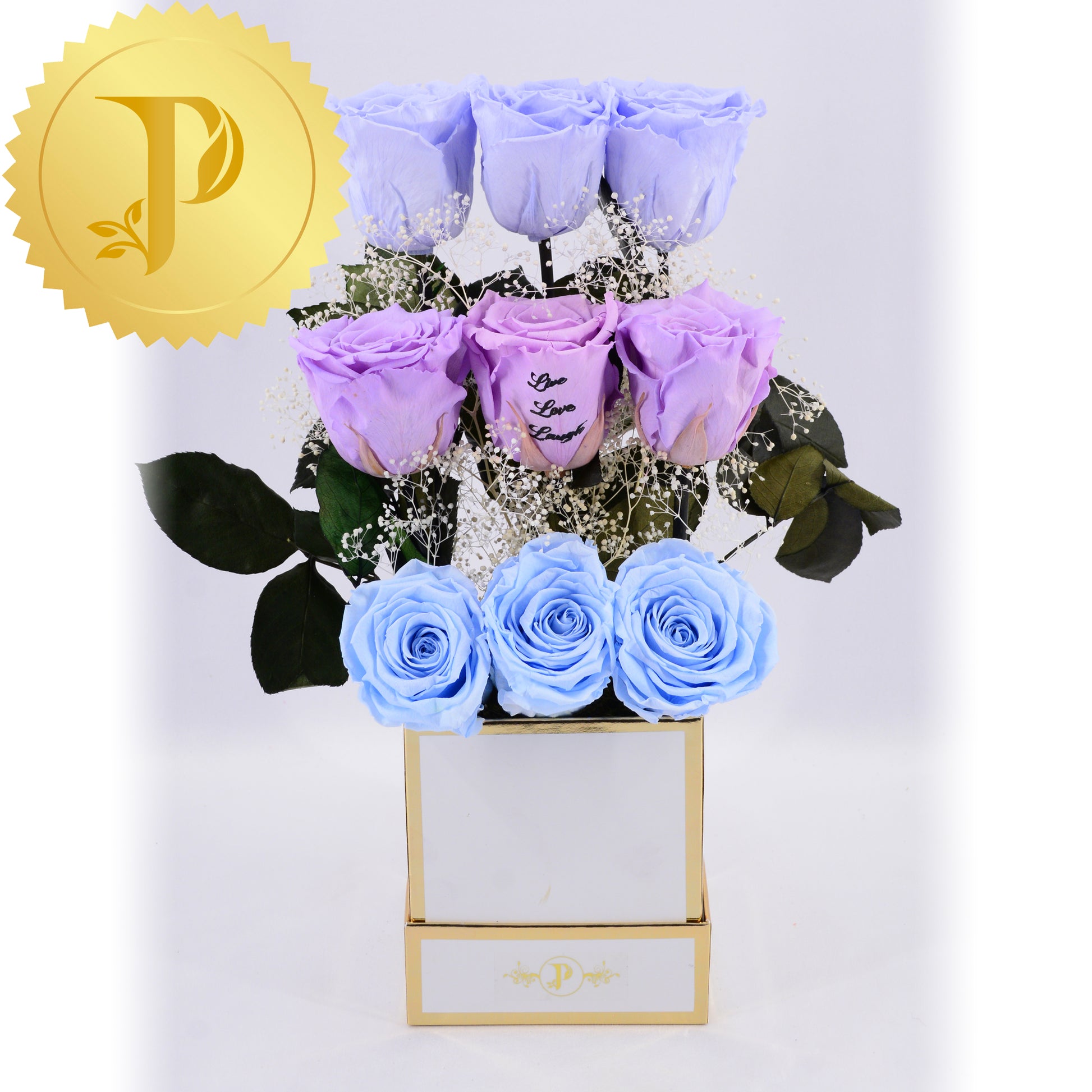The charm of these soft pastel-coloured roses is highlighted in this nine-tiered concert of colour. This delightful arrangement is placed in a square white gold trimmed box, adorned with preserved moss to give a more realistic effect.