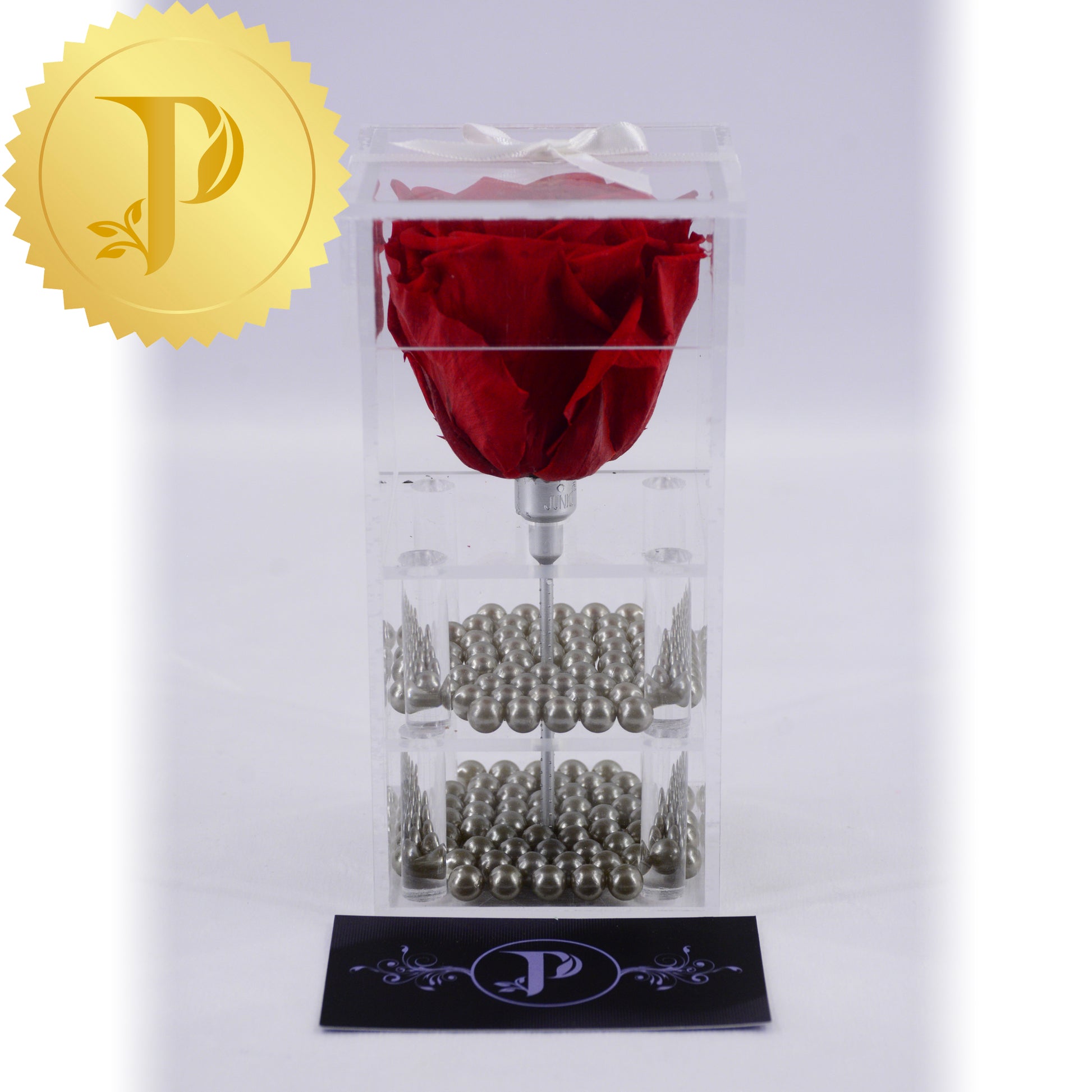 All arrangements come with a layer of either matching faux pearls, natural stones (lapis lazuli), crystals (clear and rose quartz) or crushed glass (gold coloured). Faux stems are either green, gold or silver coloured. The drawers are filled with either Ferrero Rocher or Baci chocolates. Acrylic boxes will be highlighted with a white ribbon.