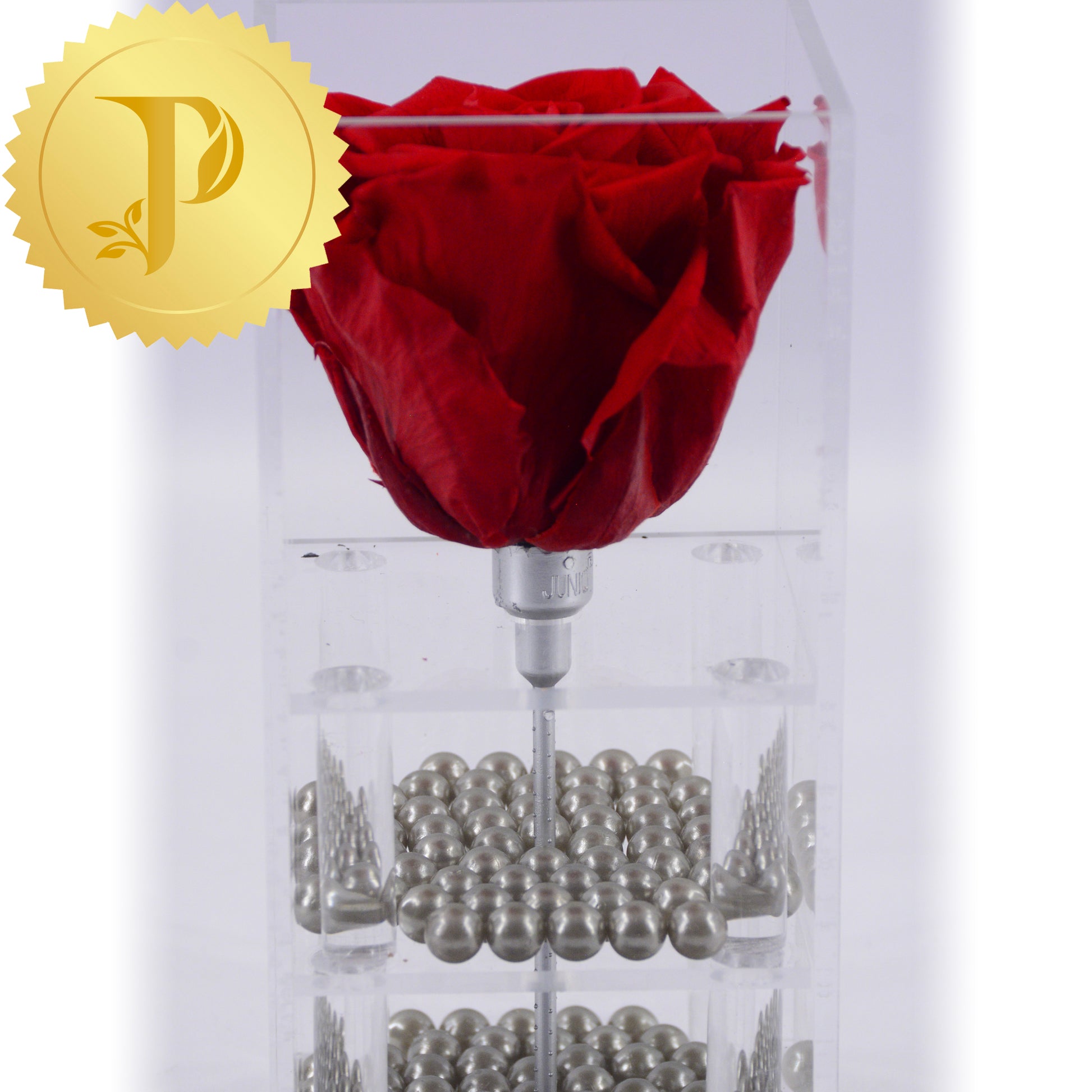 Here we have the classic, single red rose placed on a silver-coloured faux stem, complemented by silver faux pearls.