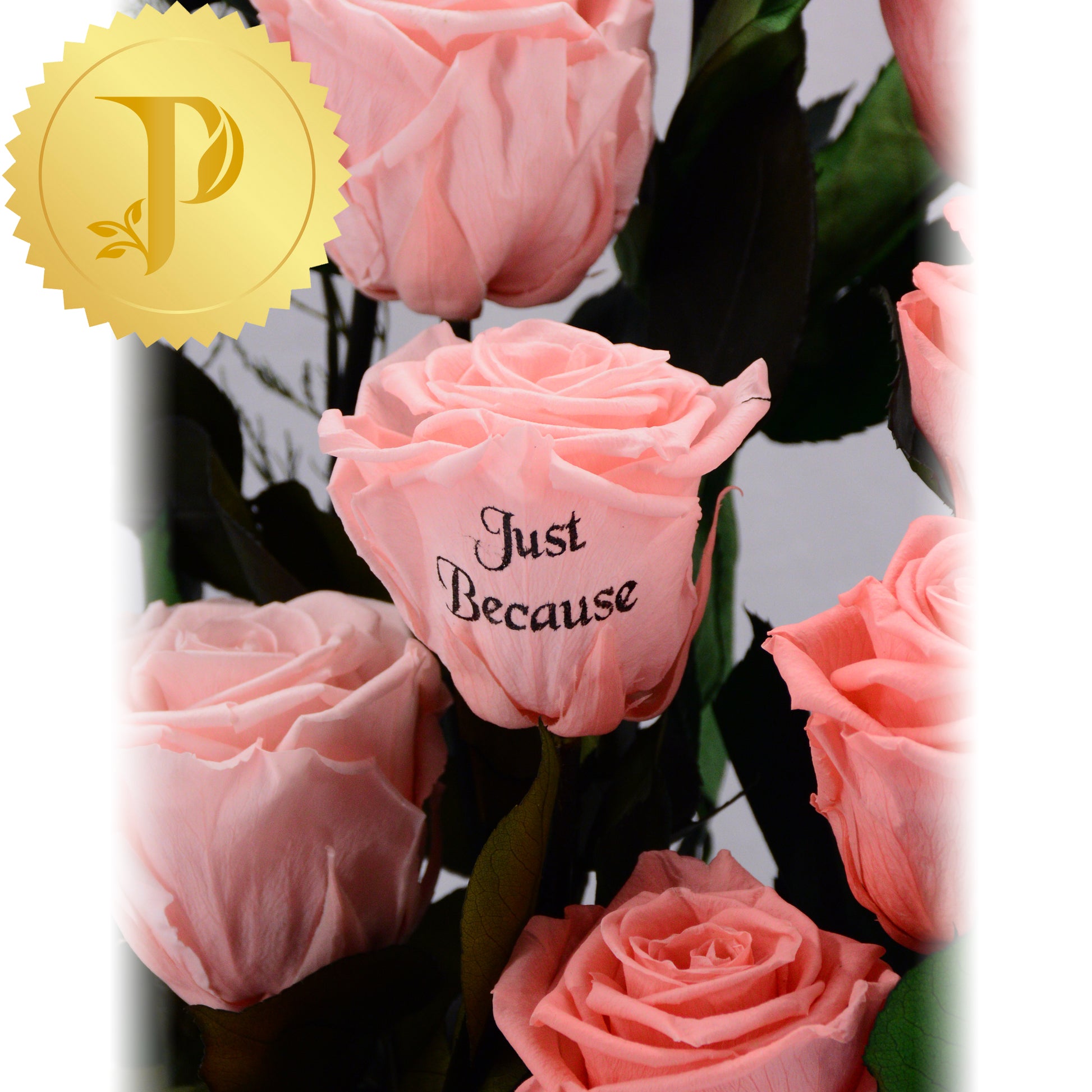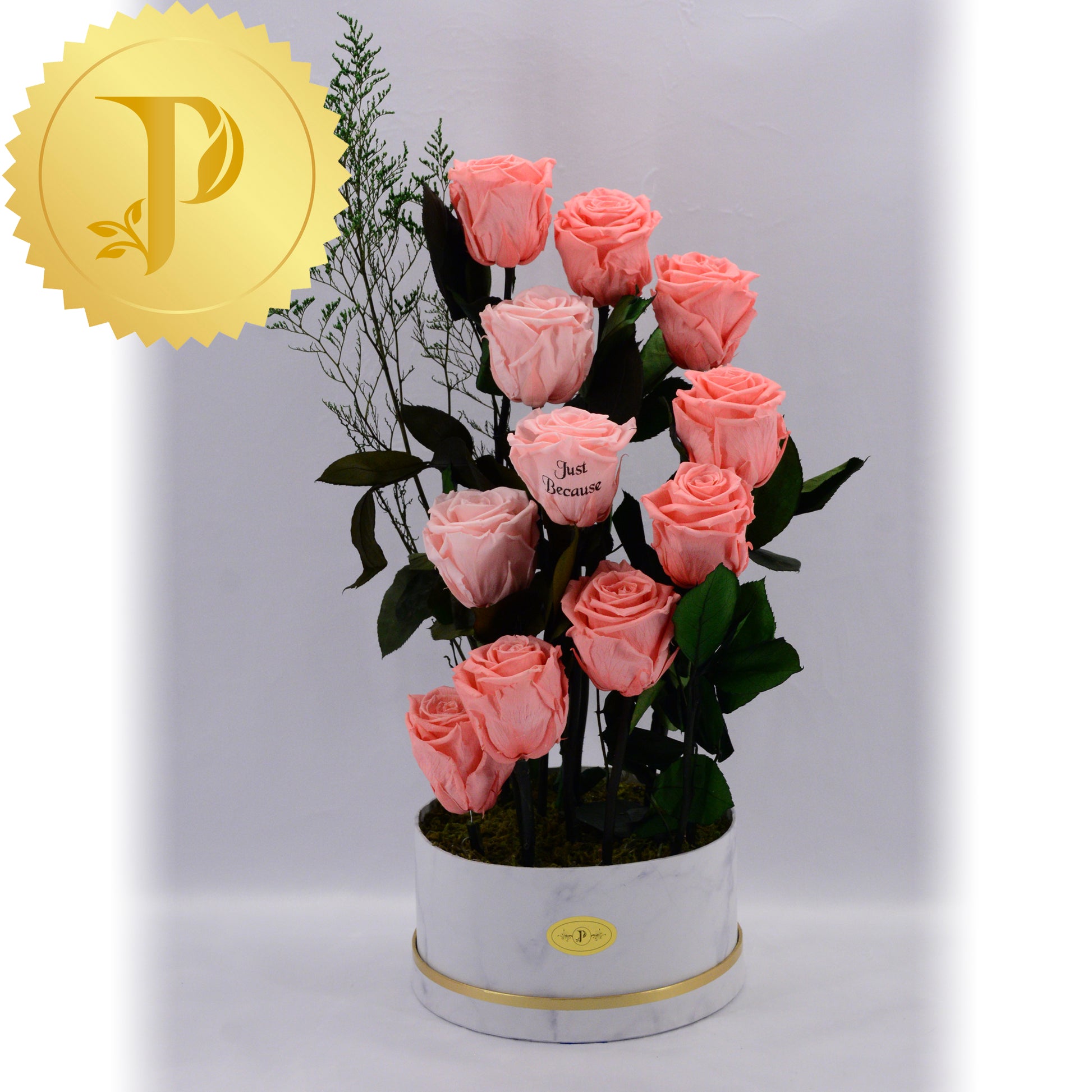 A graceful curl formed by this warm and delicate colour combination of eight coral and three pink roses nesting inside. The elegance of this arrangement is enhanced with our marble patterned container. Its artistic nature draws the attention of any audience and for any occasion.