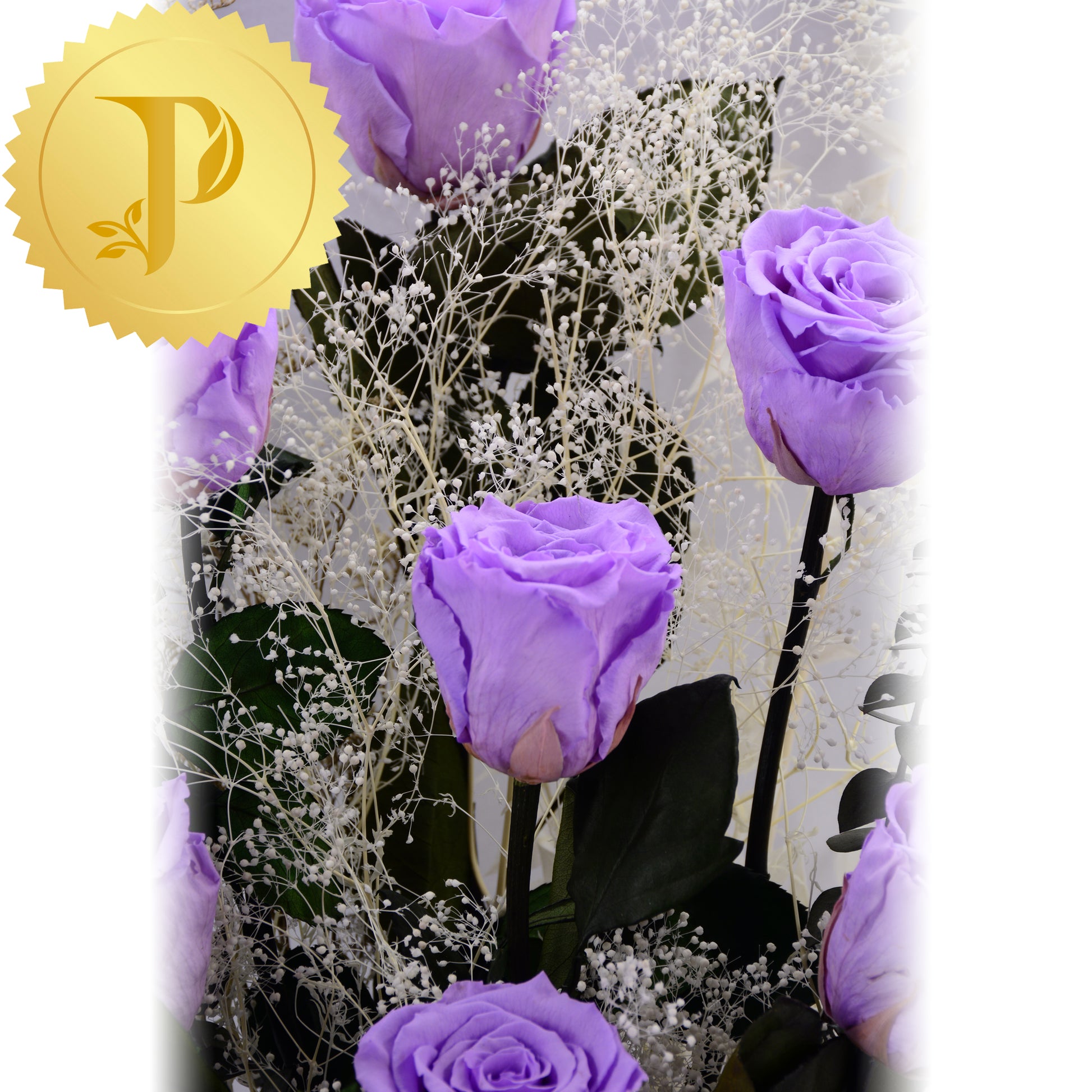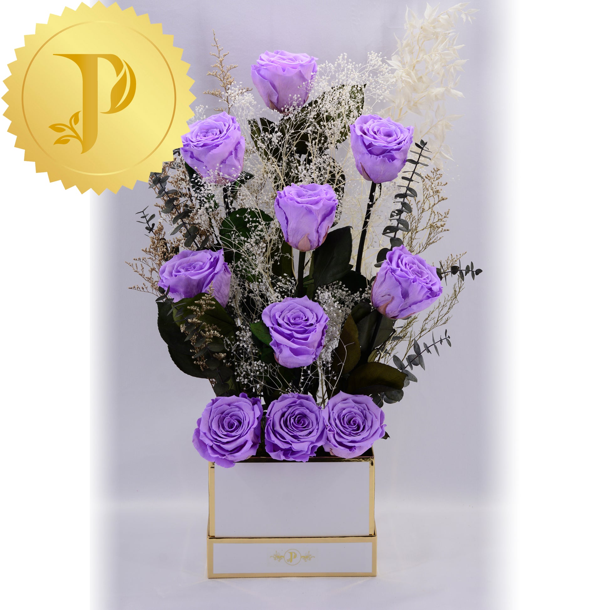 Enjoy this lovely arrangement of ten light purple-coloured roses elegantly designed and placed in a square white gold trimmed box, with a variety of selected filler to enhance its’ beauty. An expressive tribute for a special occasion.