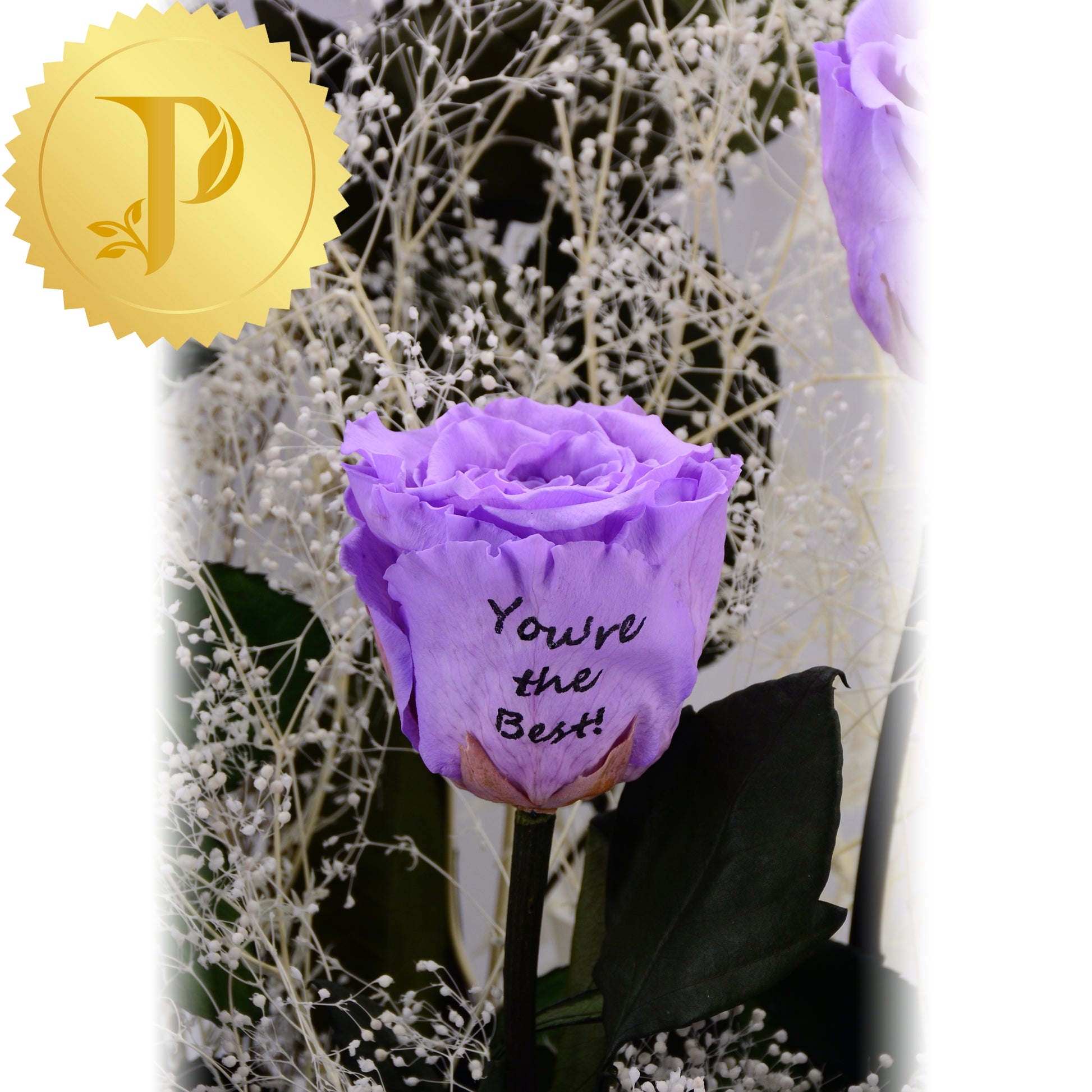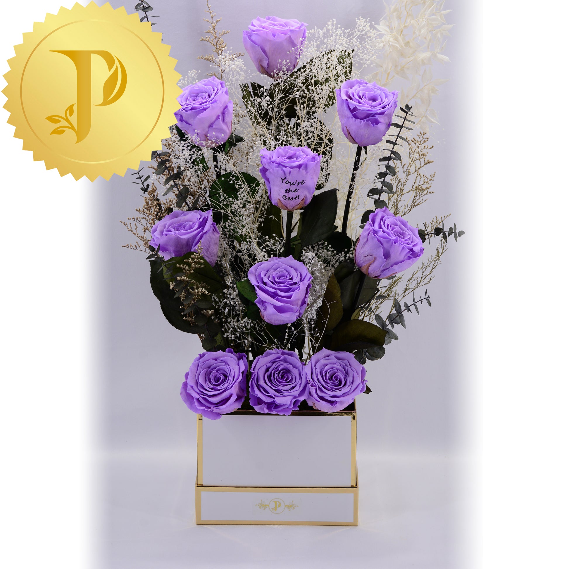 Enjoy this lovely arrangement of ten dazzling purple-coloured roses elegantly designed and placed in a square white gold trimmed box, with a variety of selected filler to enhance its’ beauty. An expressive tribute for a special occasion that will complement any décor at home or at the workplace.