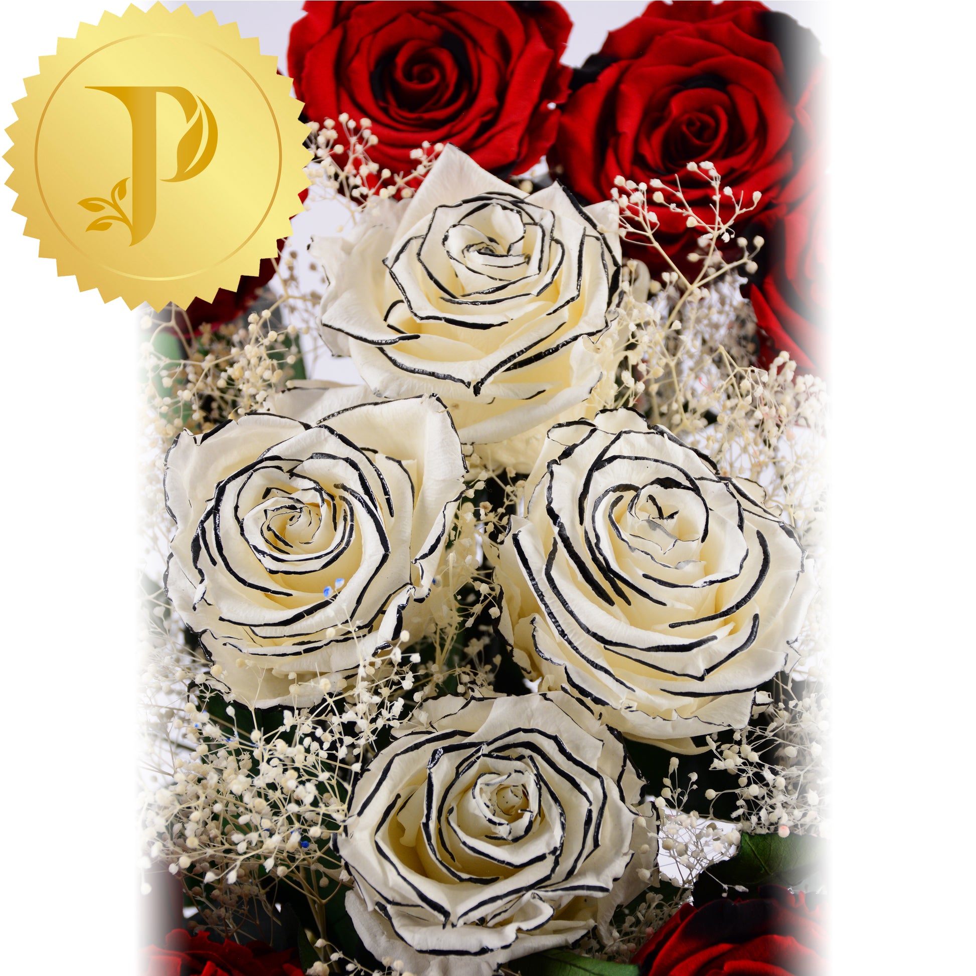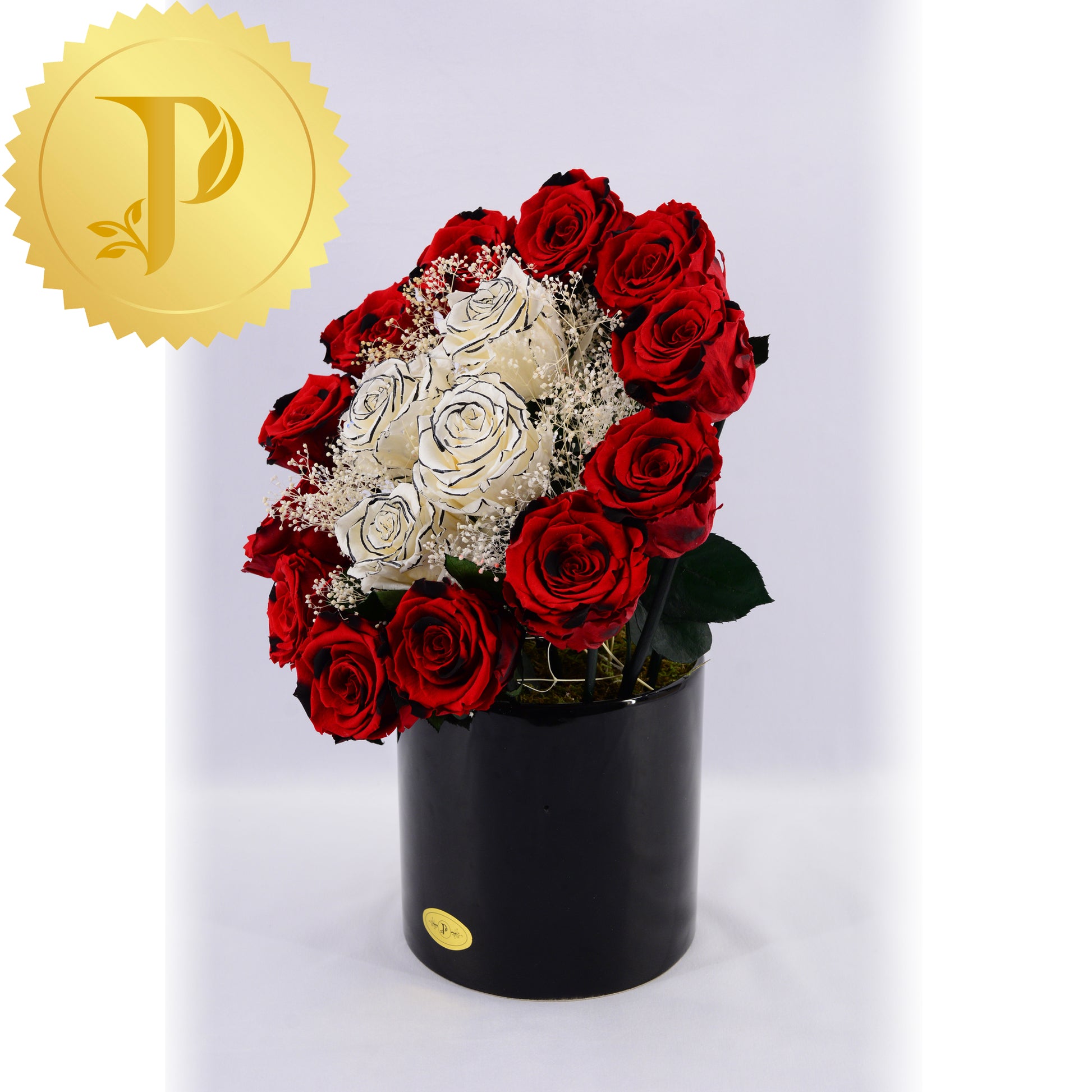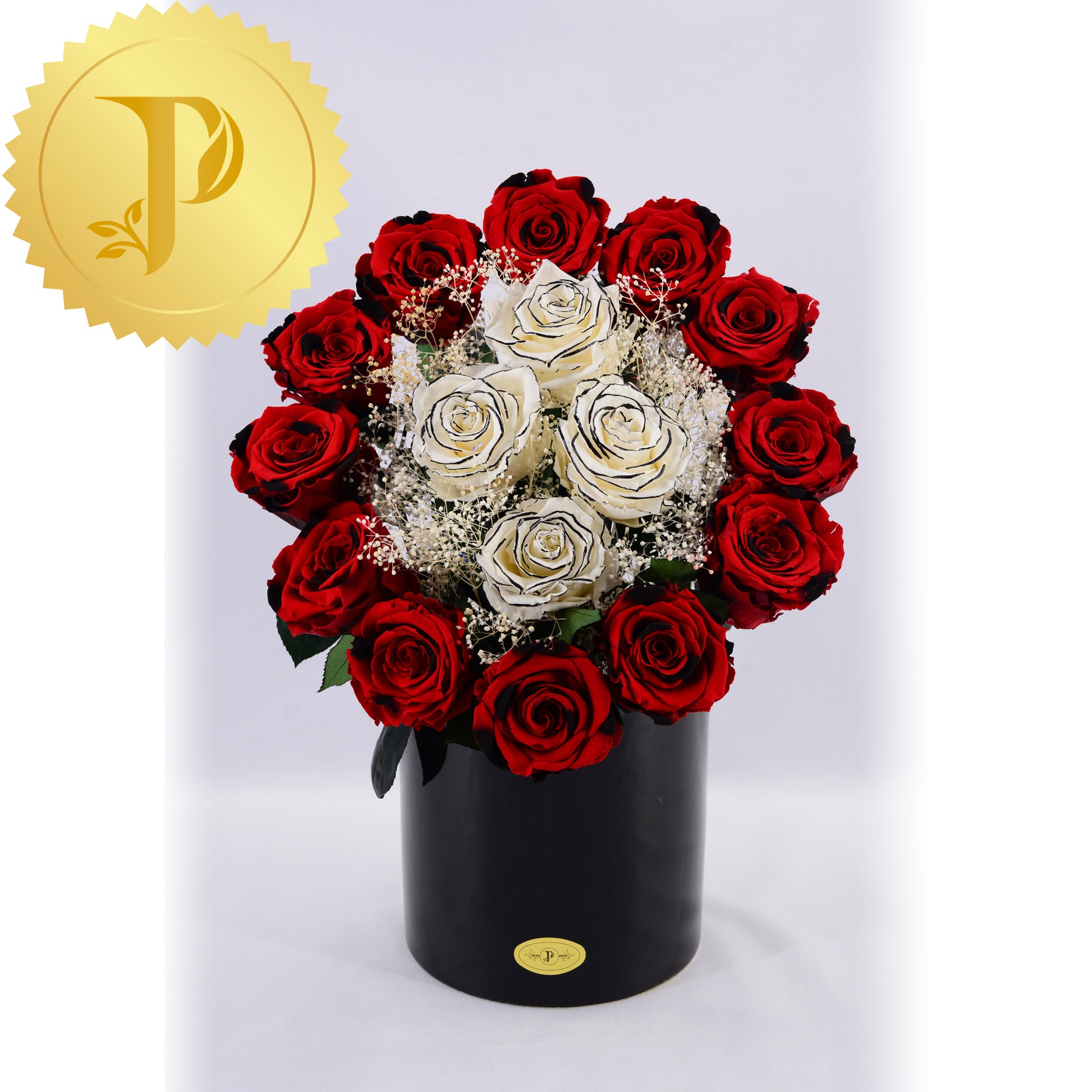 Twelve striking and dramatic red roses with black highlights encircle four black edged roses highlighted with white gypsophila.