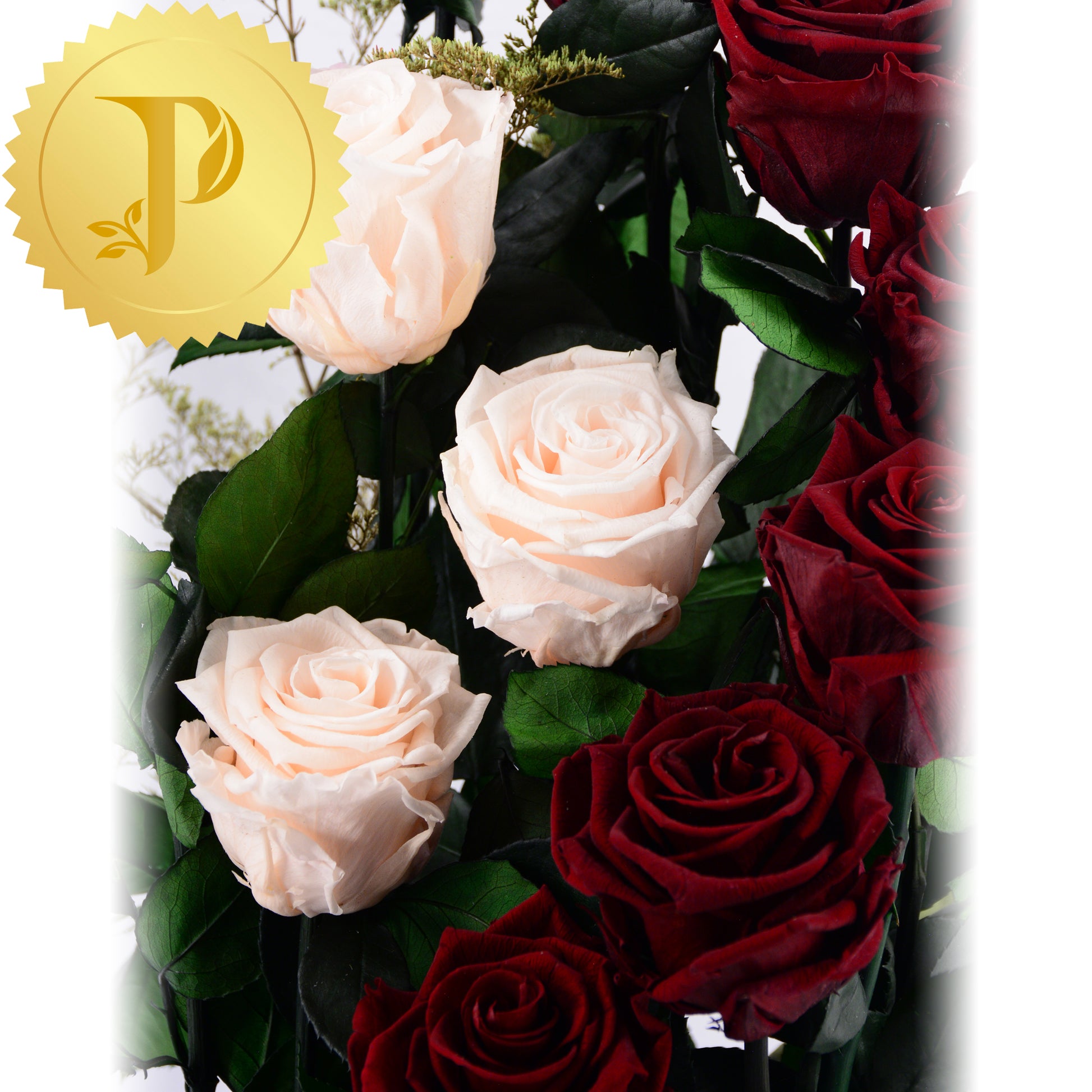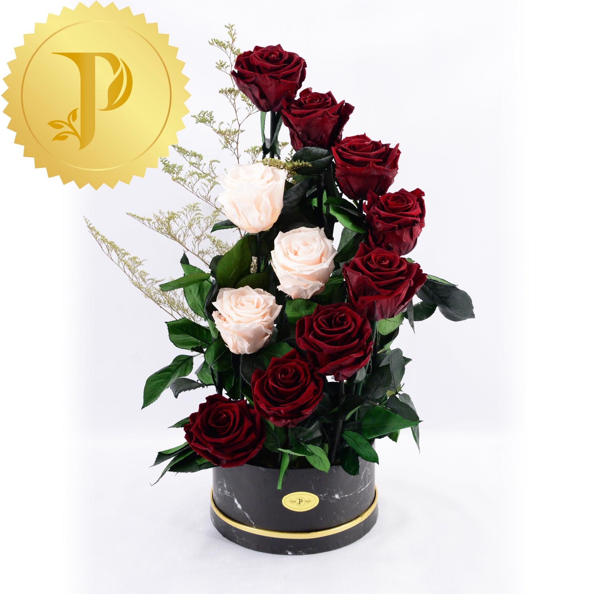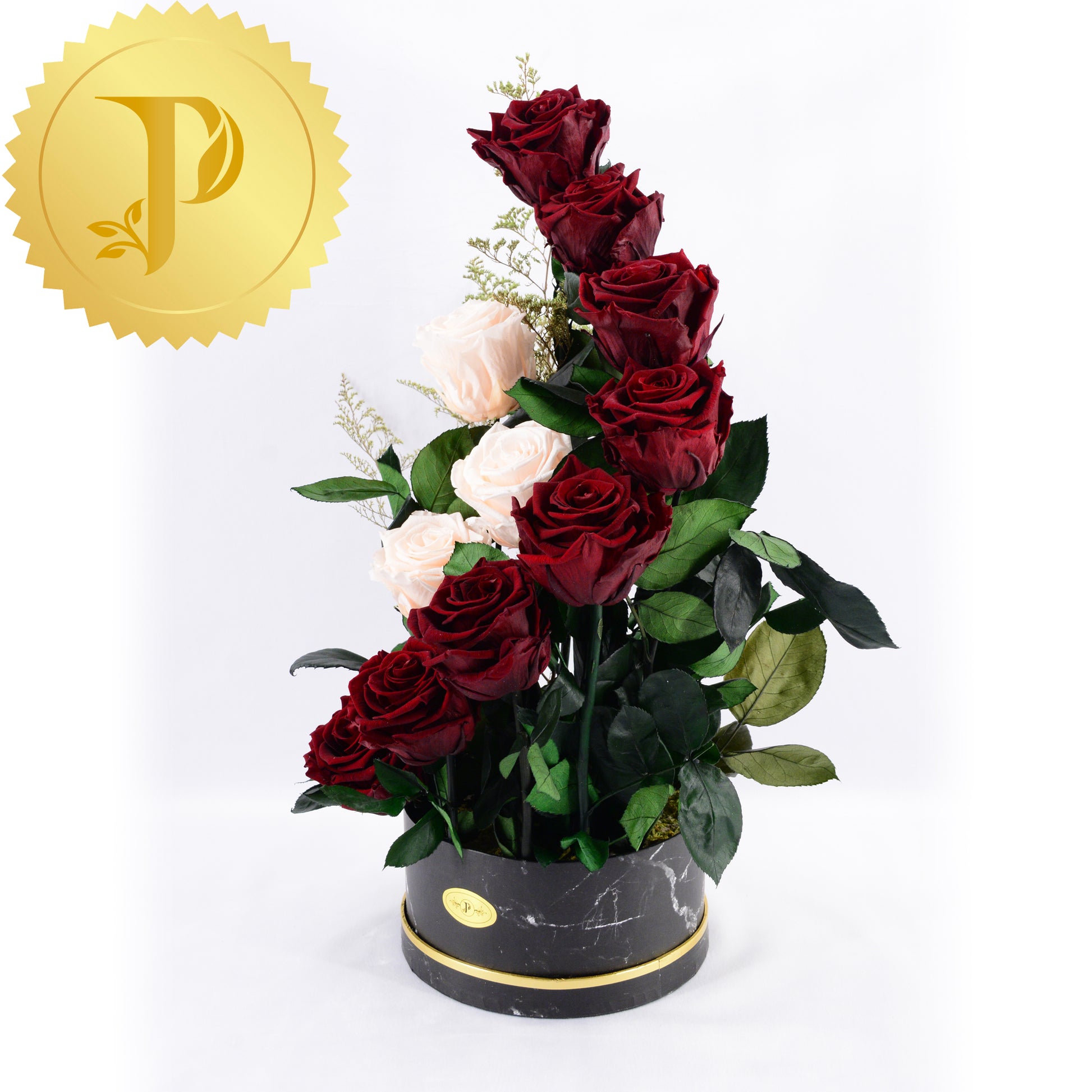 A graceful curl formed by the timeless combination of eight deep burgundy roses with three light pink roses nesting inside. The elegance of this arrangement is enhanced with our black marble patterned container.