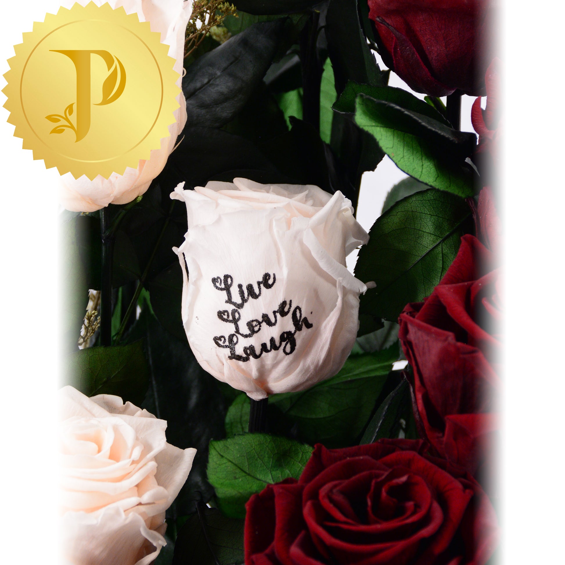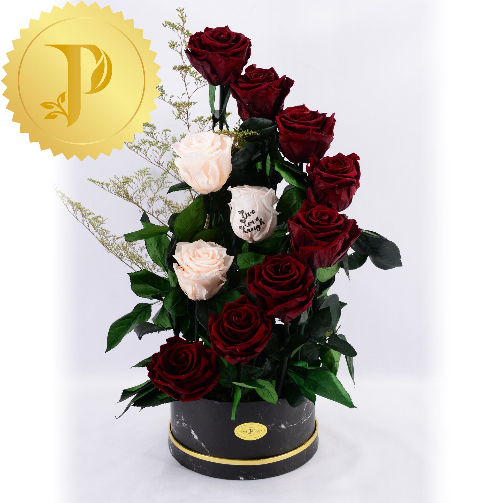 A graceful curl formed by the timeless combination of eight deep burgundy roses with three light pink roses nesting inside. The elegance of this arrangement is enhanced with our black, marble patterned container. Its artistic nature draws the attention of any audience and for any occasion.