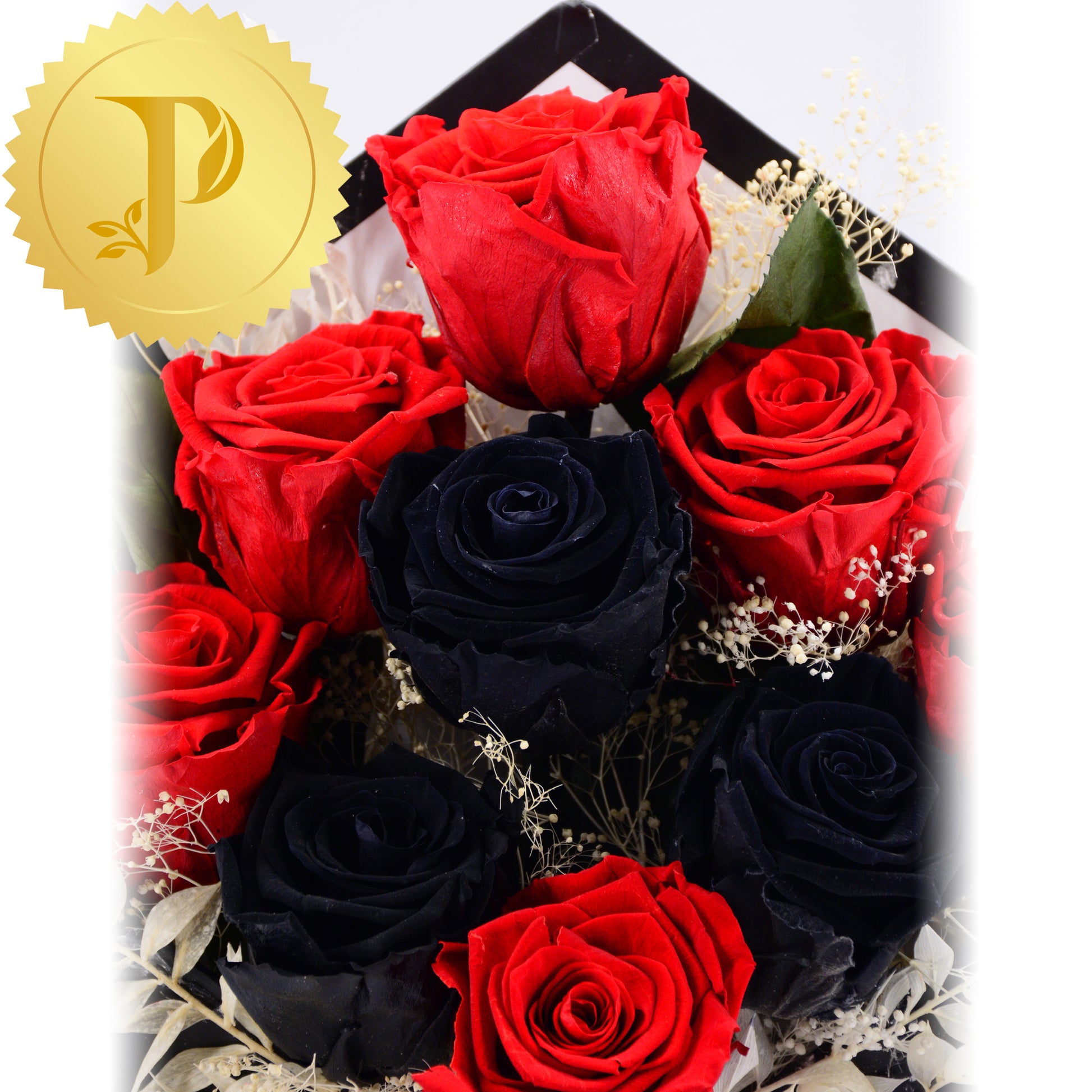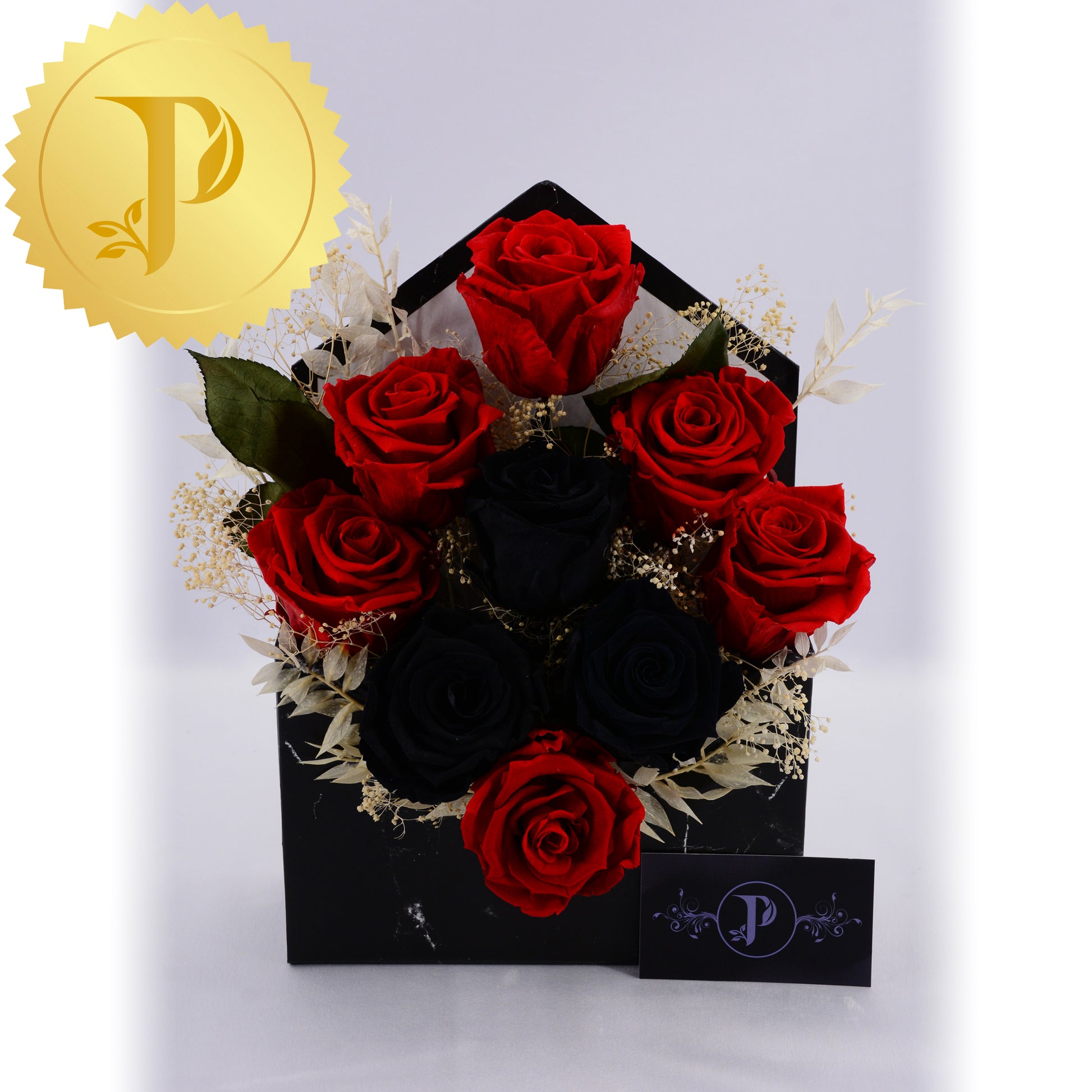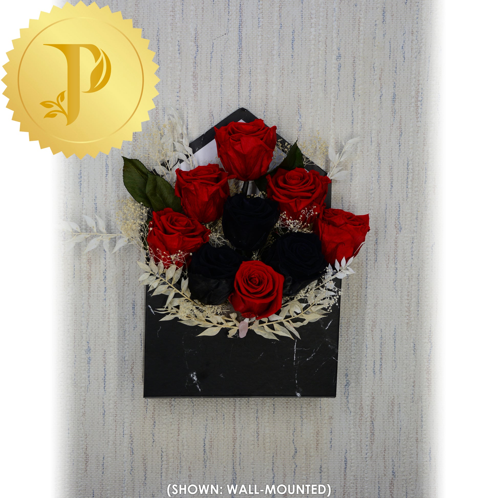 Convey a sweet message of love and friendship with this cute, marbleized envelope design. A combination of nine black and red roses will add a dramatic look to any room. This delightful arrangement is also suitable for hanging (picture hanger included).