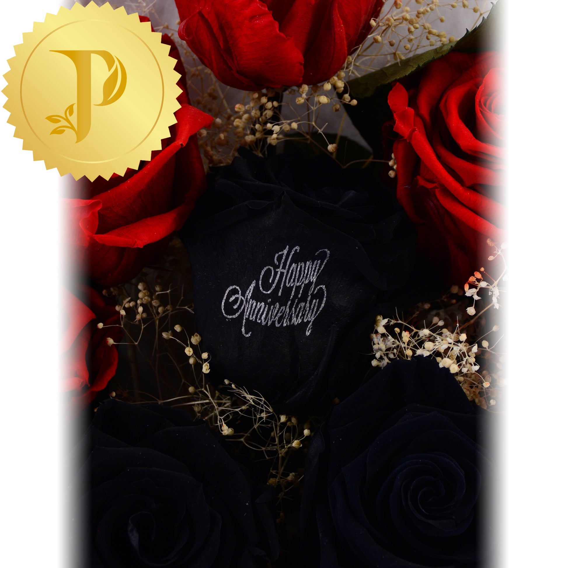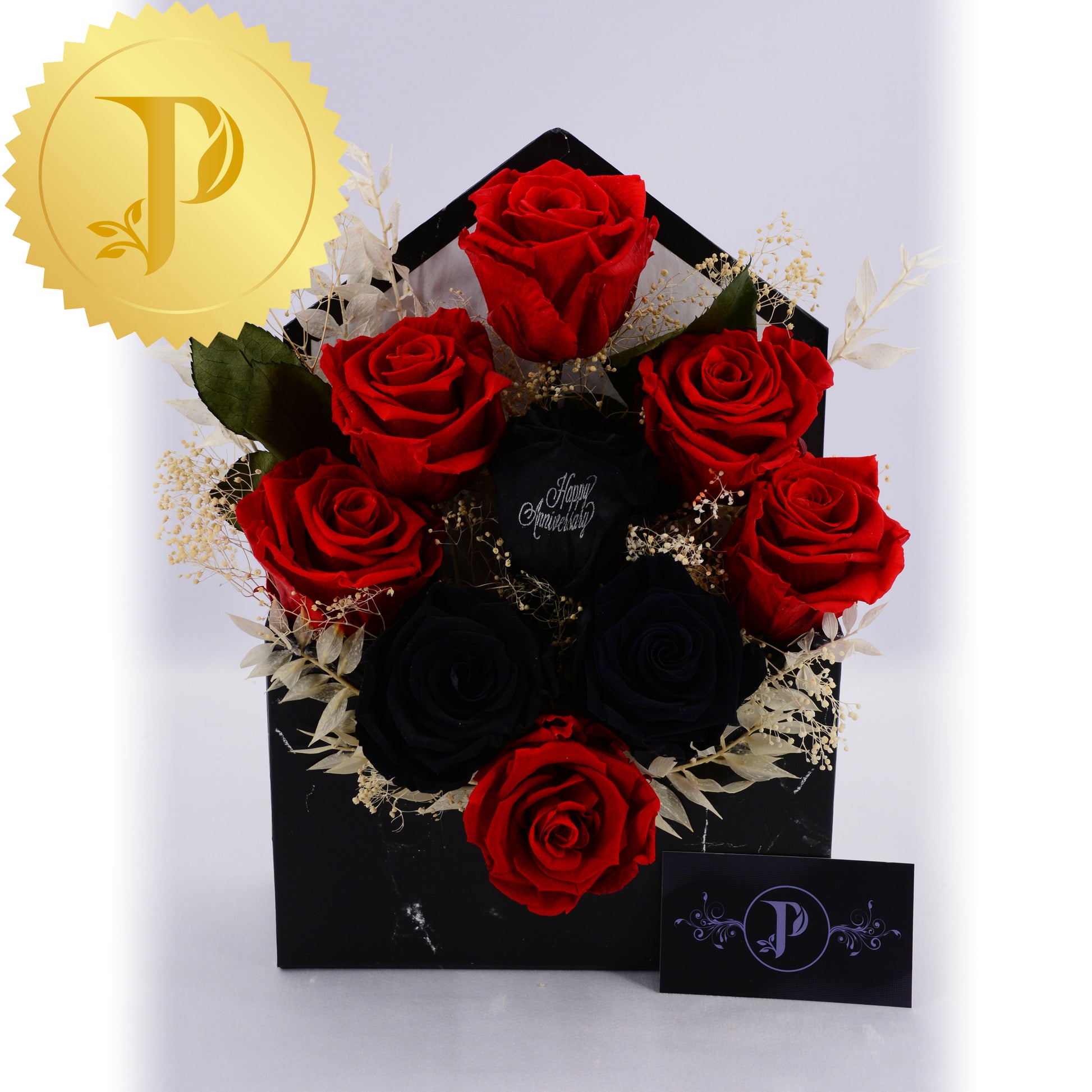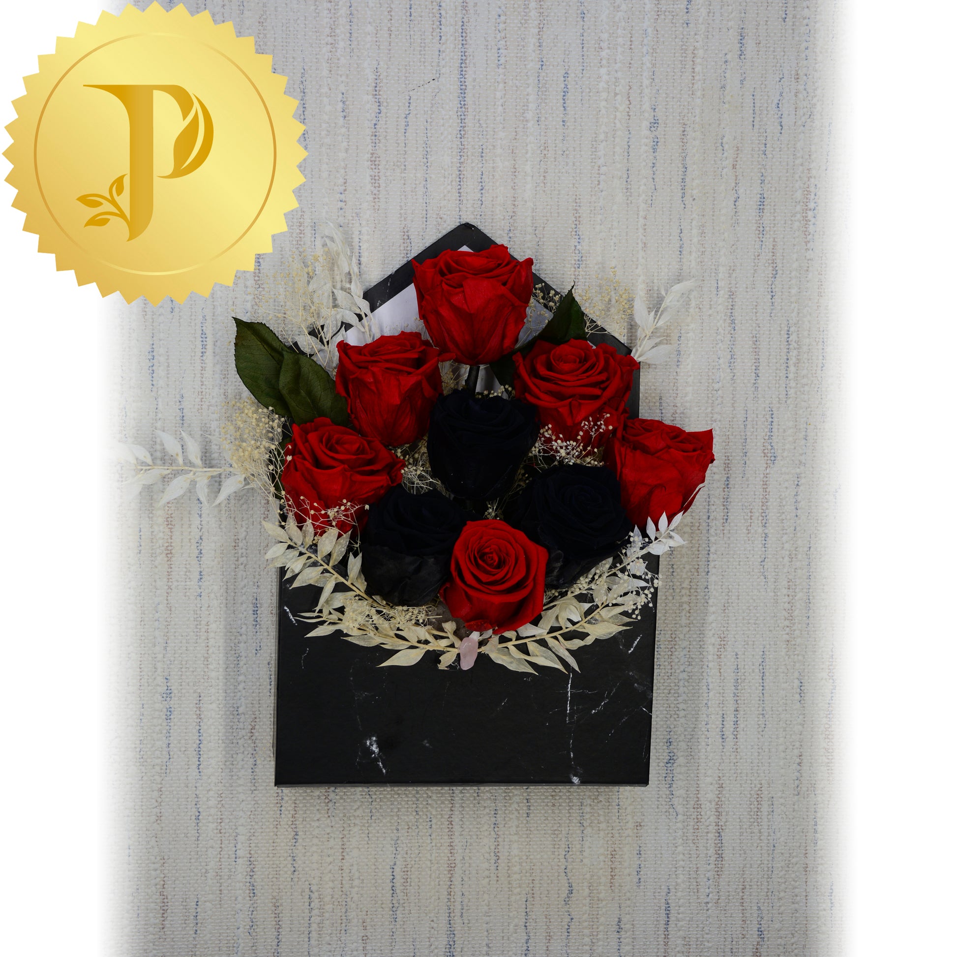 Convey a sweet message of love and friendship with this cute, marbleized envelope design. A combination of nine black and red roses will add a dramatic look to any room. This delightful arrangement is also suitable for hanging (picture hanger included).