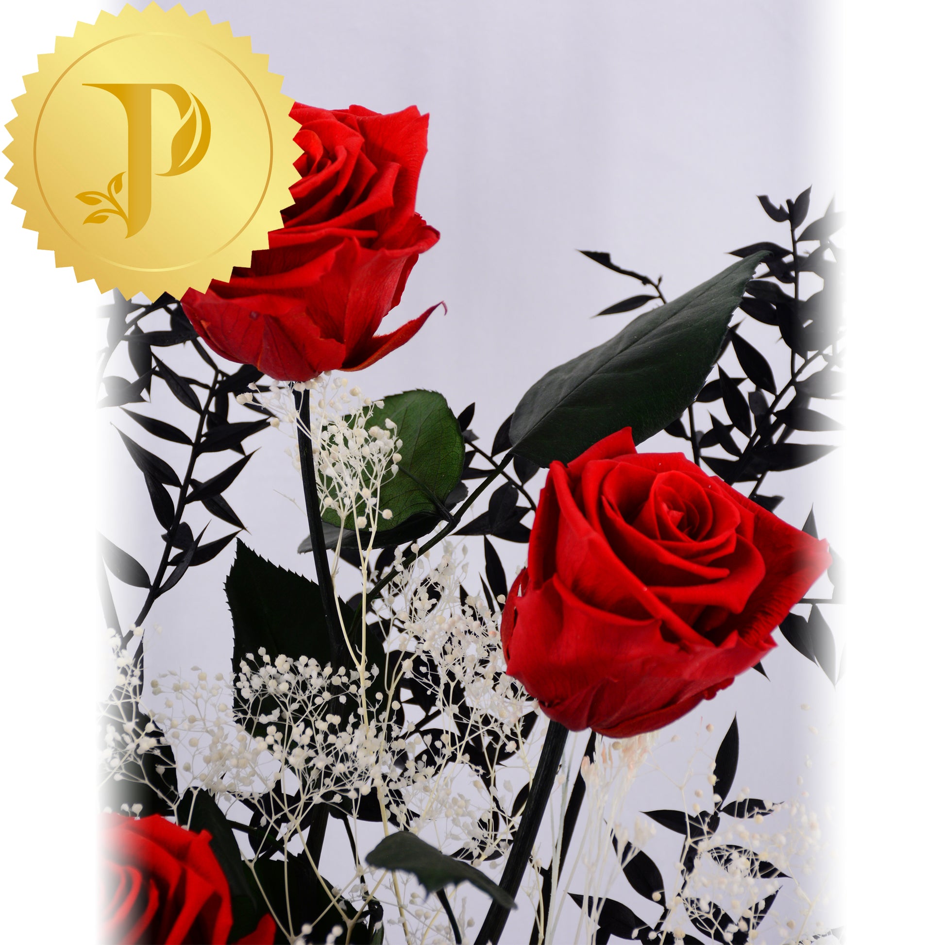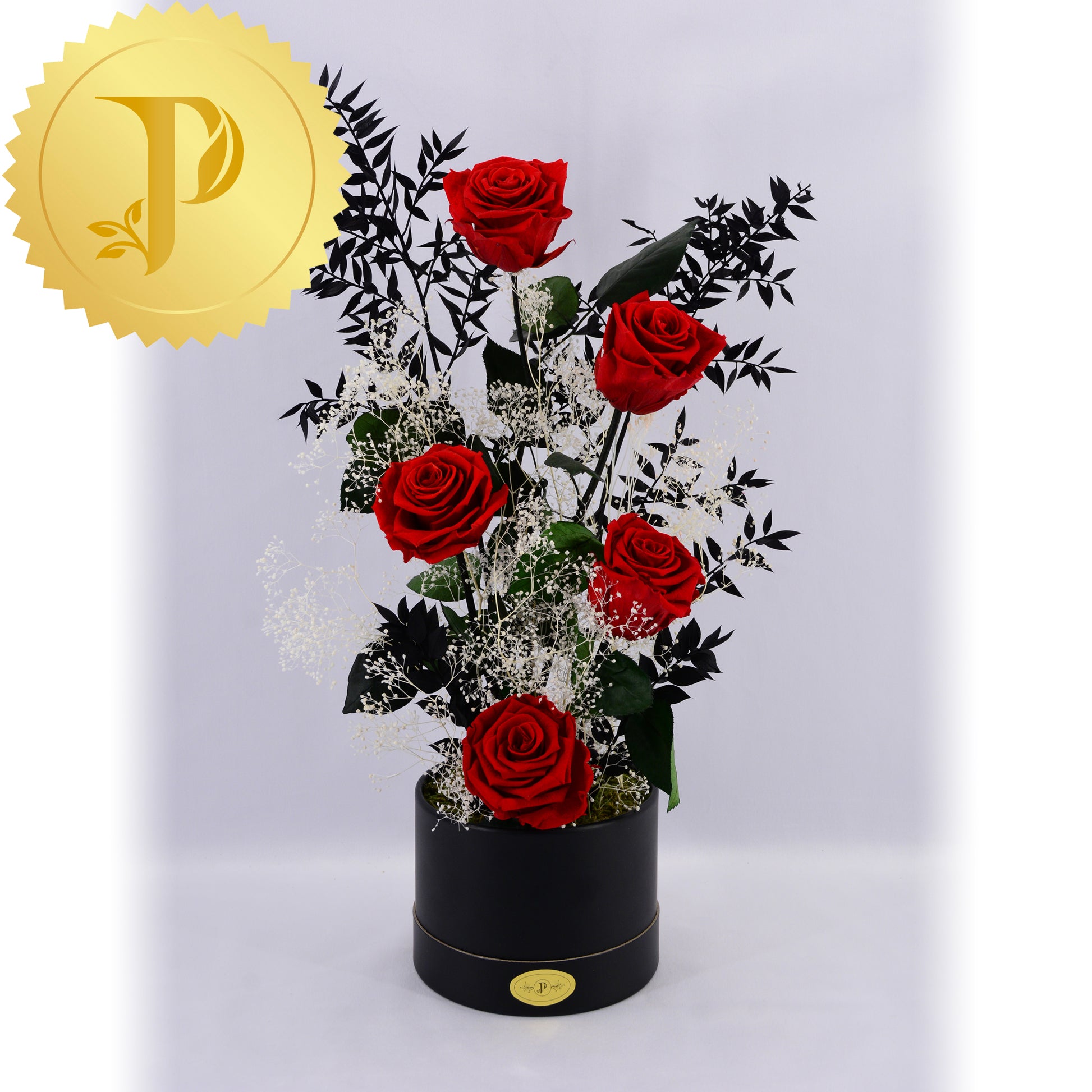 An artistic grouping of five red roses accented with selected preserved filler. The arrangement is placed in a small round black box, adorned with preserved moss to give a more realistic effect.
