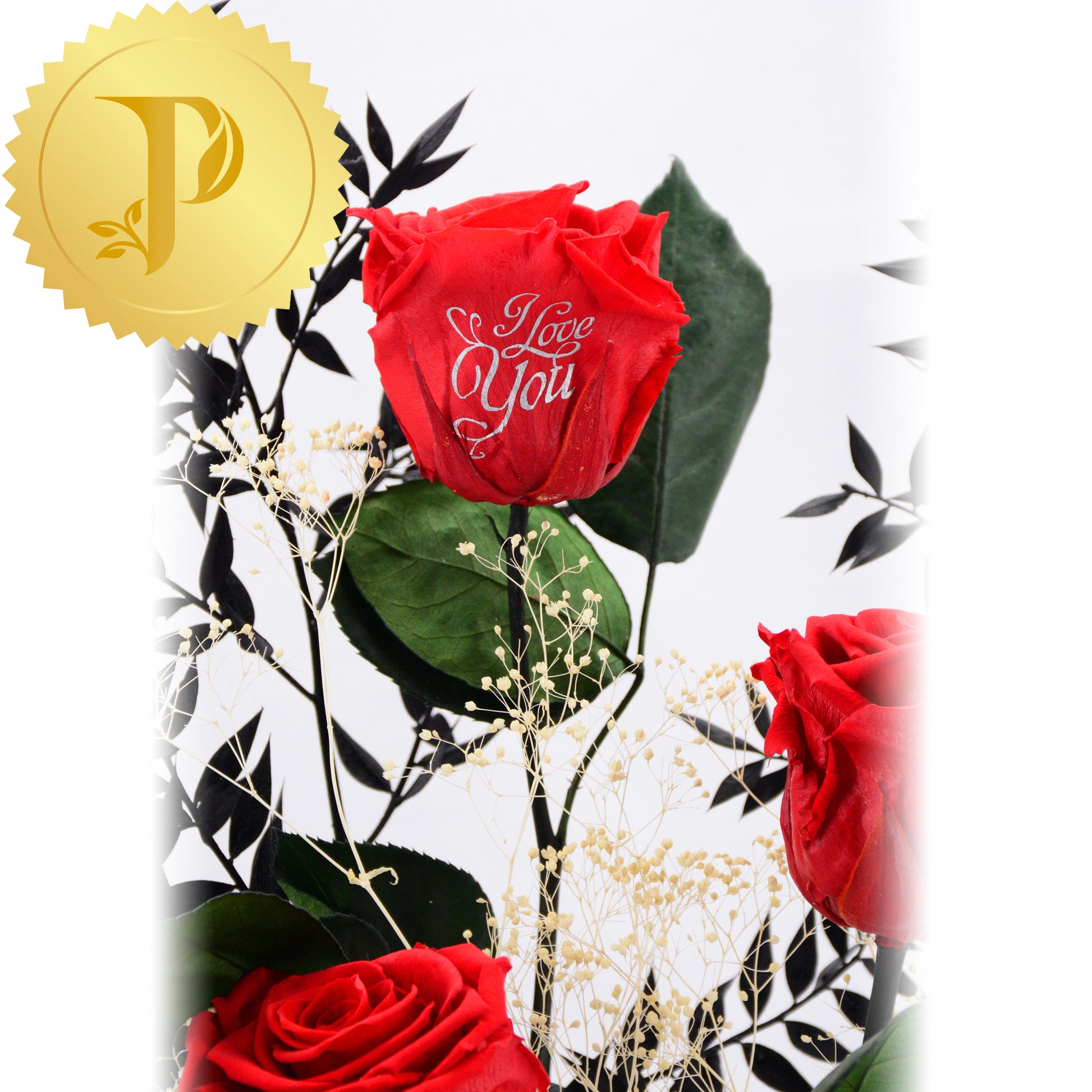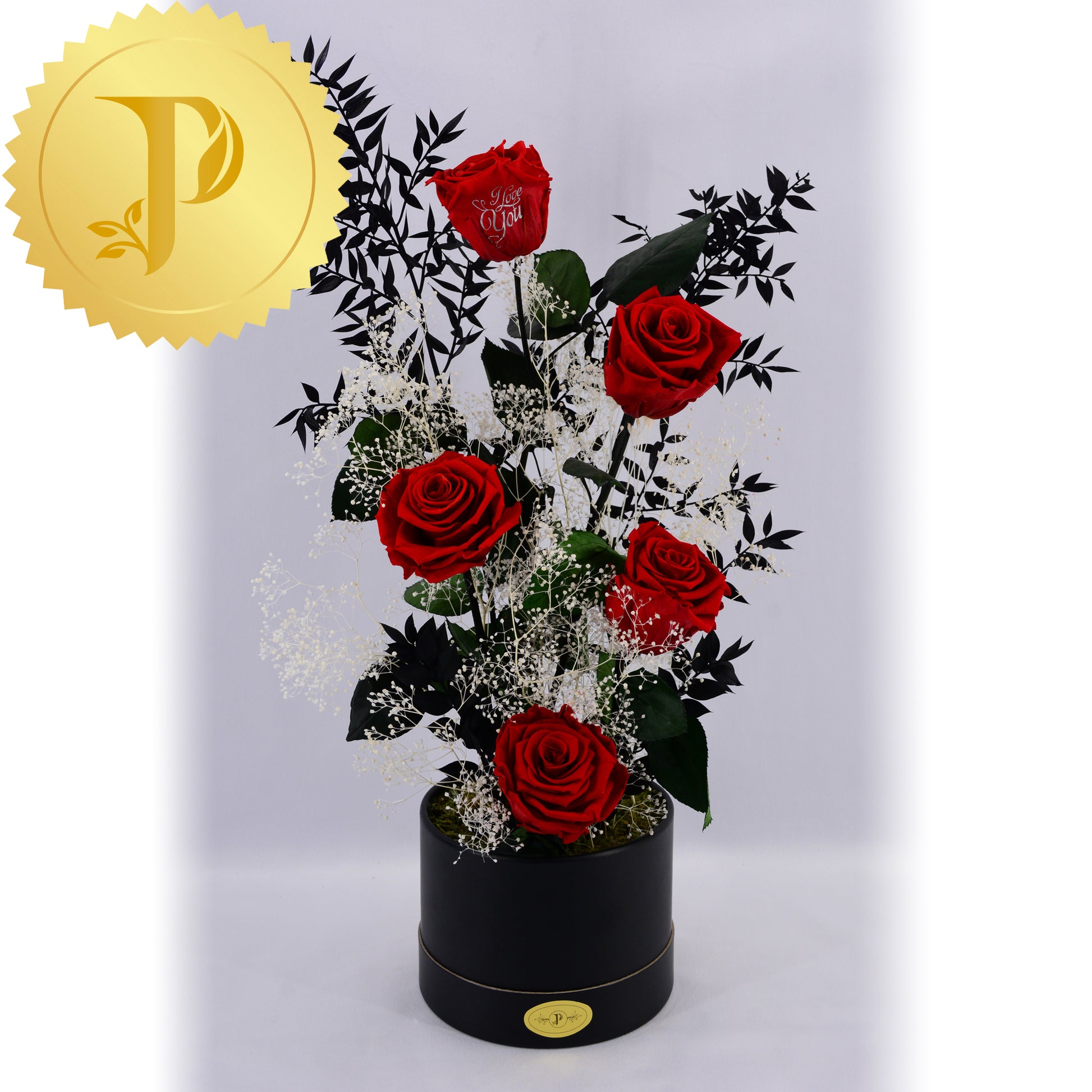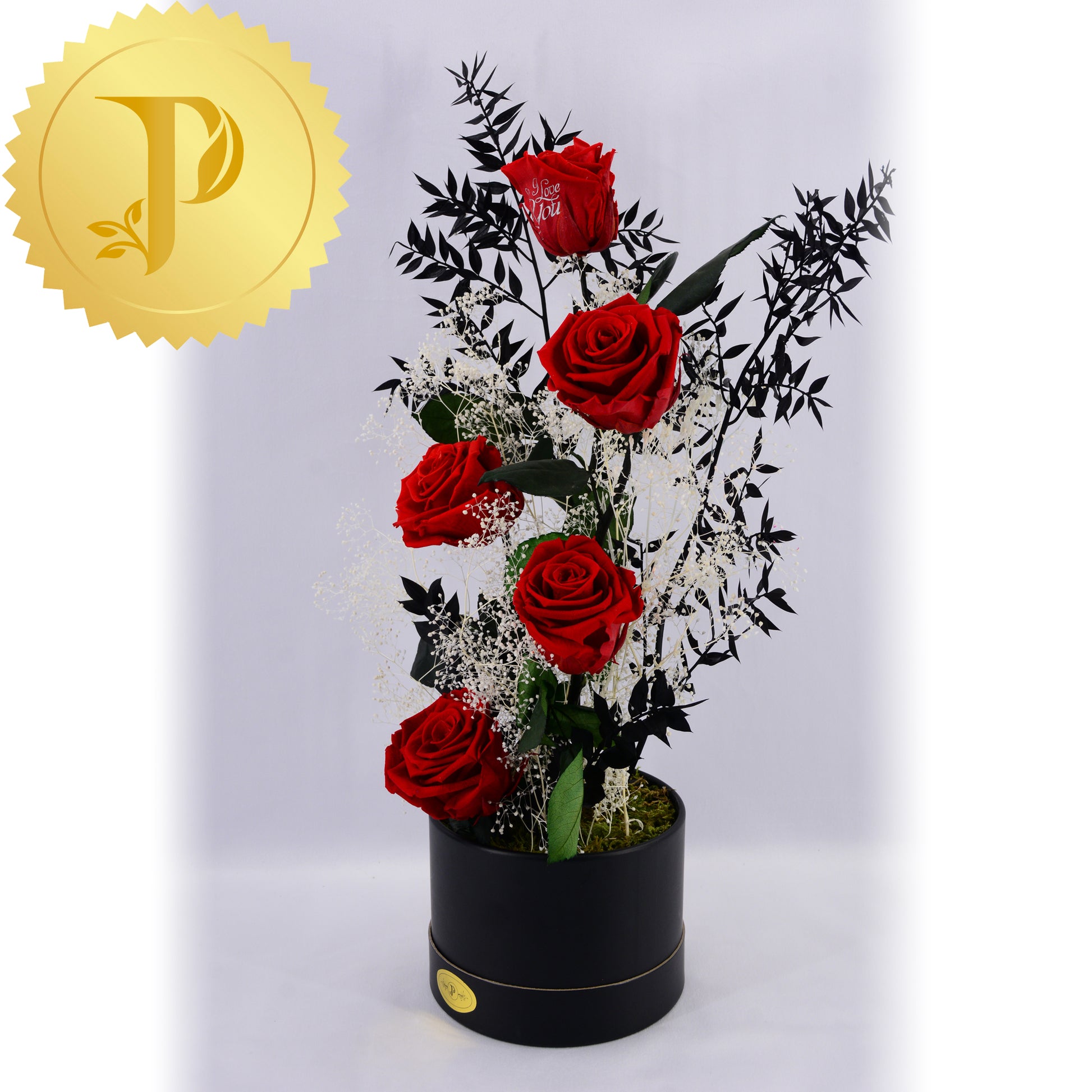 An artistic grouping of five red roses accented with selected preserved filler. The arrangement is placed in a small round black box, adorned with preserved moss to give a more realistic effect.