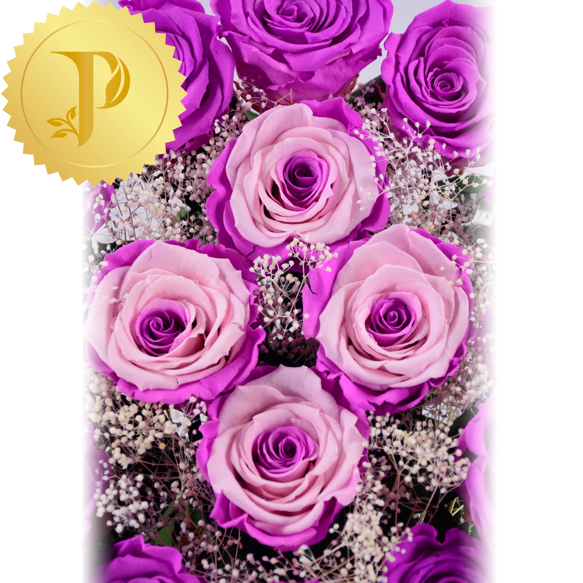 Twelve dark pink coloured roses encircle four matching-coloured pink roses enhanced by a matching eye, highlighted with gypsophila.