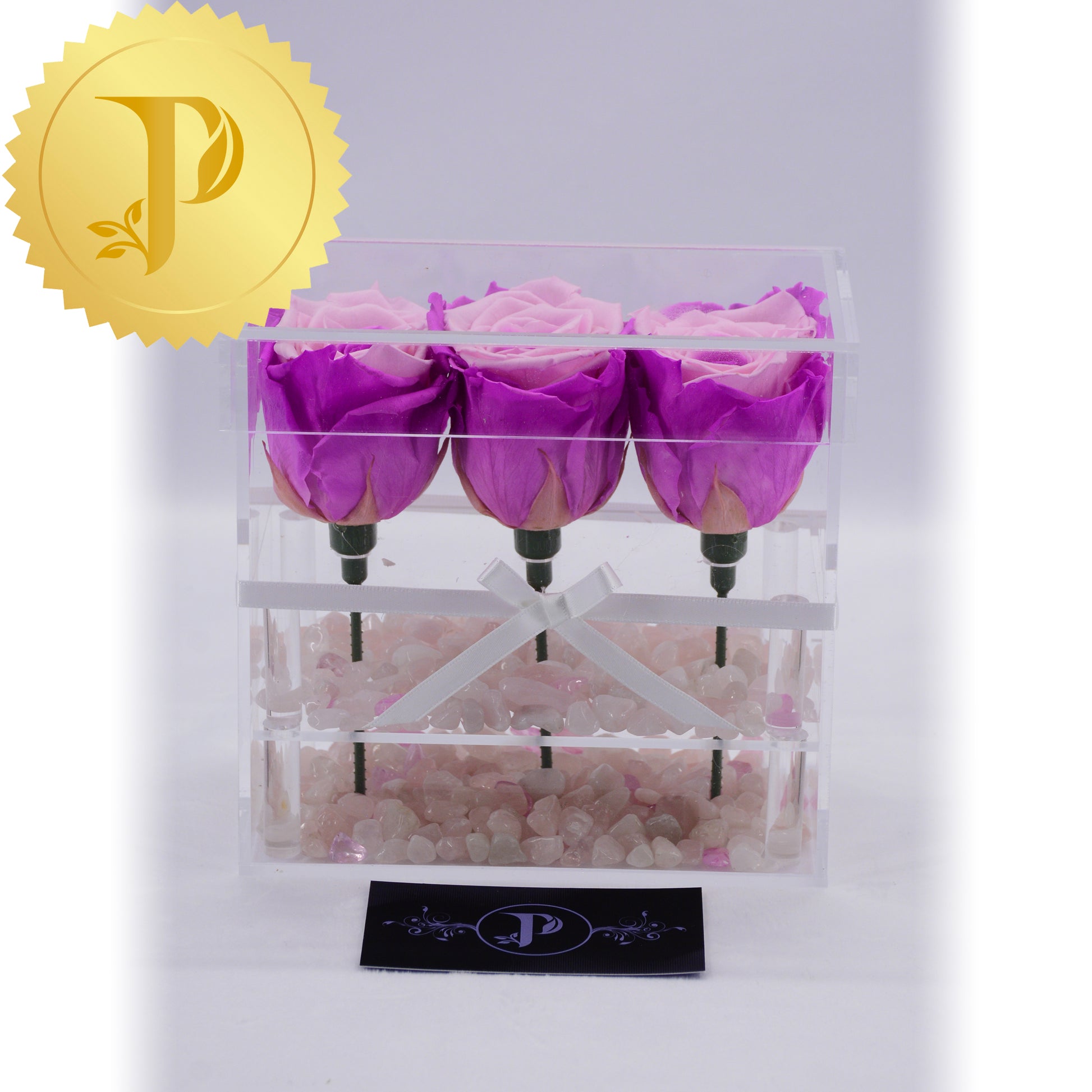 Arrangements in acrylic are available either with a drawer or tall with stems and no drawer. All arrangements come with a layer of your choice of either matching faux pearls, natural stones (lapis lazuli), crystals (clear and rose quartz) or crushed glass (gold). The drawers can be filled with either Ferrero Rocher or Baci chocolates. Acrylic boxes will be highlighted with a white ribbon.