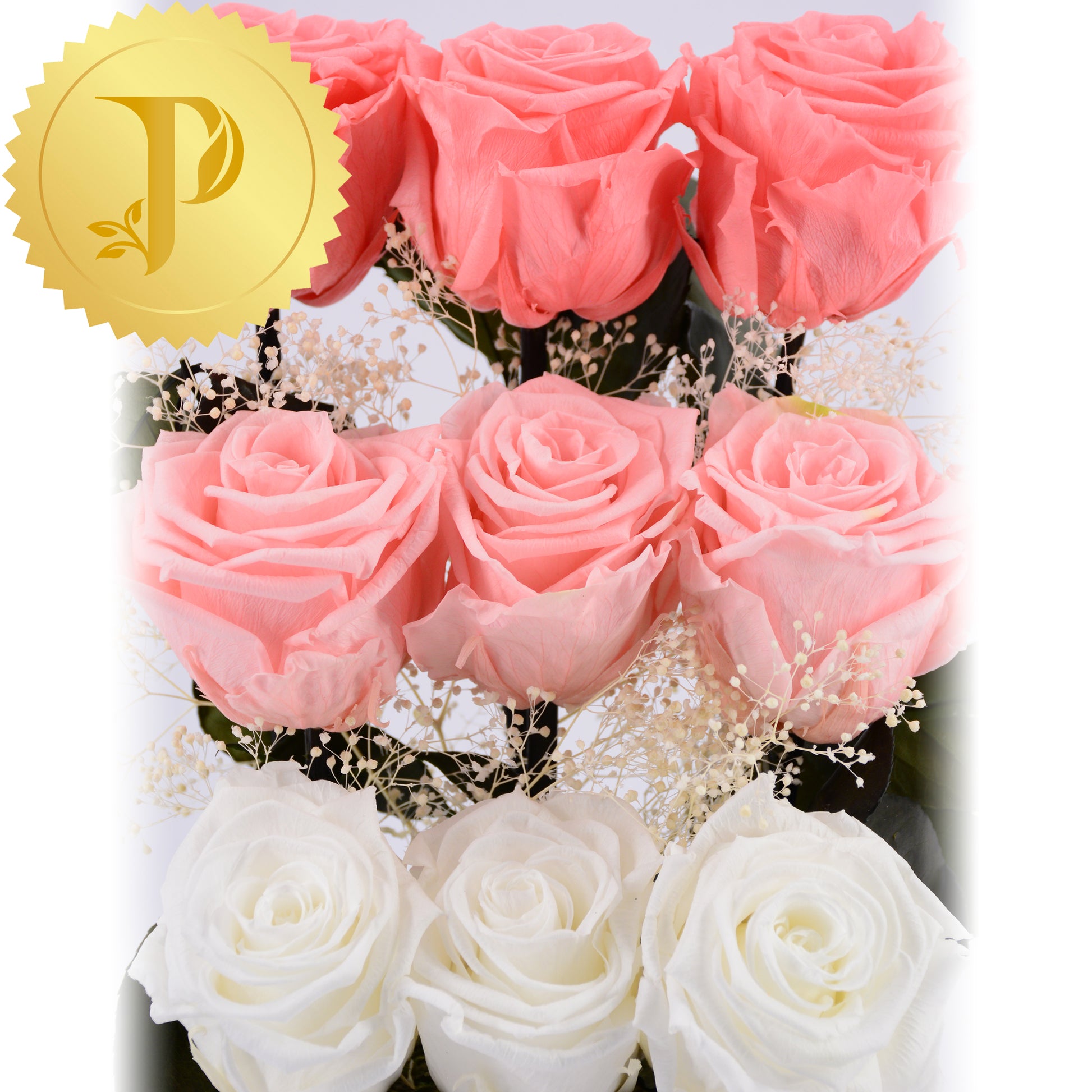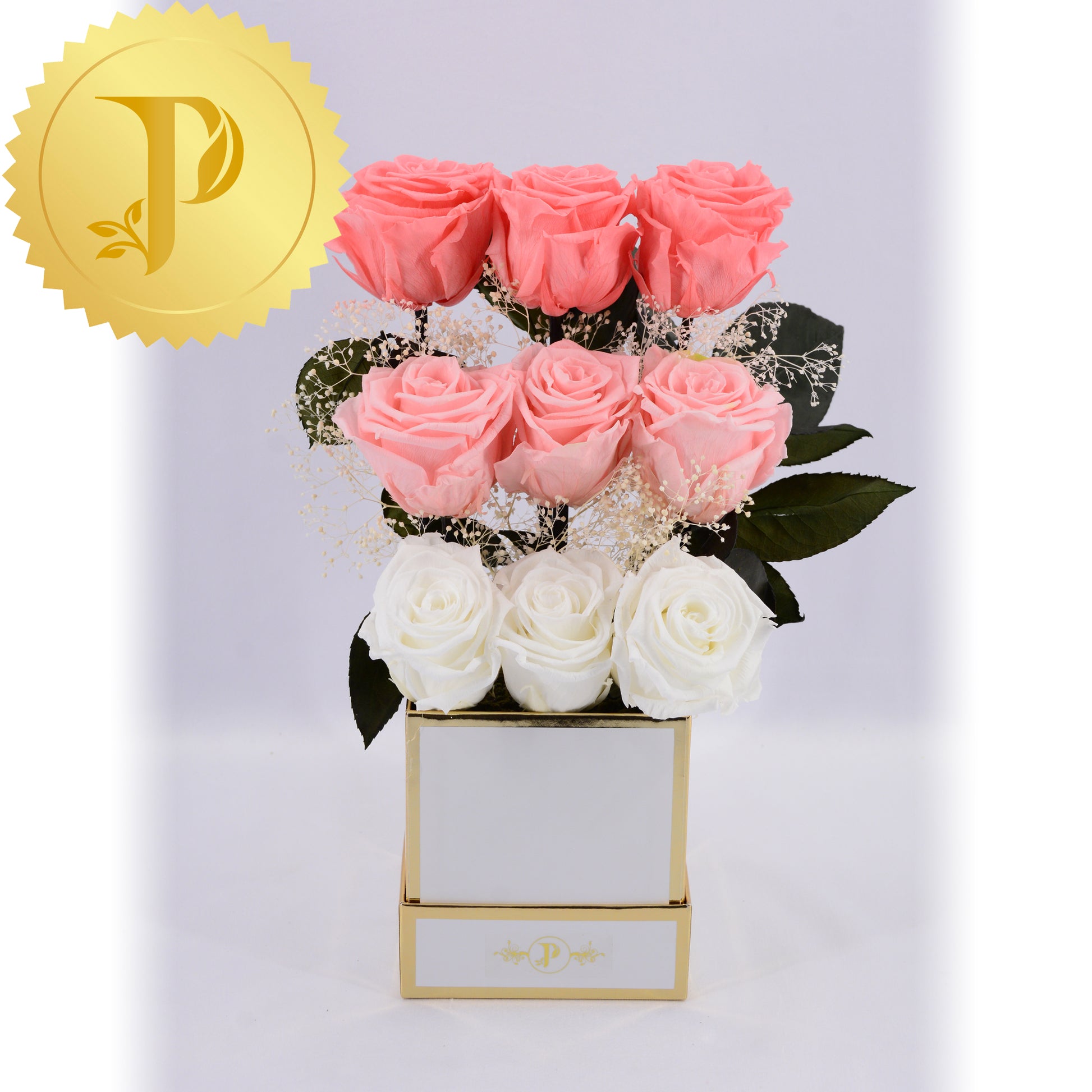 Images of coral beauty radiate in these nine beautiful, tiered roses giving a concert of colour. This delightful arrangement is placed in a square white gold trimmed box, adorned with preserved moss to give a more realistic effect.