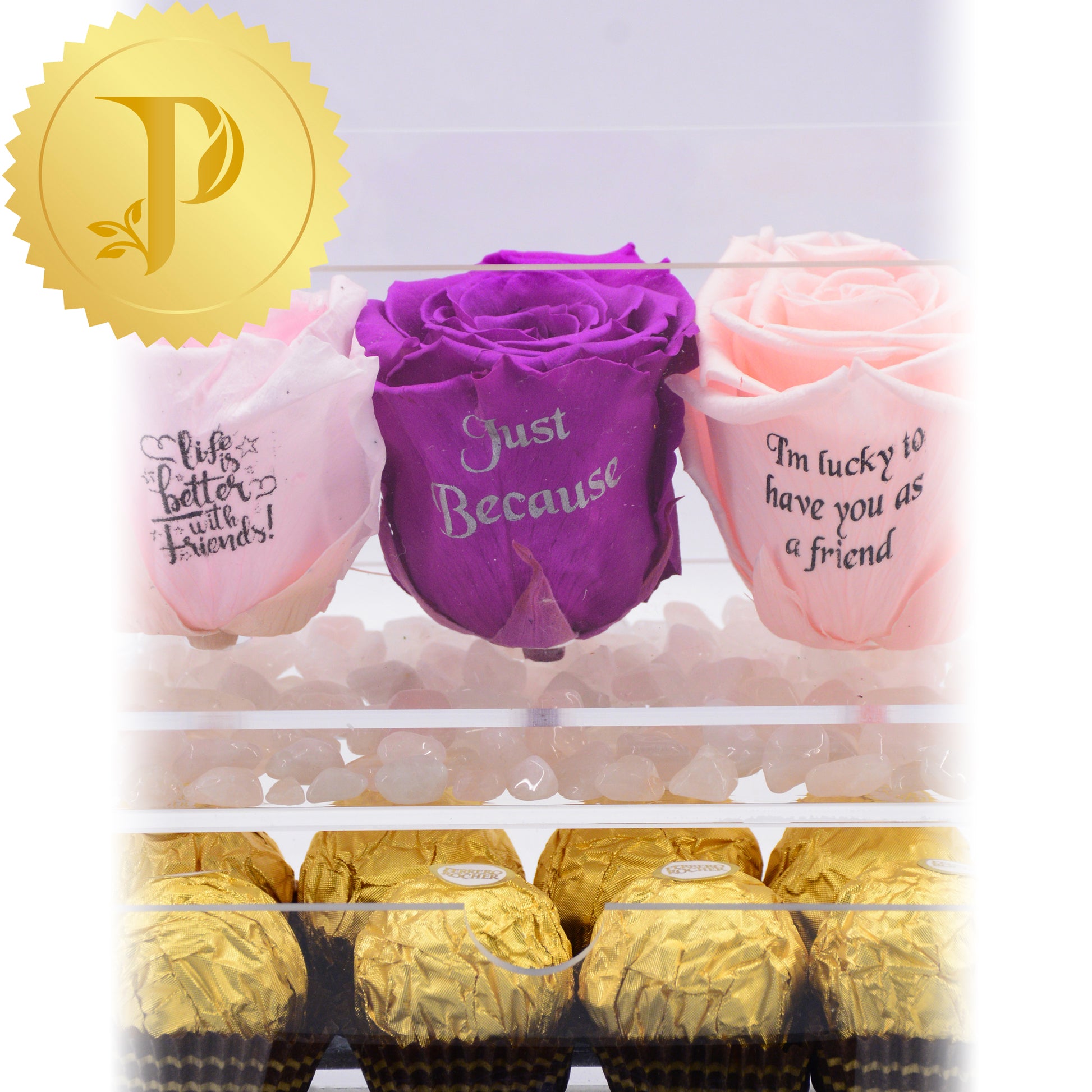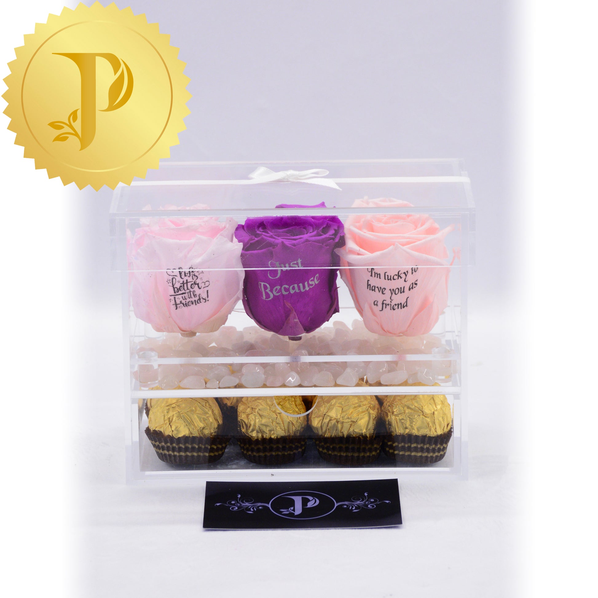 This rose trio in acrylic with light pink and purple-coloured roses are complemented by a layer of rose quartz and a drawer filled with Ferrero Rocher chocolates. Rose quartz is a healing crystal known for promoting love and friendship.