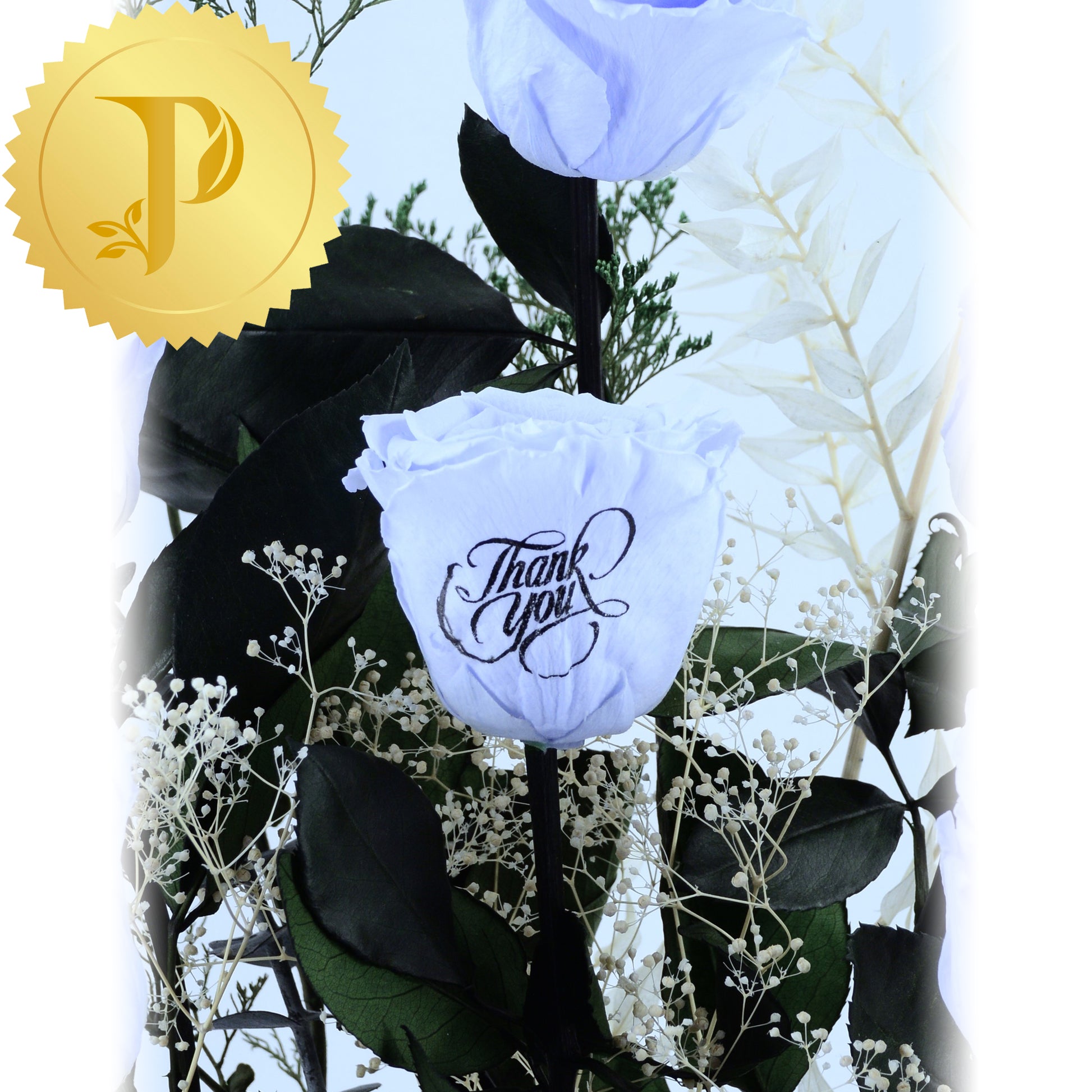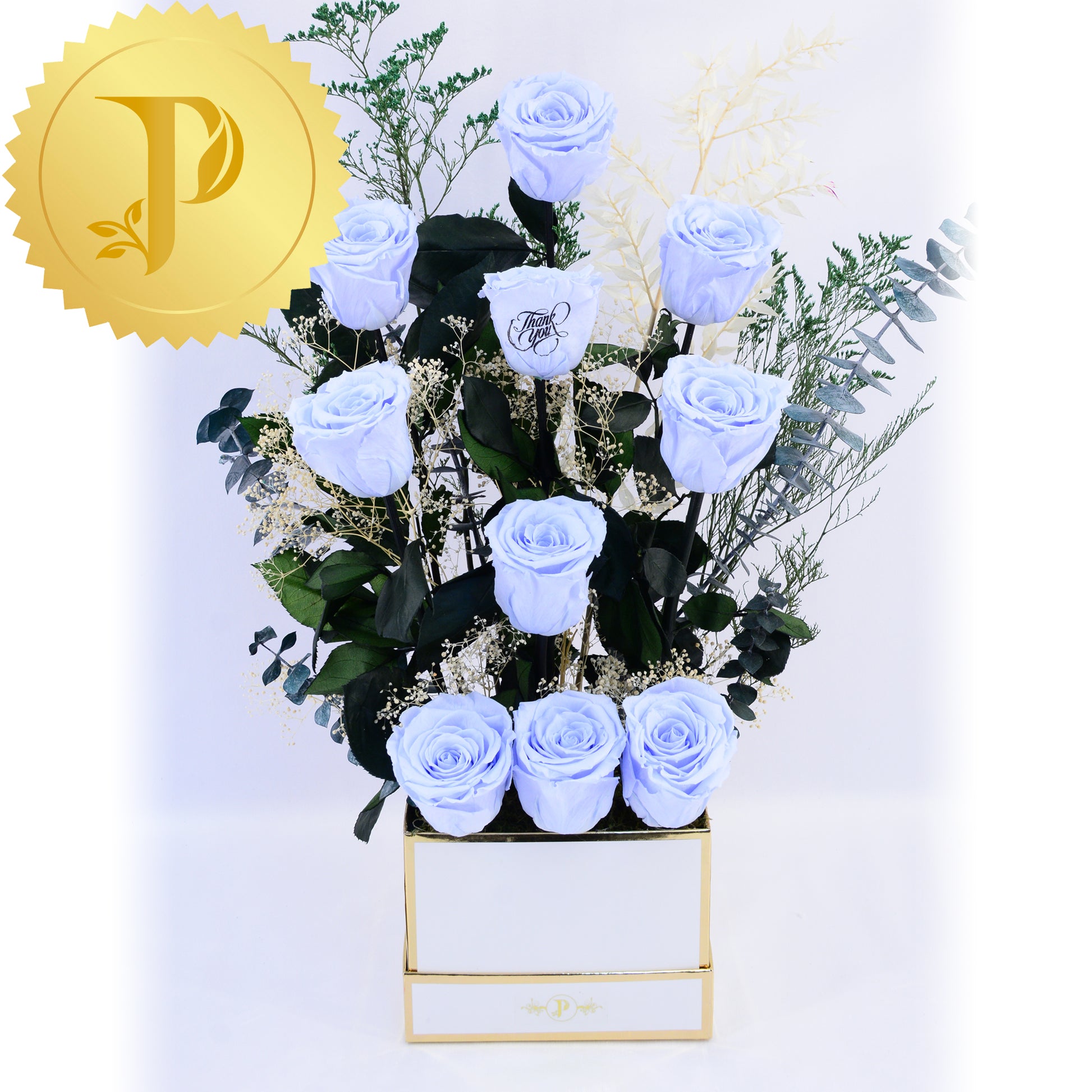 A lovely arrangement of ten cool blue roses elegantly designed and placed in a square white gold trimmed box, with a variety of selected filler to enhance its’ beauty. An expressive tribute for a special occasion that will complement any décor at home or at the workplace.