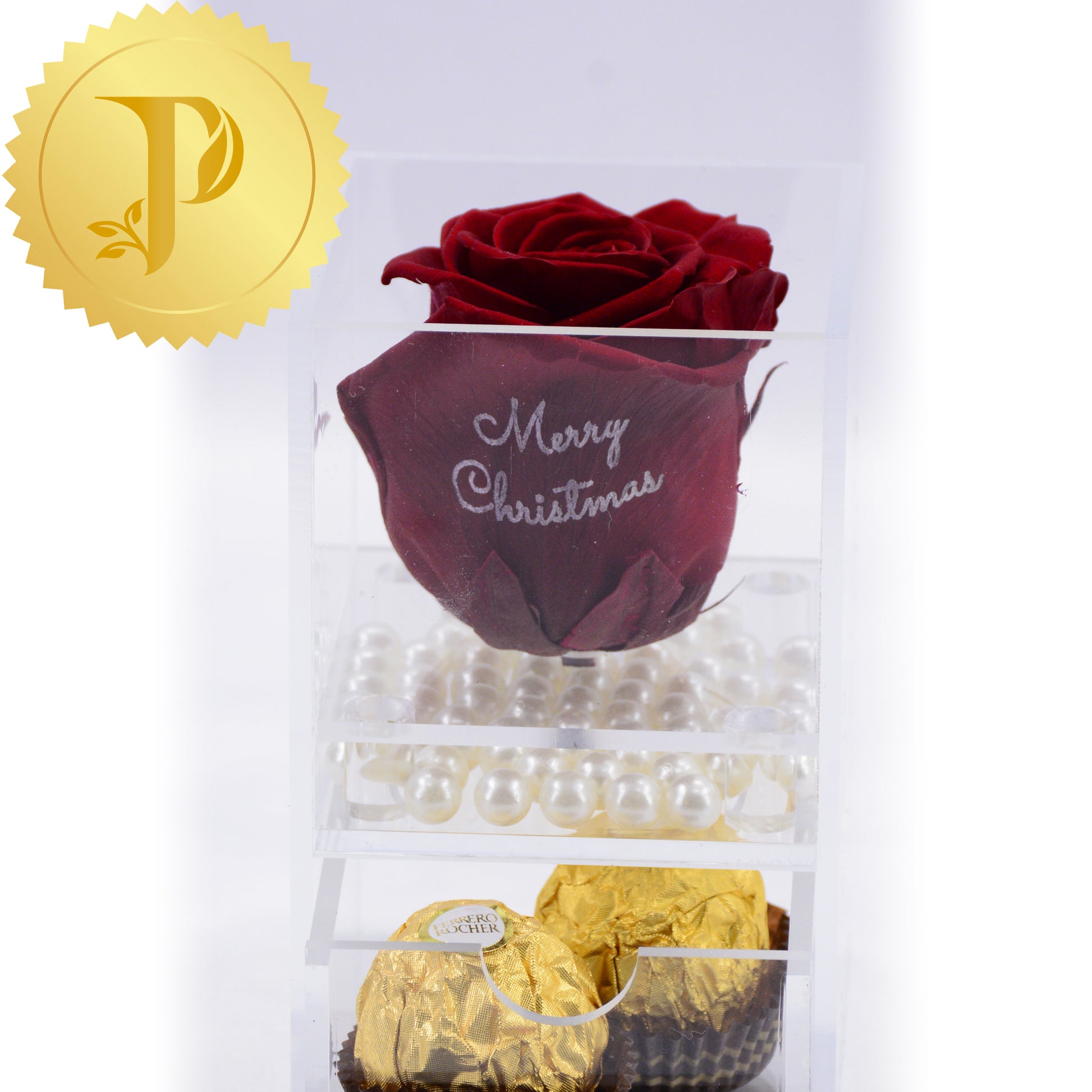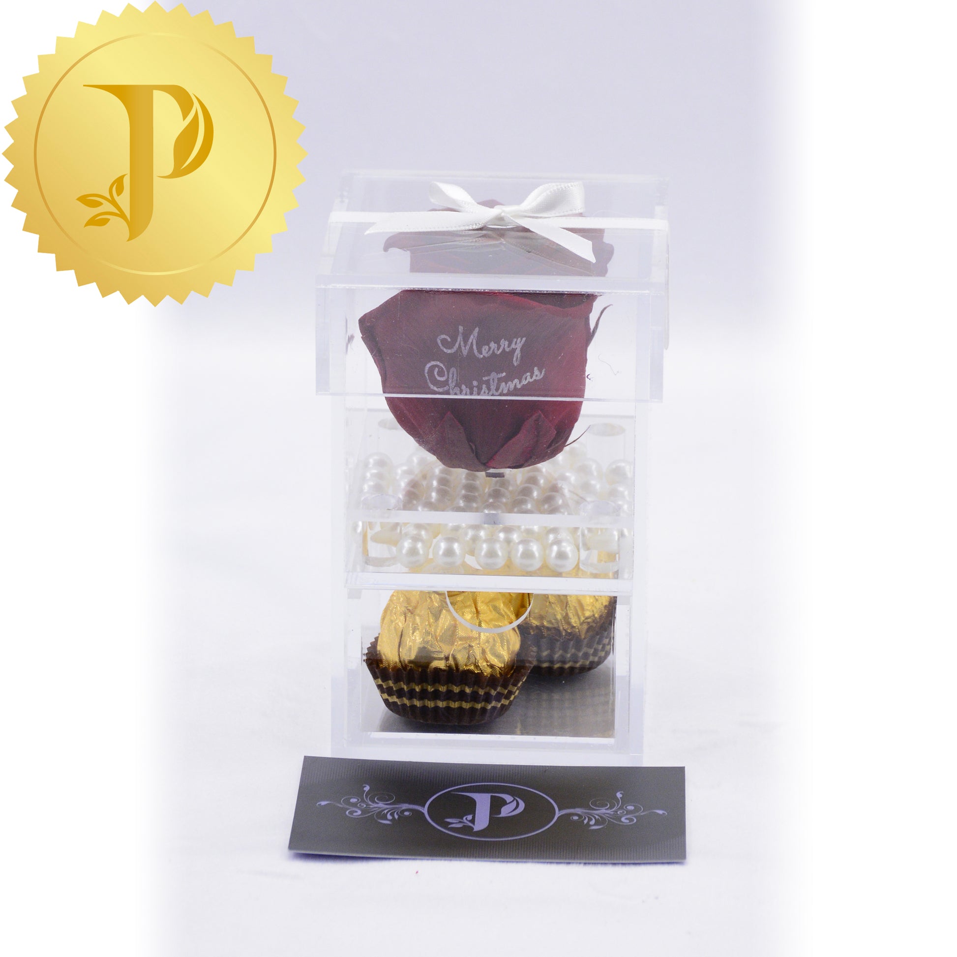 Celebrate some Christmas cheer with our deep burgundy rose in a clear acrylic box complemented by a layer of faux silver pearls and Ferrero Rocher chocolates.