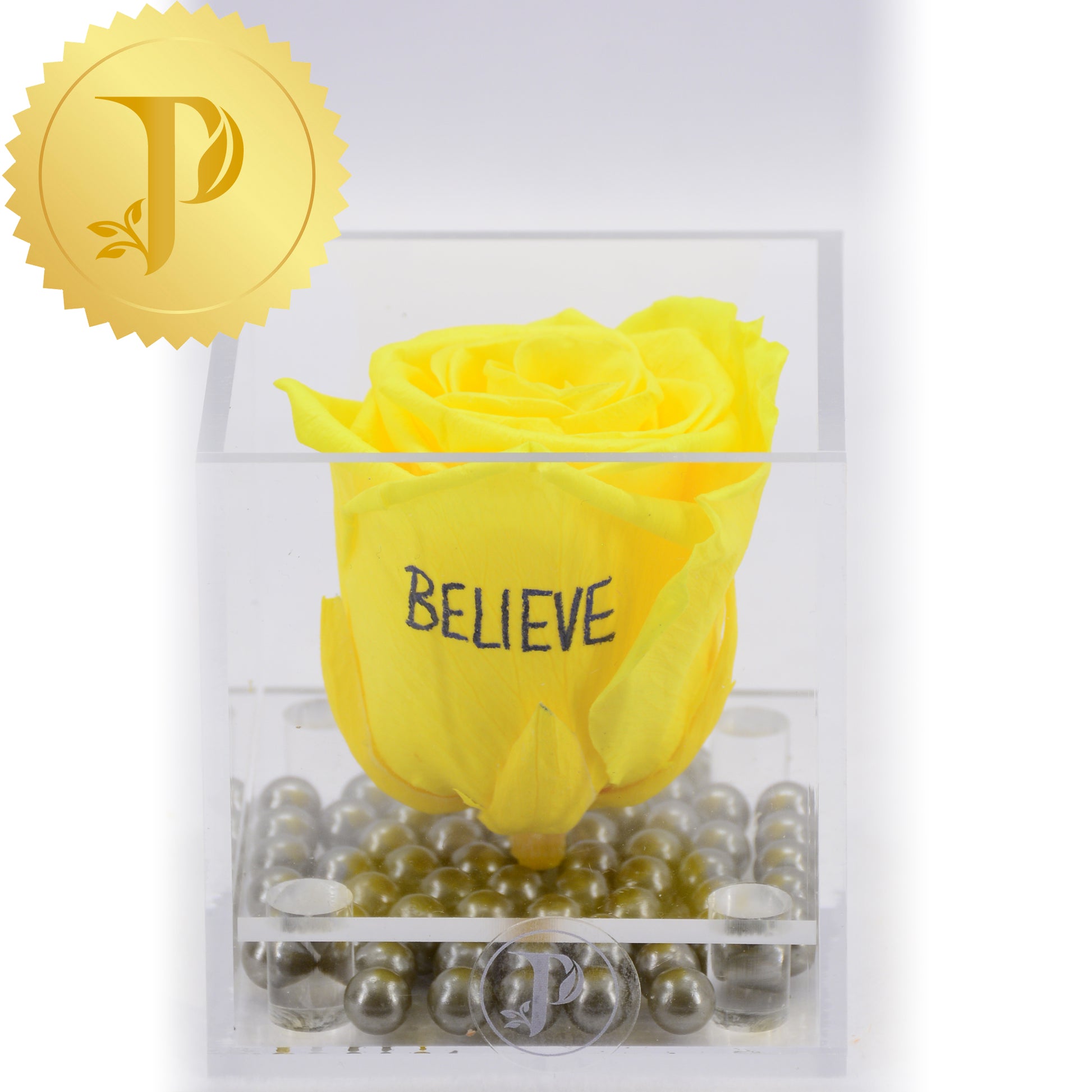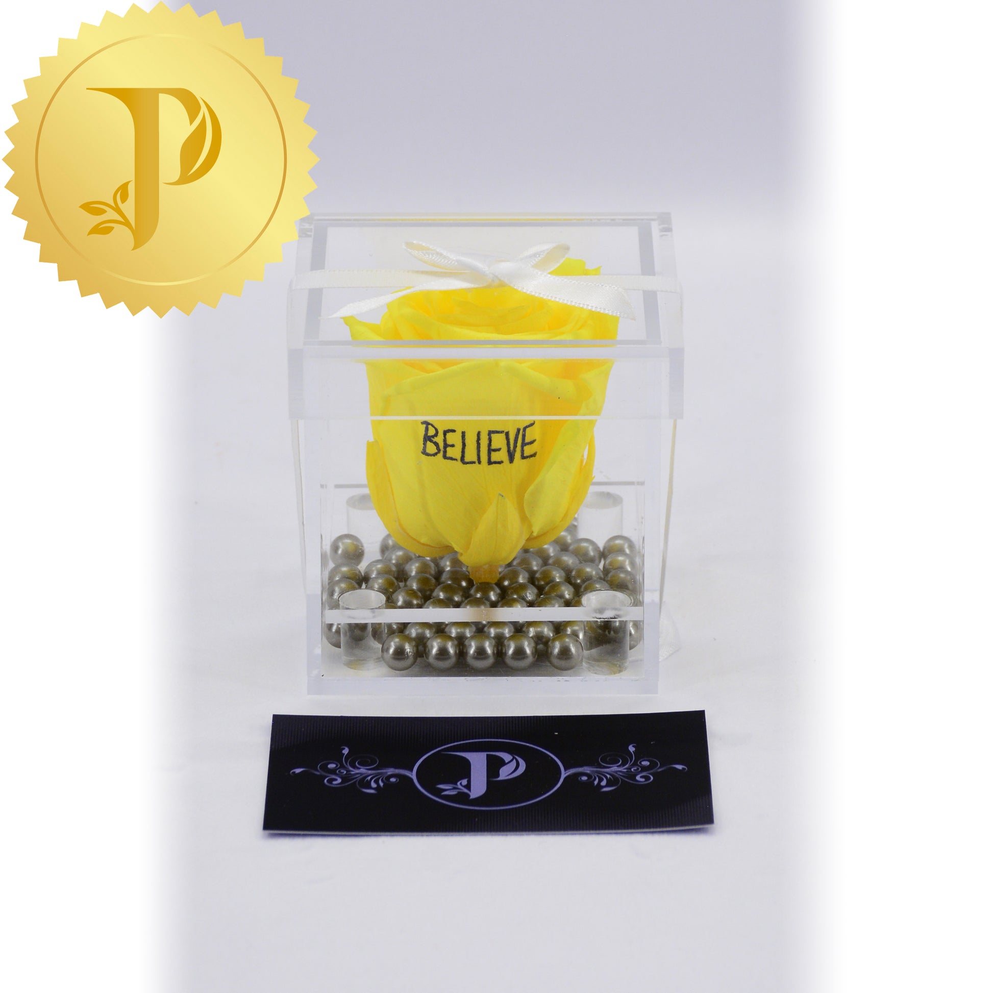 Small and thoughtful embodies this cheery single yellow rose in a small acrylic box with a layer of faux silver pearls. A great gift idea that can go anywhere in the home… or the workplace, even small enough to fit on a desk.