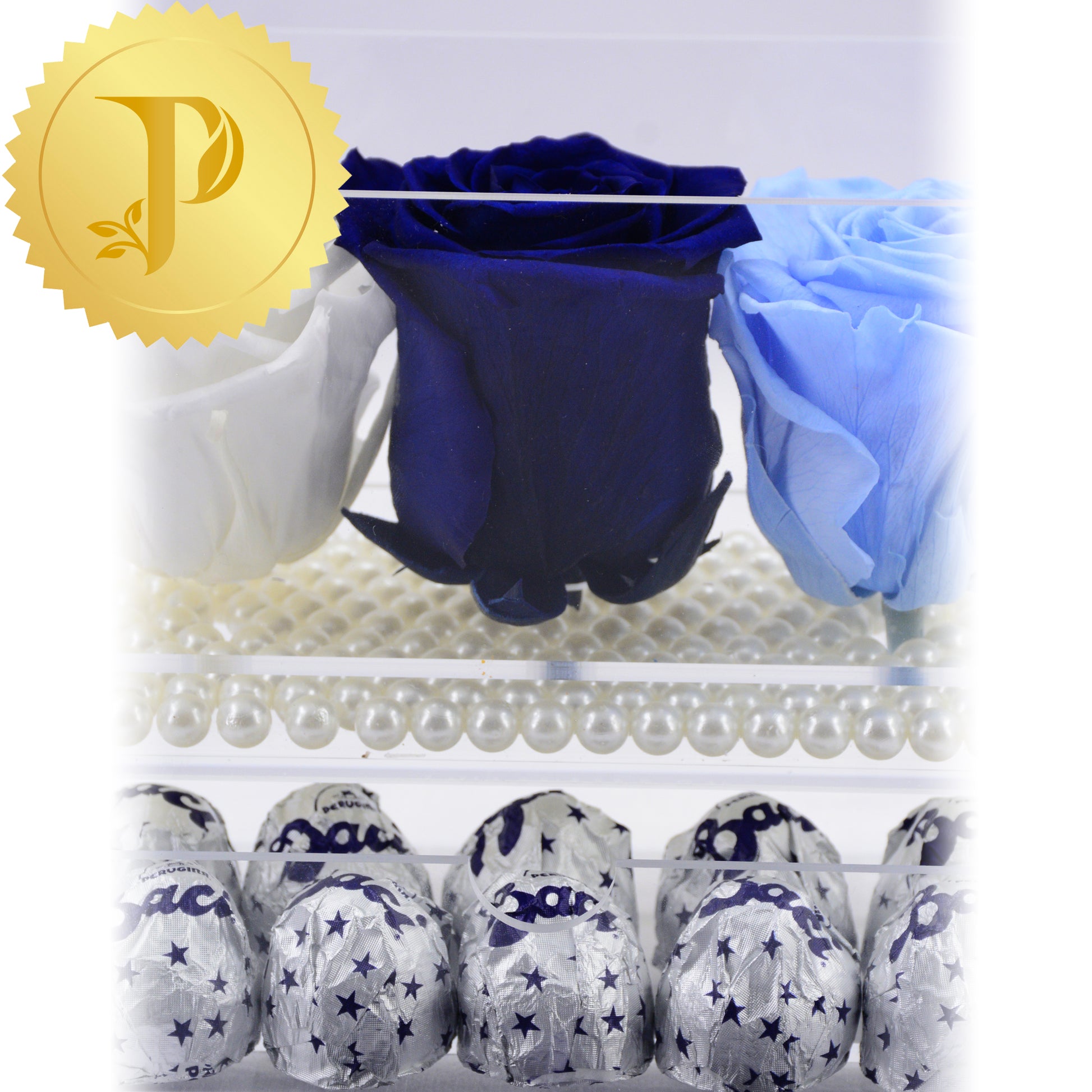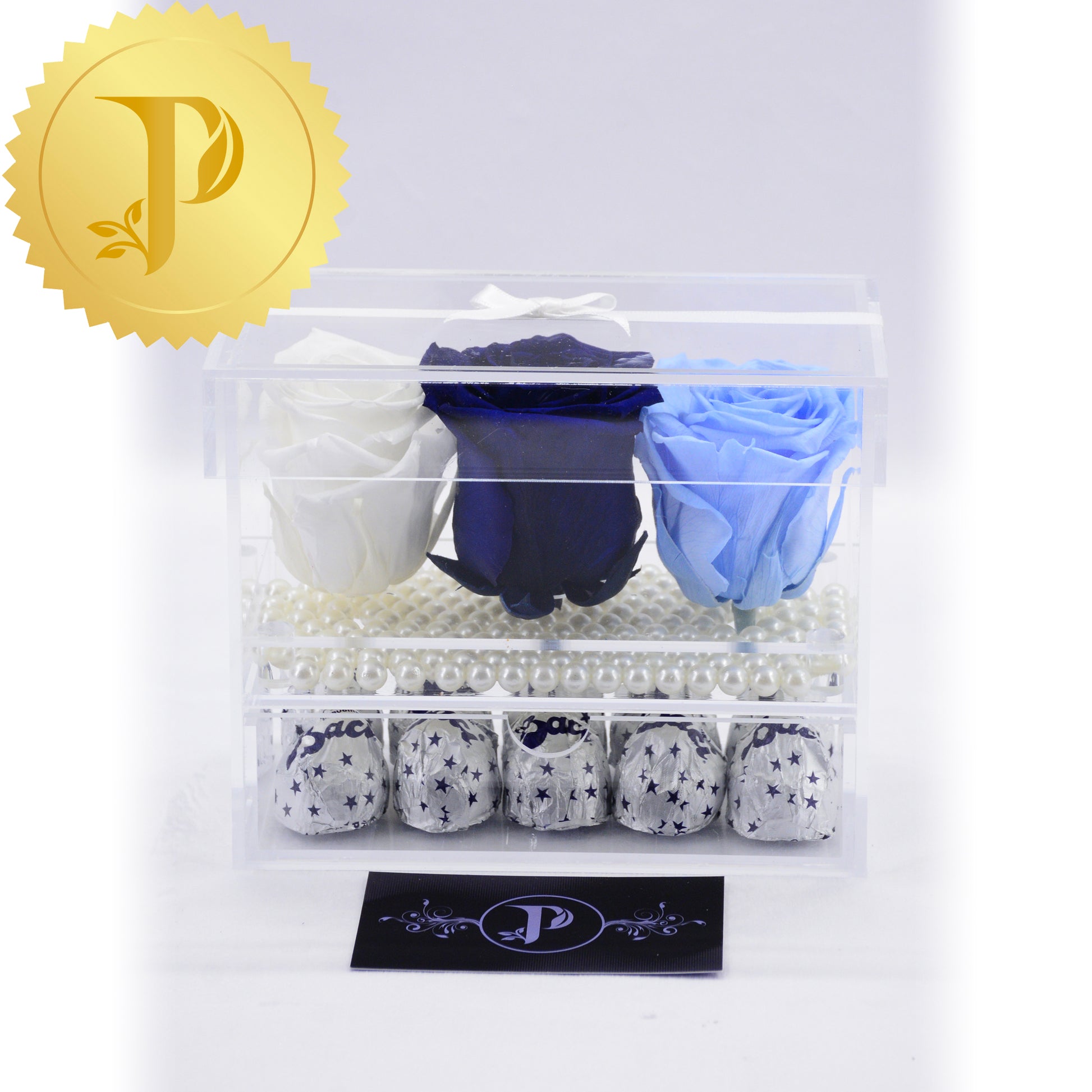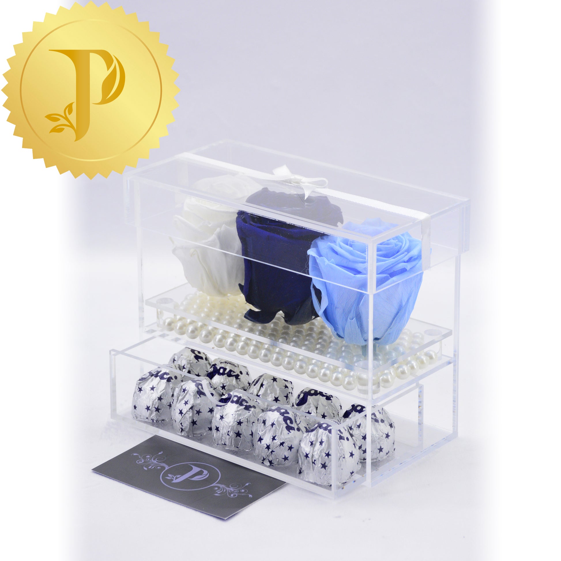 Celebrate your friends during the winter and all year round with this cool colour rose trio. This rose trio in acrylic with blues and bright white roses are complemented by a layer of faux white pearls and a drawer filled with Baci chocolates.