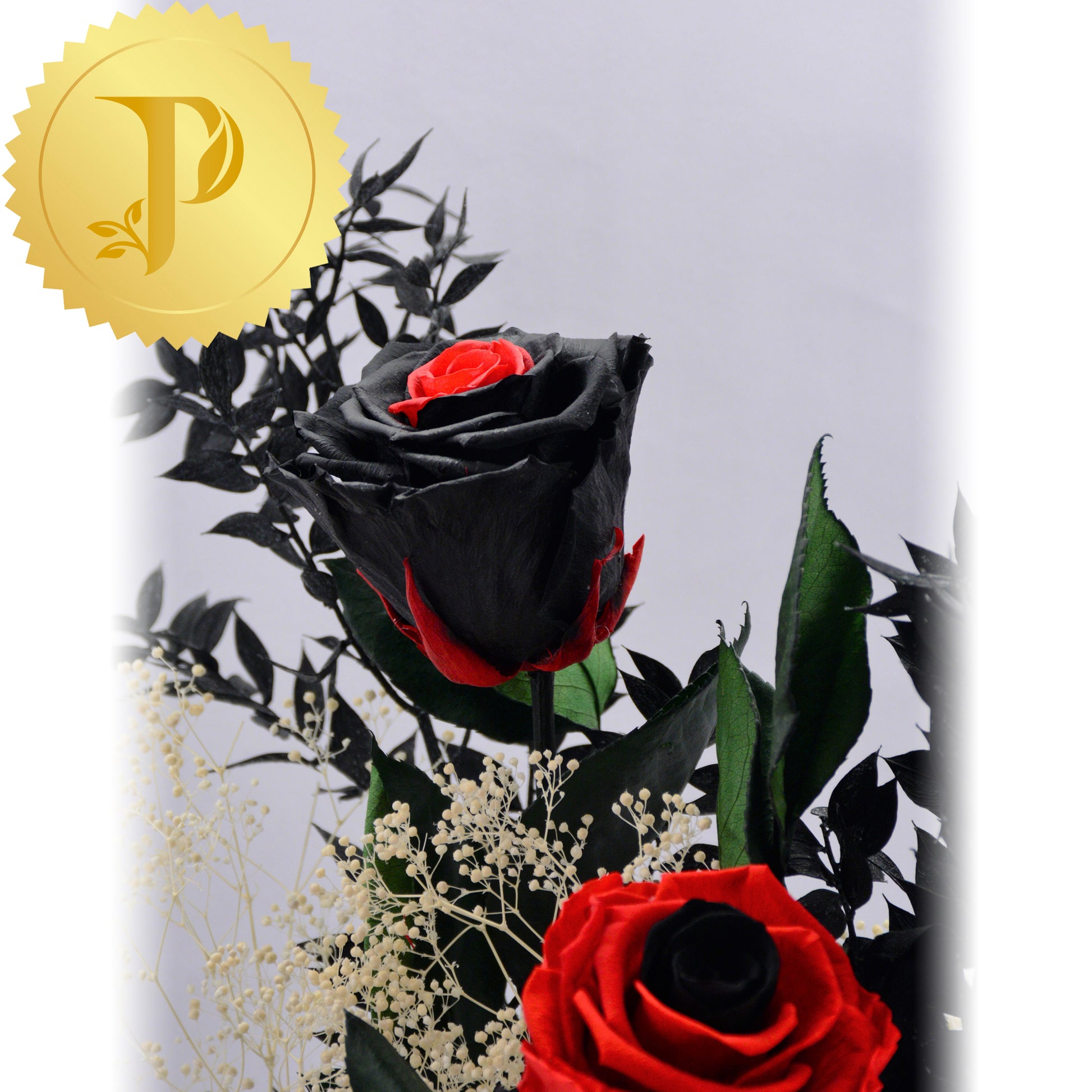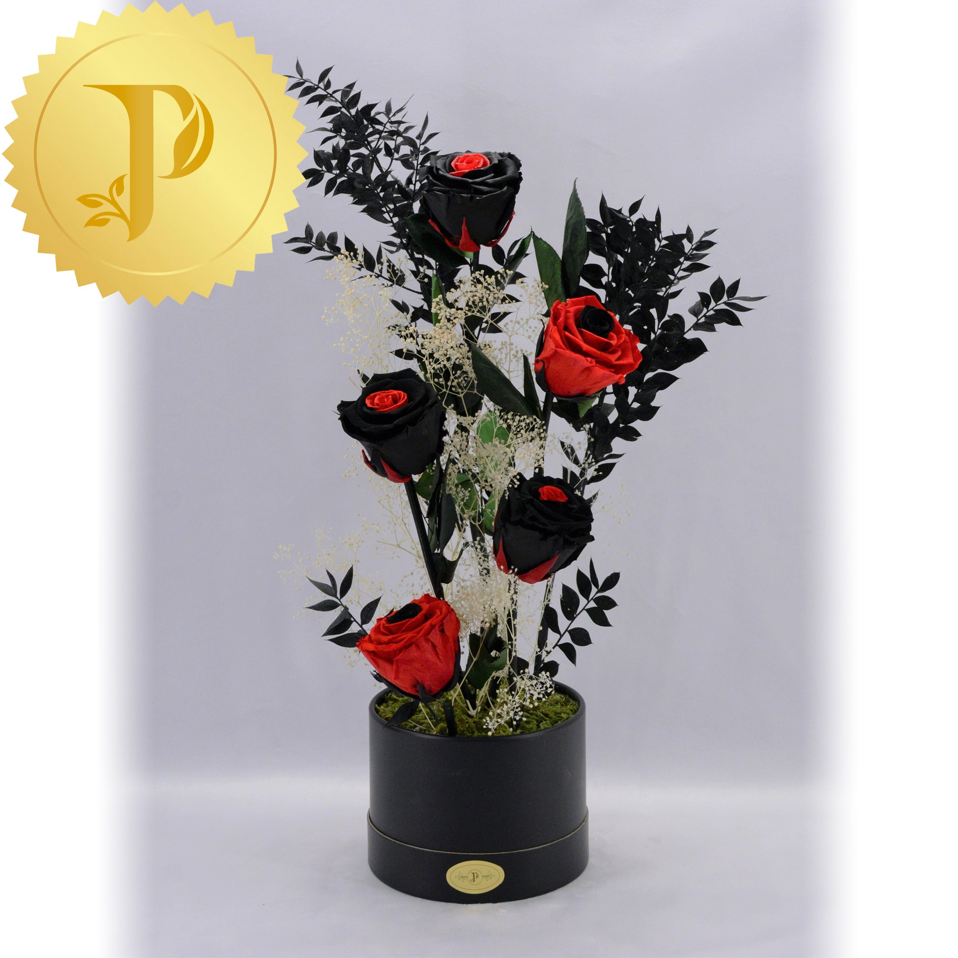 An artistic grouping of five red and black roses with striking centres are accented with selected preserved filler. This dramatic arrangement is placed in a small round black box, adorned with preserved moss to give a more realistic effect.