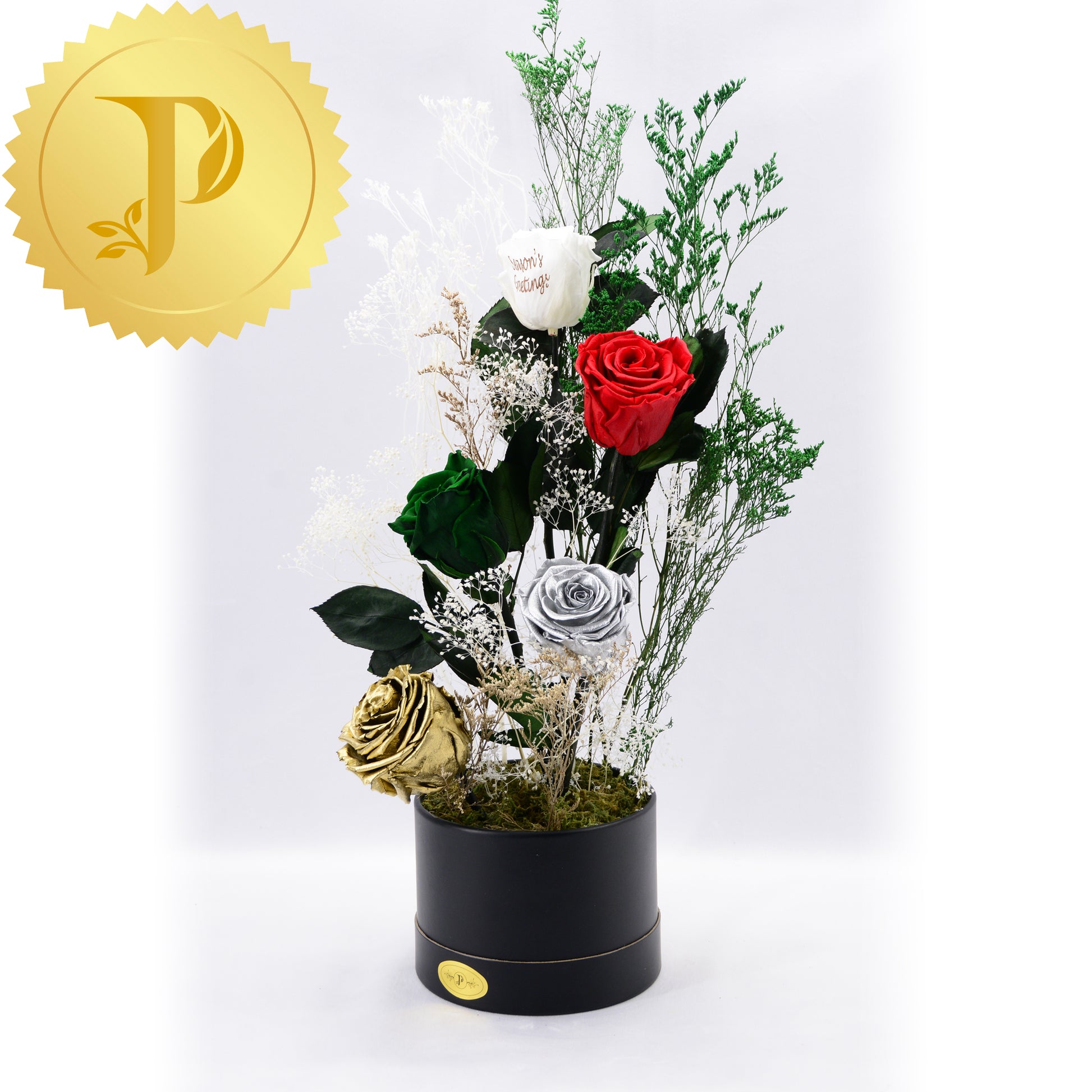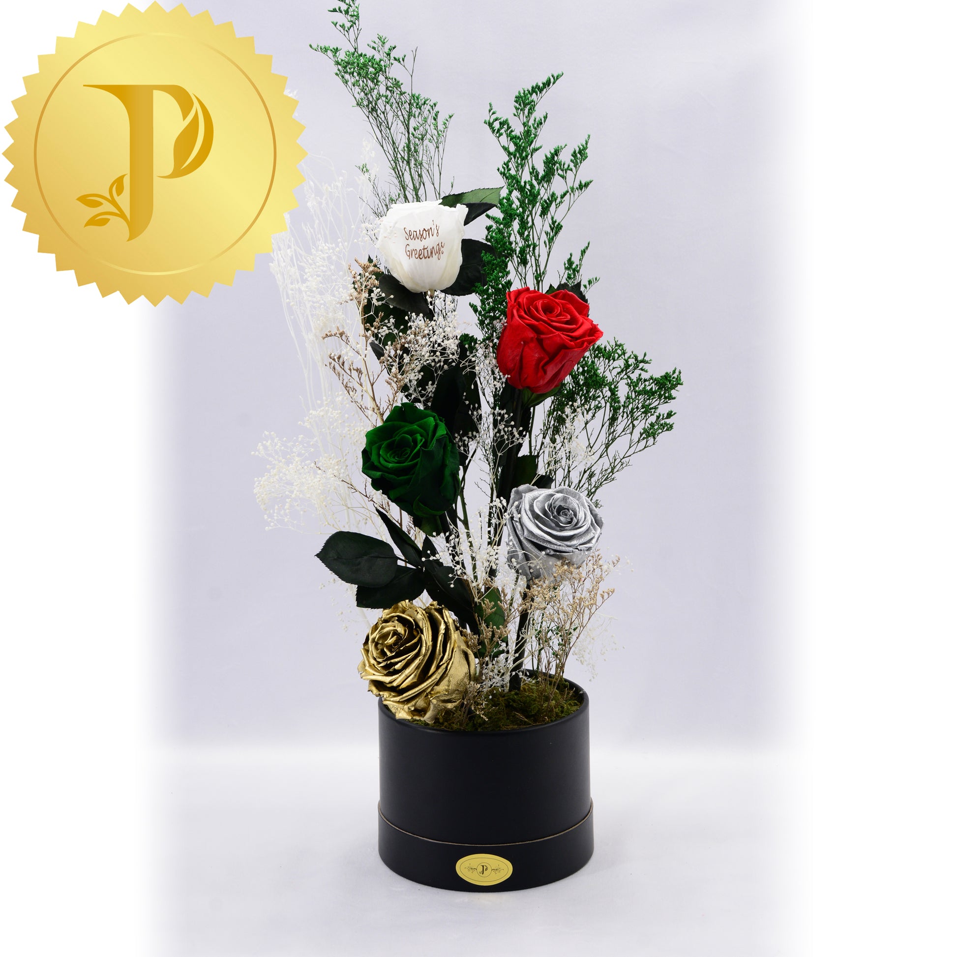 An artistic grouping of five complementary holiday-coloured roses of red, white, green, silver and gold, accented with selected preserved filler. The arrangement is placed in a small round white box, adorned with preserved moss to give a more realistic effect.