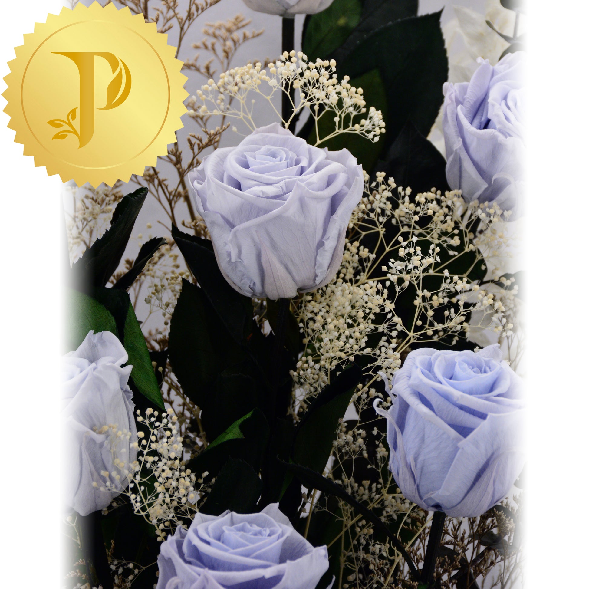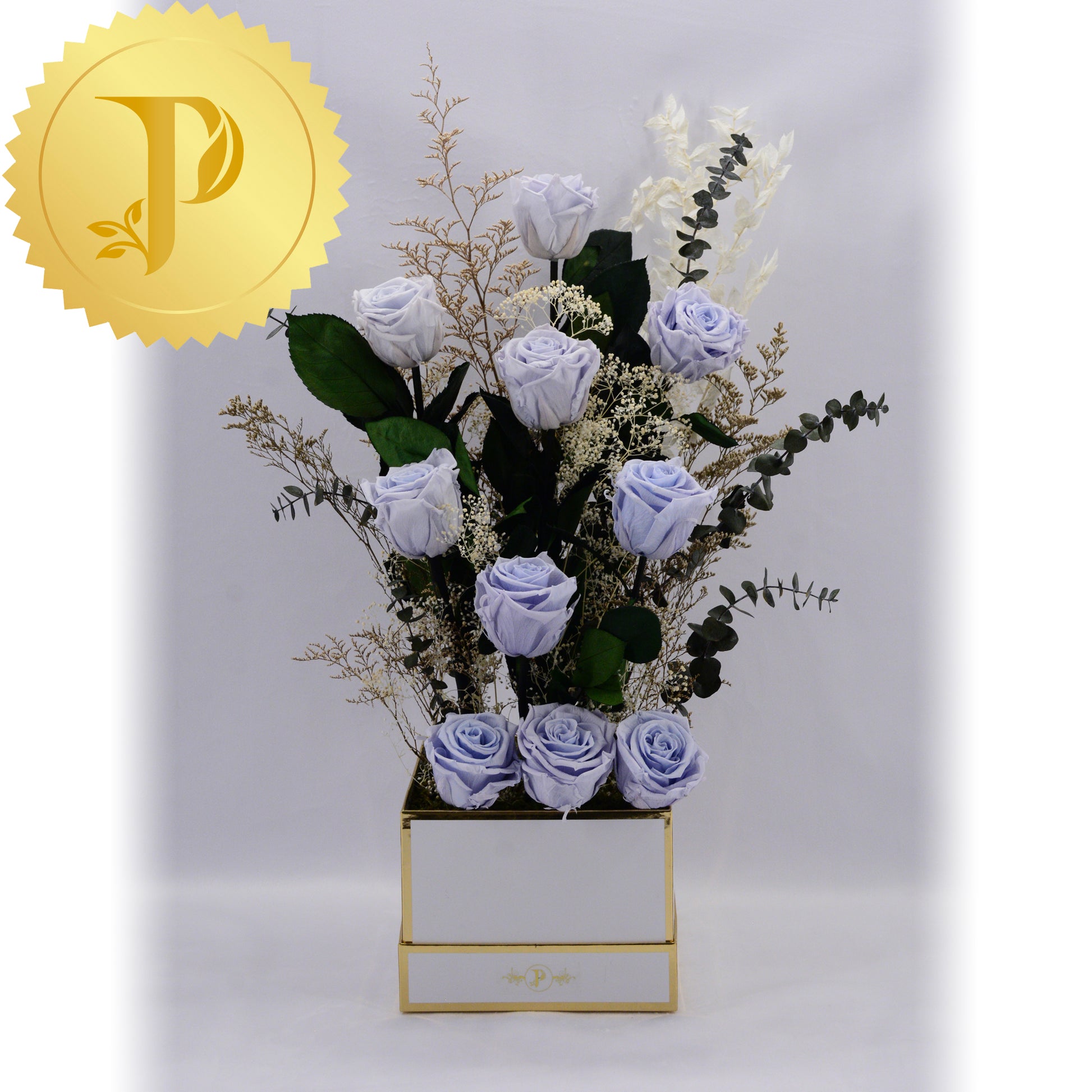 A lovely arrangement of ten lavender roses that evoke a sense of peace. These are elegantly designed and placed in a square white gold trimmed box, with a variety of selected filler to enhance its’ beauty. An expressive tribute for a special occasion.