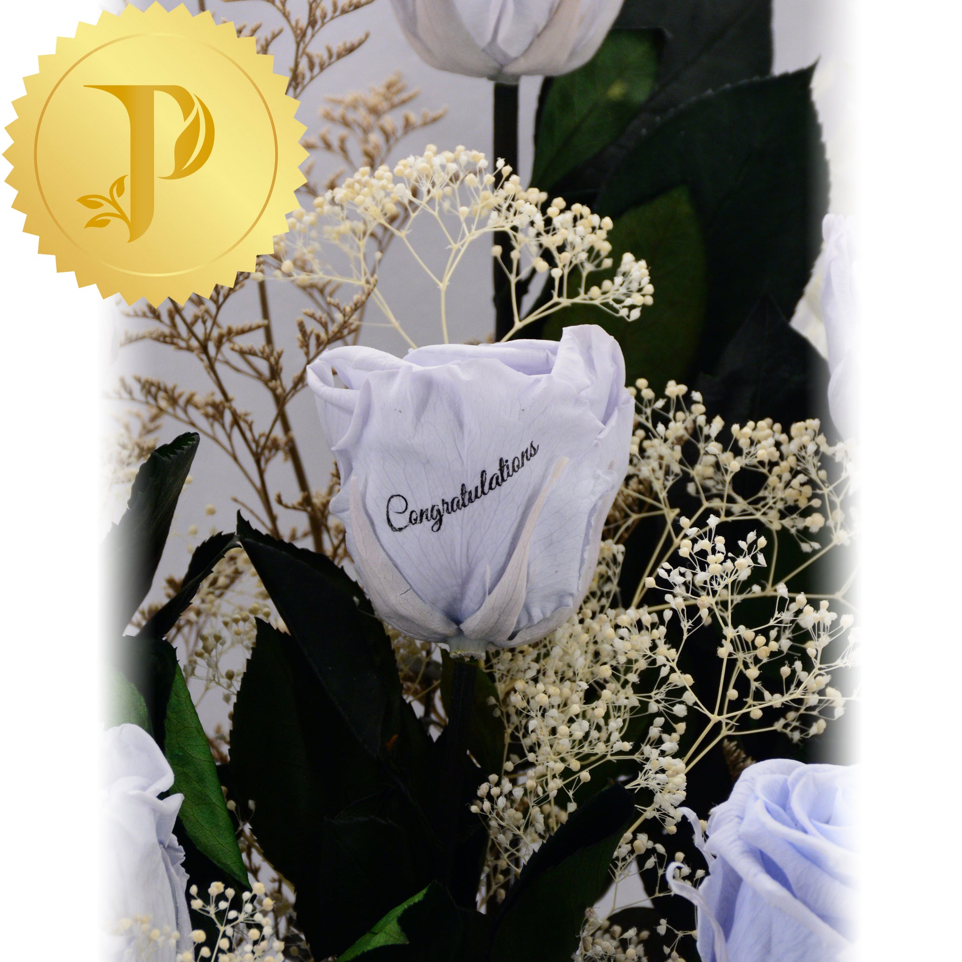 A lovely arrangement of ten lavender roses that evoke a sense of peace. These are elegantly designed and placed in a square white gold trimmed box, with a variety of selected filler to enhance its’ beauty. An expressive tribute for a special occasion that will complement any décor at home or at the workplace.